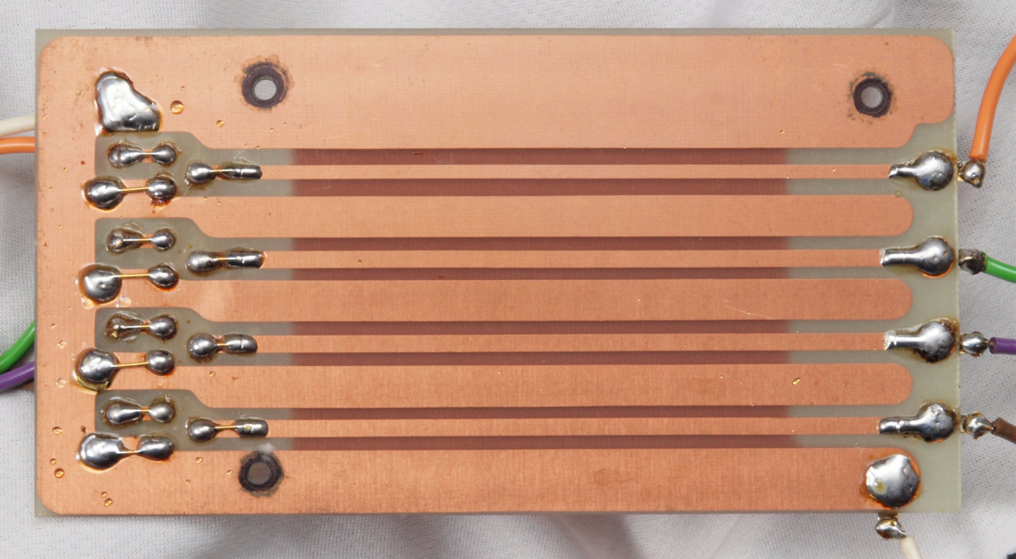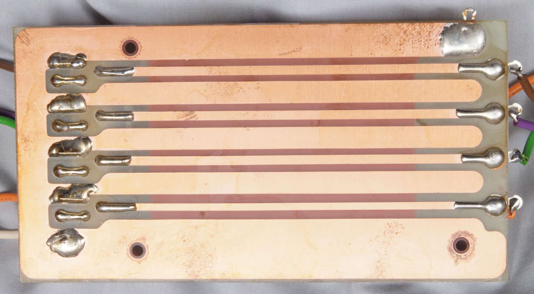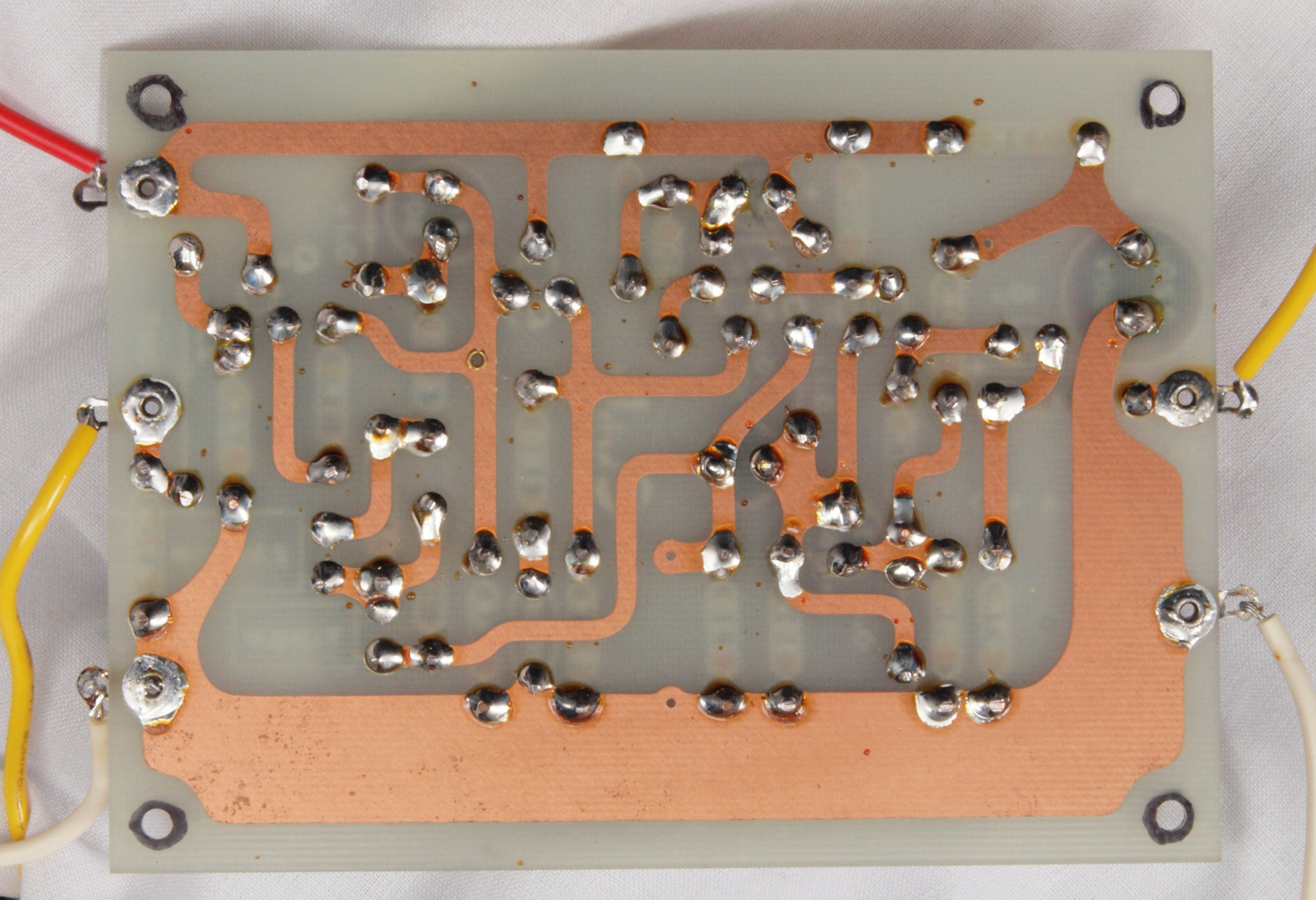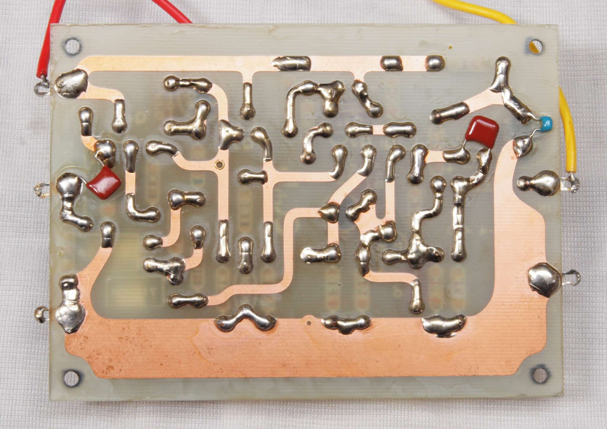 | C44. 修理(半田補正)後 左EQ−AMP基板裏 全ての半田をやり修す。フイルムコンデンサー2個、セラミックコンデンサー1個追加。 | ||||||||||||||||