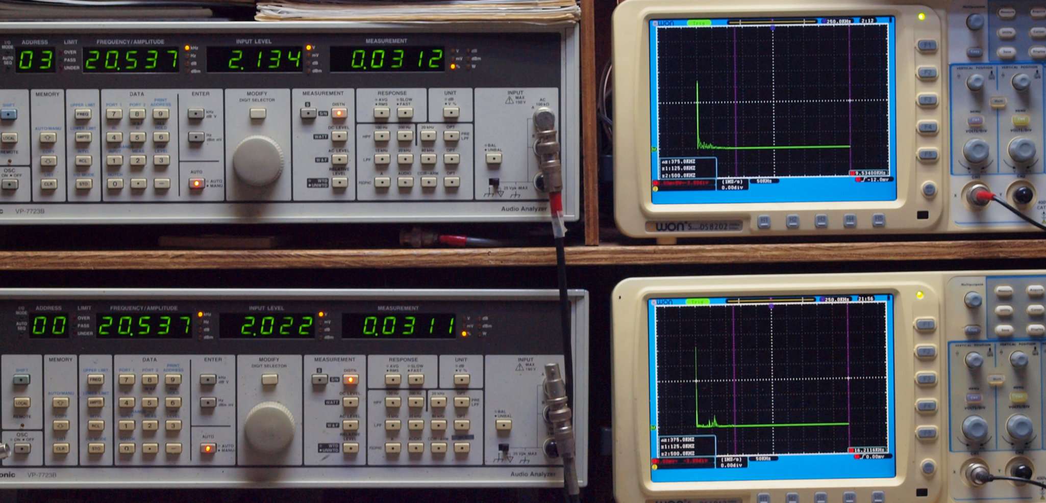 | E. 調整・測定。 画像をクリックすると、大きく(横幅2050ドット)表示されます。 E0. 出力・歪み率測定・調整。 「見方」。 上段中 右側SP出力を「Audio Analyzer Panasonic VP−7723B」により測定。 表示LED、 左端=メモリーNo、 中左=周波数測定、 中右=出力電圧測定、 右端=歪み率測定。 上段右端 VP−7723Bの基本波除去出力を「owon SDS8202(200MHZ)」で「FFT分析」表示。 下段中 左側SP出力を「Audio Analyzer Panasonic VP−7723B」により測定。 表示LED、 左端=メモリーNo、 中左=周波数測定、 中右=出力電圧測定、 右端=歪み率測定。 下段右端 VP−7723Bの本波除去出力を「owon SDS6062(200MHZ)」で「FFT分析」表示。 下段左端 オーディオ発振器 VP−7201A より50Hz〜100kHzの信号を出し(歪み率=約0.003%)、ATT+分配器を通し、AMPに入力。 よって、ダイアル設定出力レベルより低くなります。測定機器の仕様や整備の様子はこちら、「VP−7723B」「VP−7201A」。 FFT画面の見方はこちら。 |