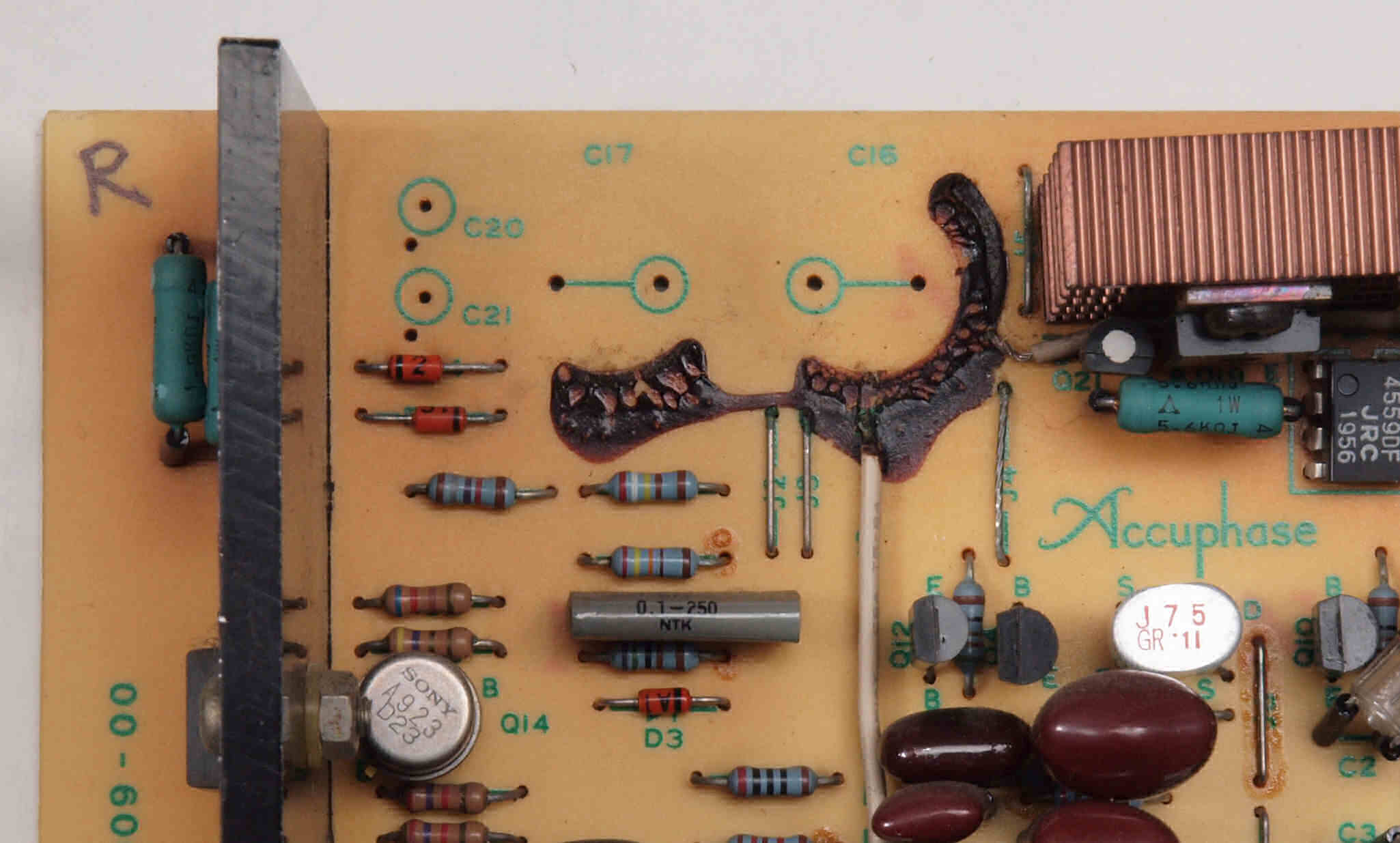 | C43. 修理前 R側出力AMP基板裏 | ||||||||||||||||||||||||||||||||||||||||||||||