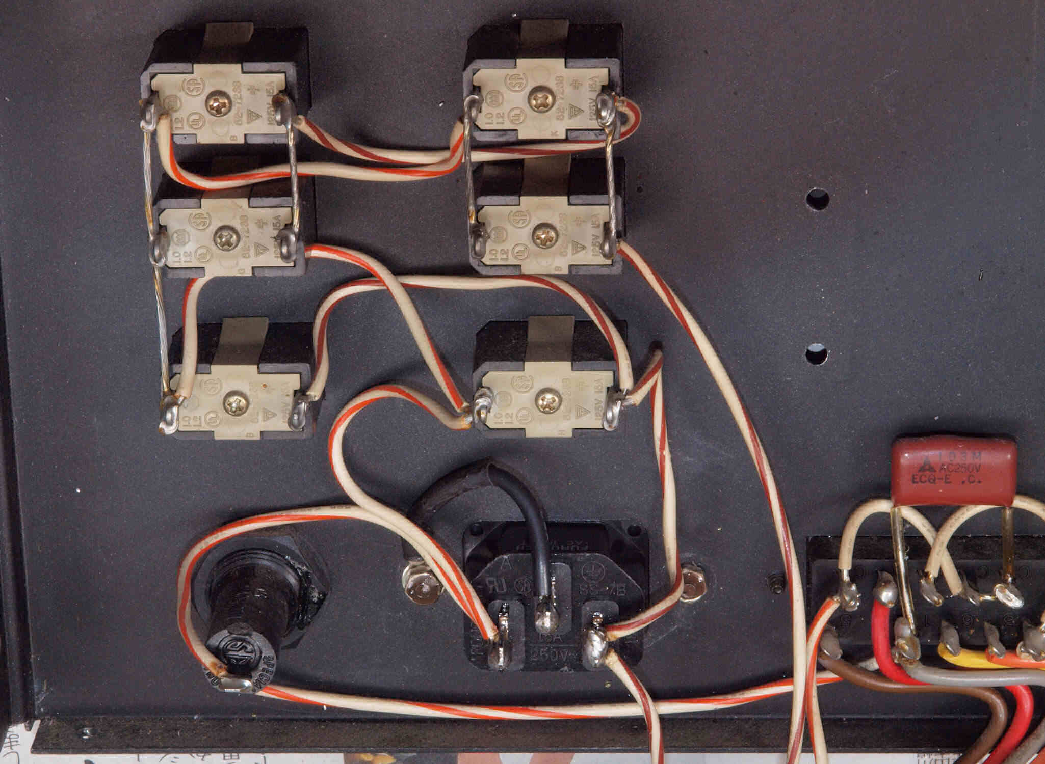 | CC6. 修理(交換)後 前パネル下入出力端子郡裏配線。太く重いケーブルを装着するので、ナットも接着剤で固定する。 | ||||||||||||||||||||||||||||||||||||||||||||||