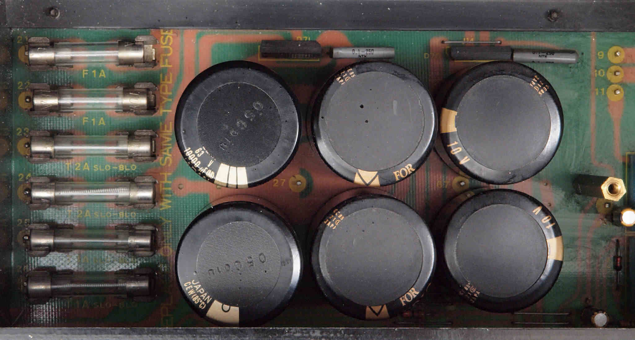 | A51. 点検中 電源ブロック電解コンデンサー比較。 中2個=付いている物 4700μ/35V・2200μ/63V、 左右端=交換する物 10000μ/63V。 |