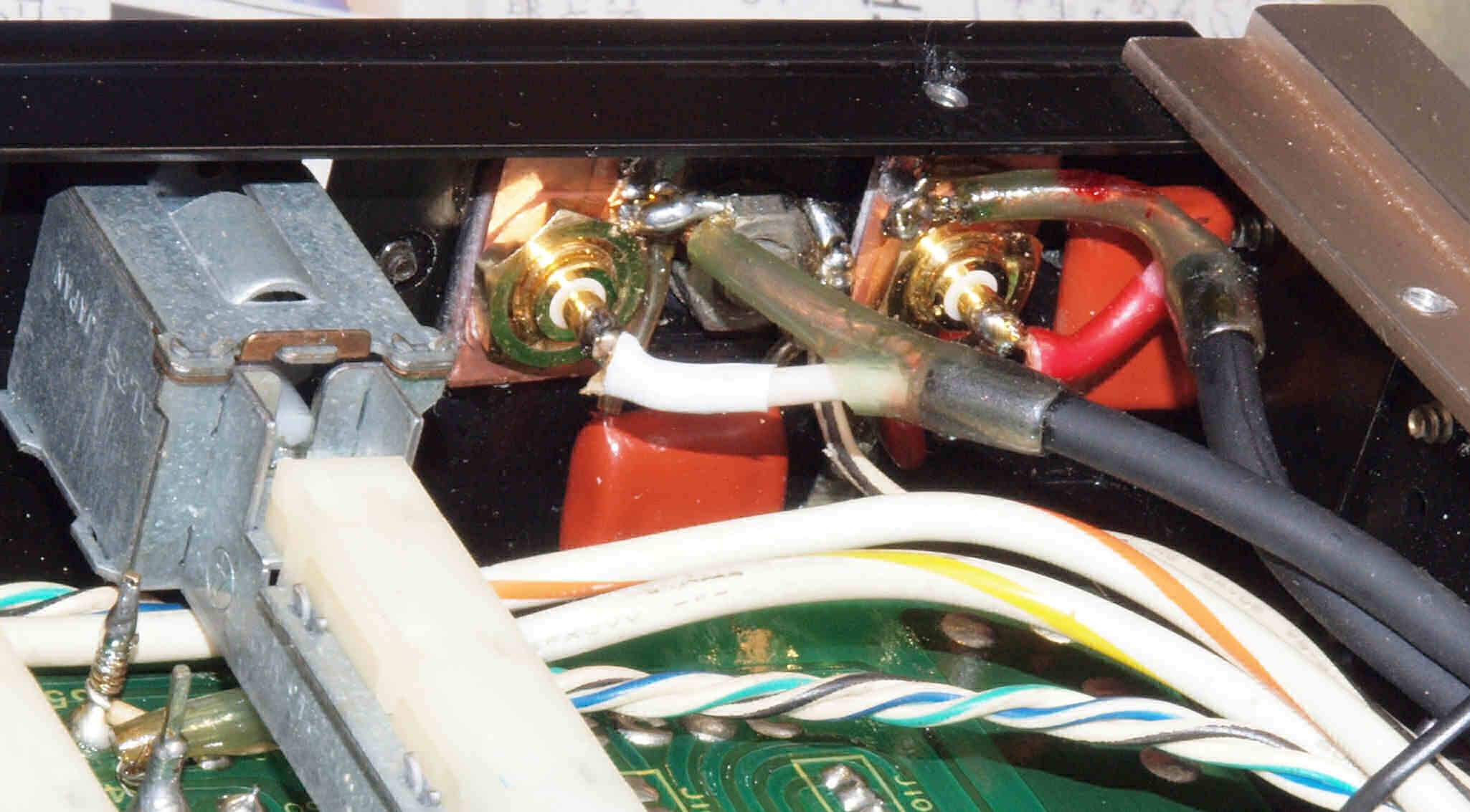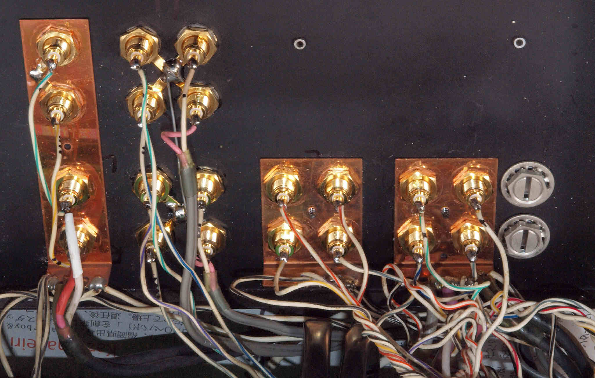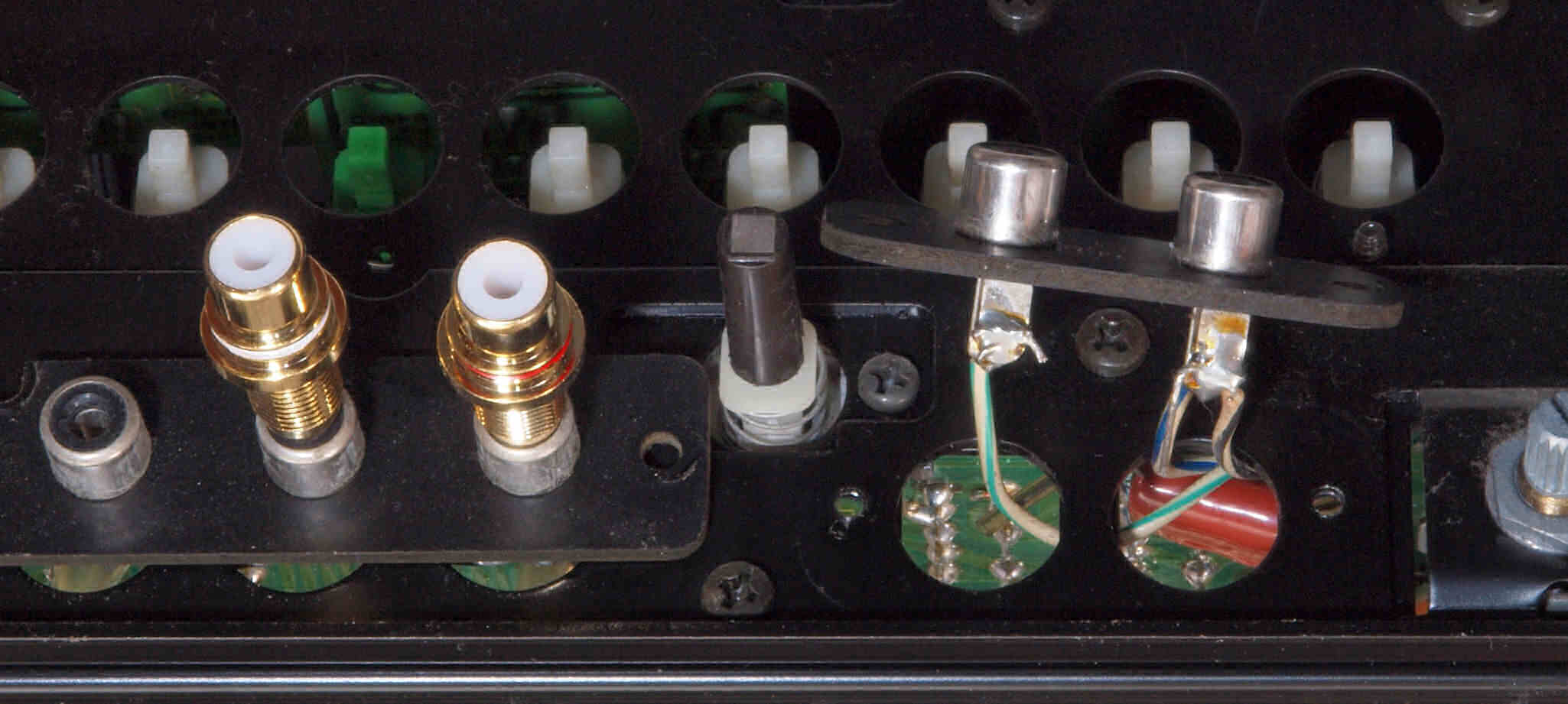 | CC4. 修理(交換)後 前パネル下入出力RCA端子郡。 太く重いケーブルを装着するので、接着剤で固定する。 | ||||||||||||||||||||||||||||||||||||||||||||||