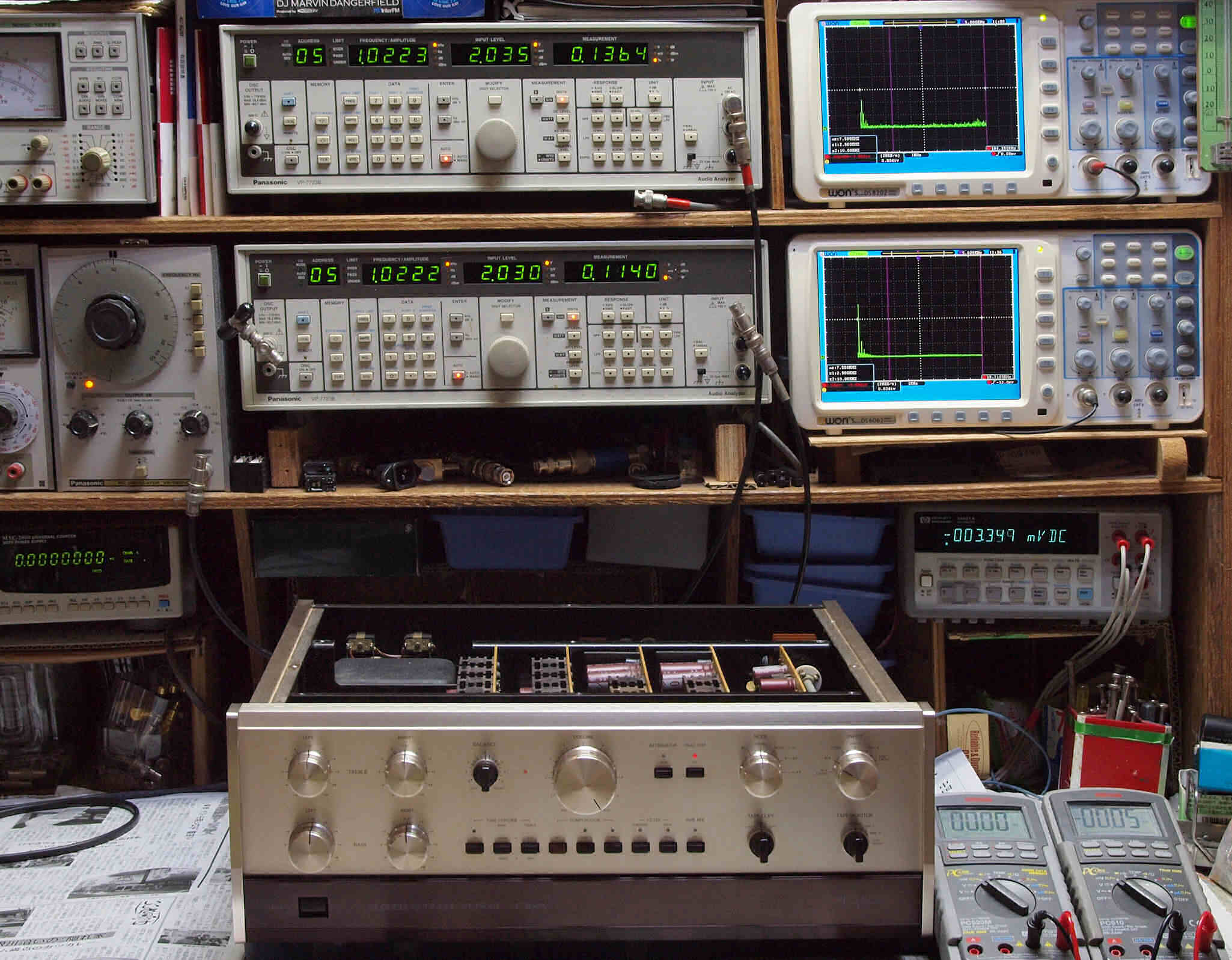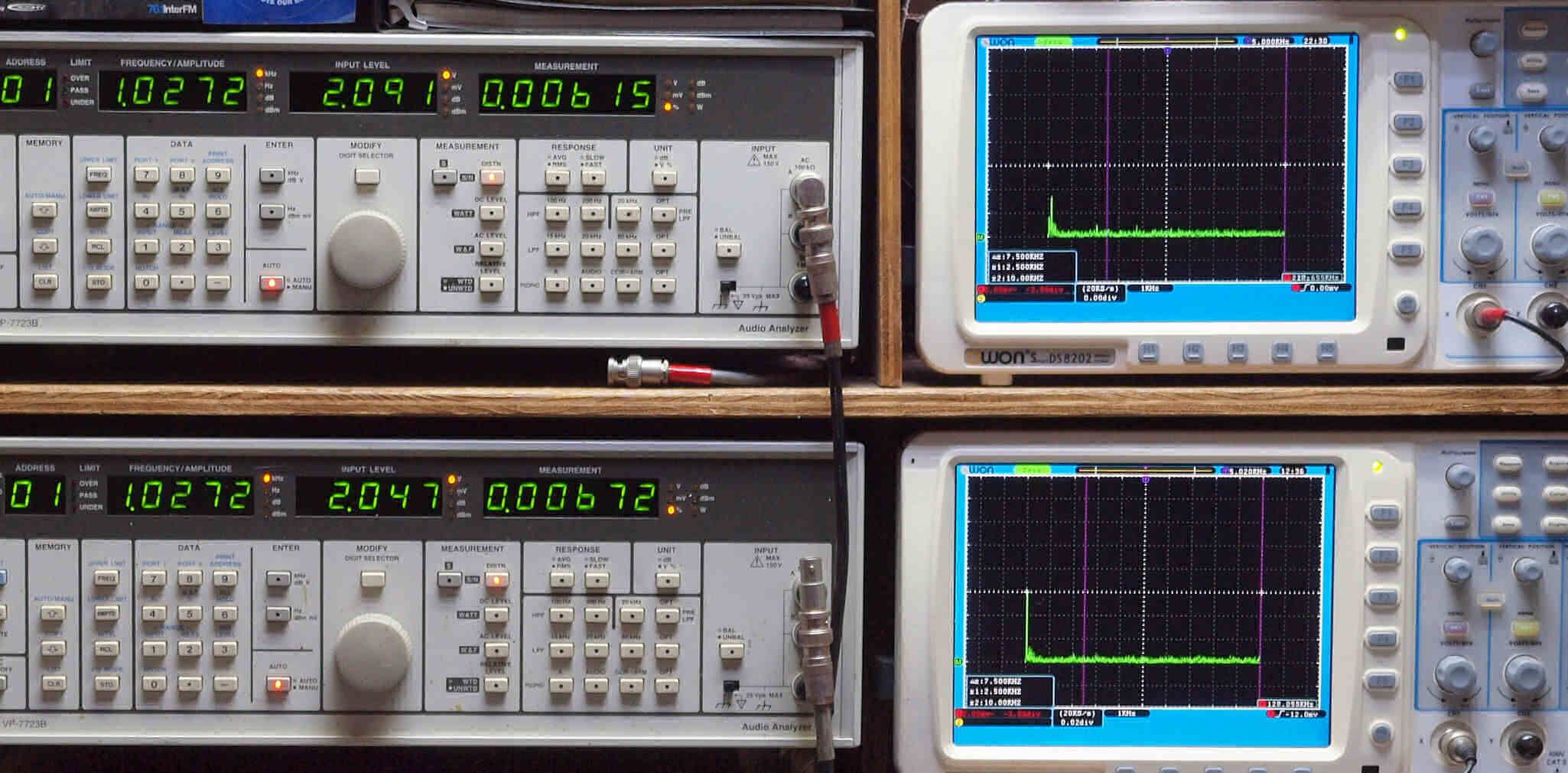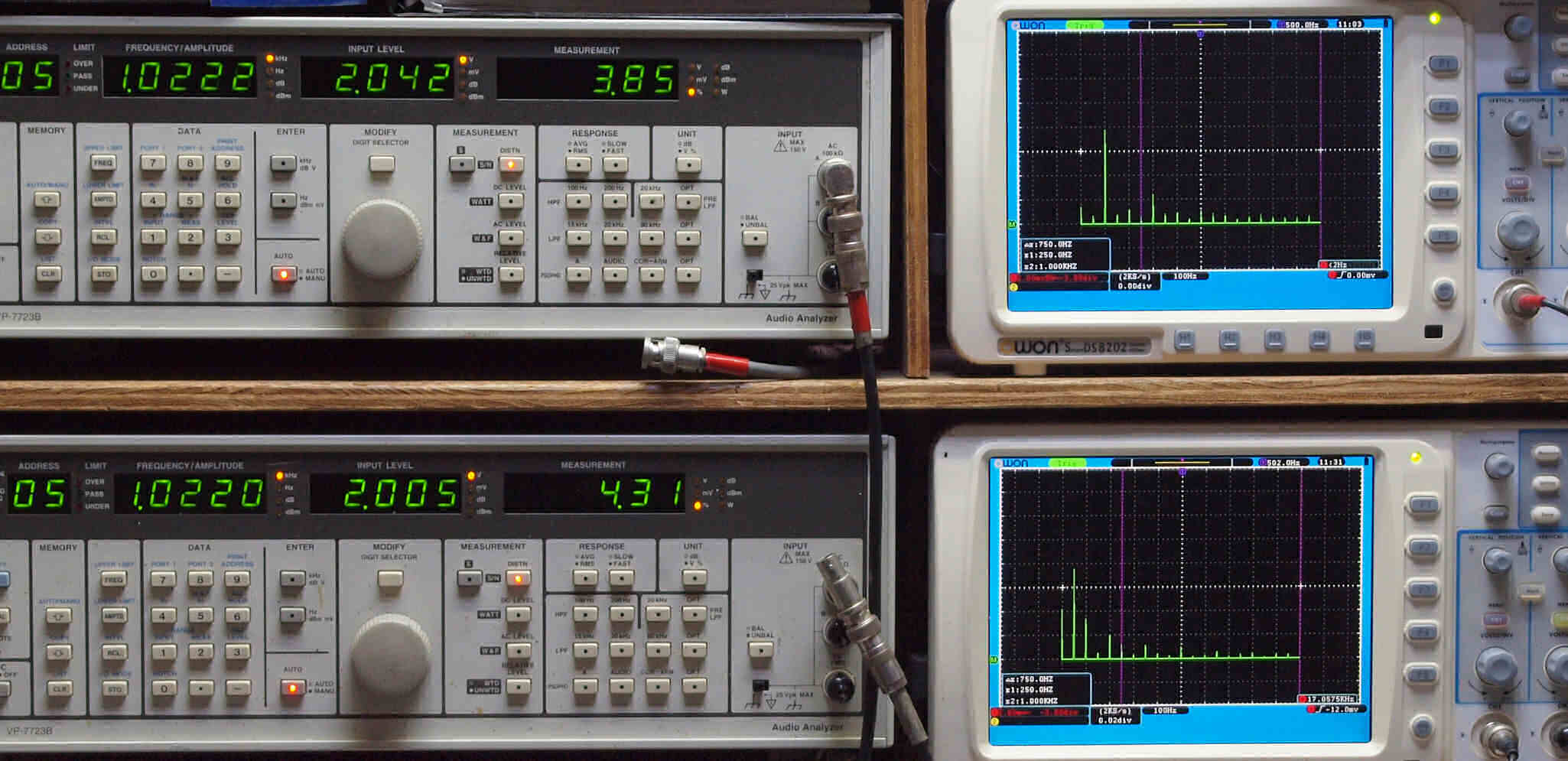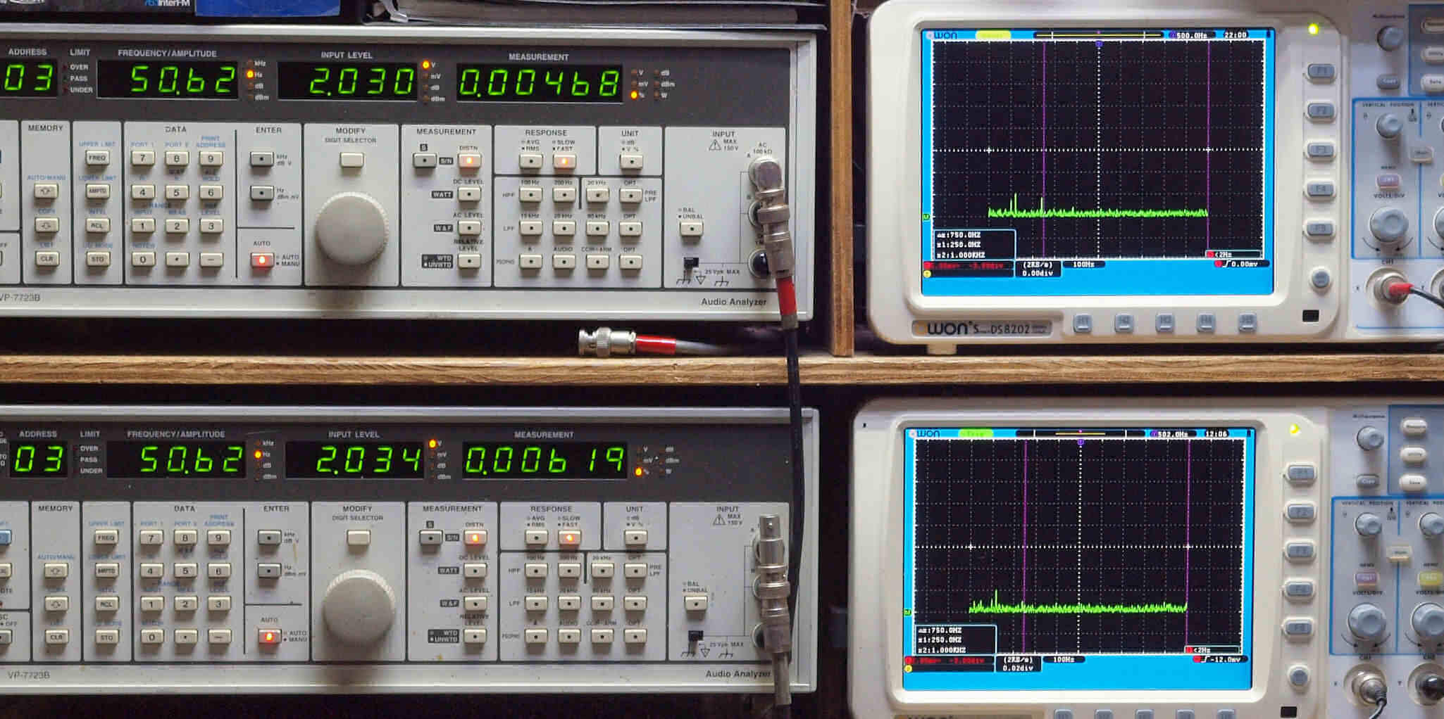 | E. 調整・測定。 画像をクリックすると、大きく(横幅2050ドット)表示されます。 E0. 出力・歪み率測定・調整。AC100V、60HZで測定。 「見方」。 上段中 右側SP出力を「Audio Analyzer Panasonic VP−7723B」により測定。 表示LED、 左端=メモリーNo、 中左=周波数測定、 中右=出力電圧測定、 右端=歪み率測定。 上段右端 VP−7723Bの基本波除去出力を「owon SDS8202(200MHZ)」で「FFT分析」表示。 下段中 左側SP出力を「Audio Analyzer Panasonic VP−7723B」により測定。 表示LED、 左端=メモリーNo、 中左=周波数測定、 中右=出力電圧測定、 右端=歪み率測定。 下段右端 VP−7723Bの基本波除去出力を「owon SDS6062(200MHZ)」で「FFT分析」表示。 下段左端 オーディオ発振器 VP−7201A より50Hz〜100kHzの信号を出し(歪み率=約0.003%)、ATT+分配器を通し、AMPに入力。 よって、ダイアル設定出力レベルより低くなります。測定機器の仕様や整備の様子はこちら、「VP−7723B」「VP−7201A」。 FFT画面の見方はこちら。 左下は定周波数・定電圧交流電源CVFT1-200H. 4台目 |