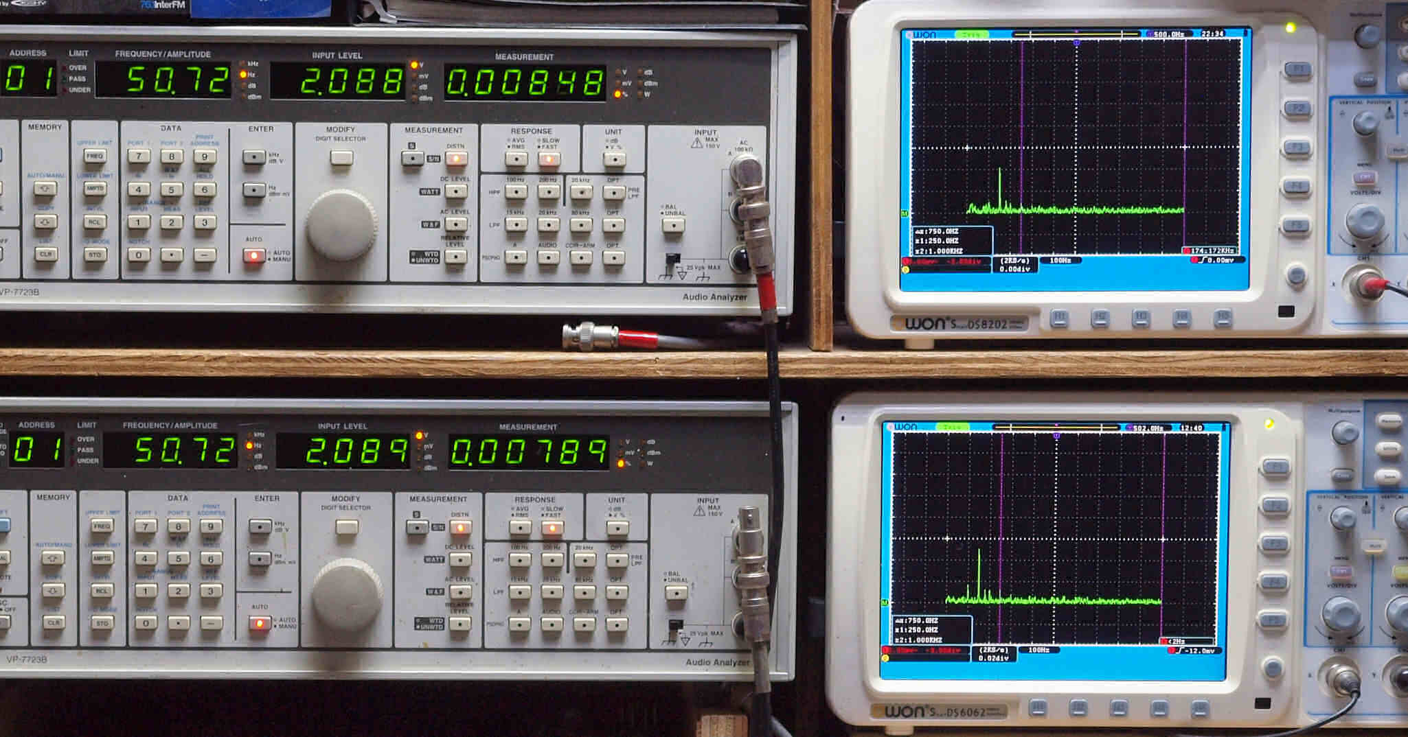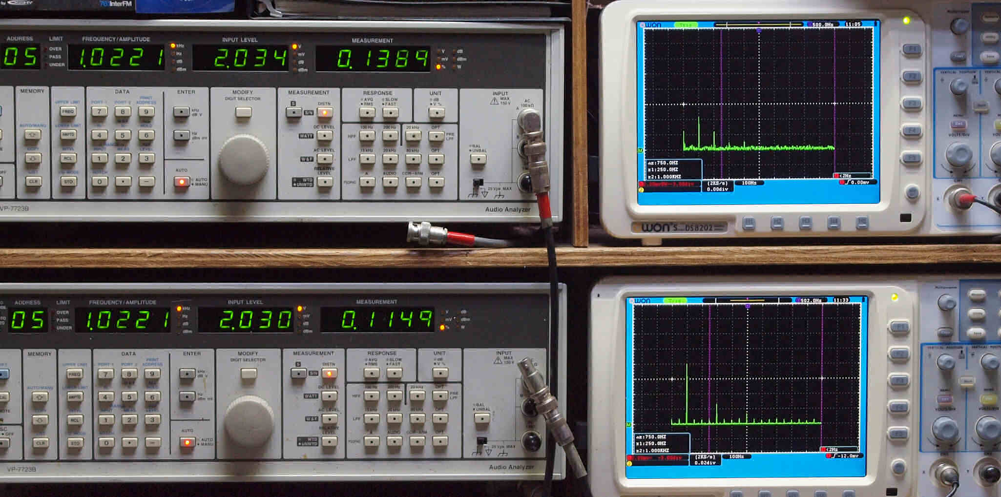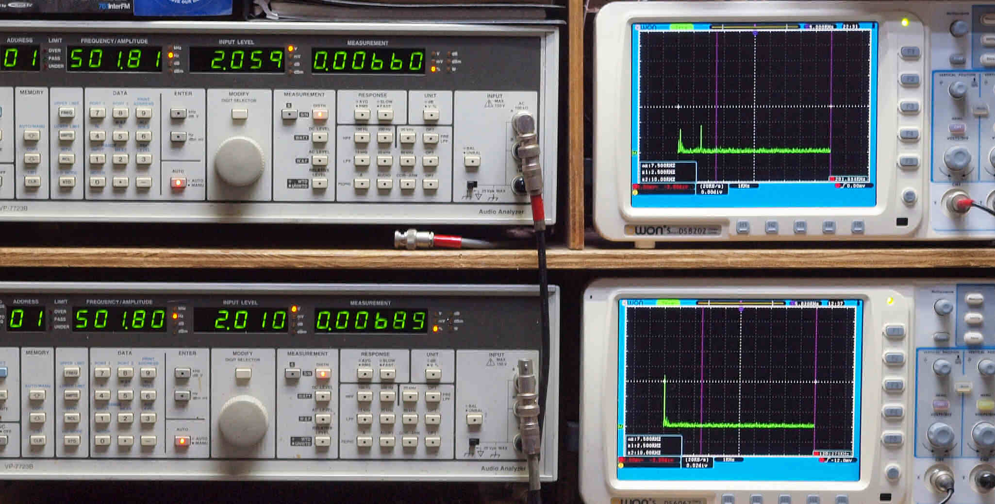 | E. 調整・測定。 画像をクリックすると、大きく(横幅2050ドット)表示されます。 E0. 出力・歪み率測定・調整。AC100V、60HZで測定。 「見方」。 上段中 右側SP出力を「Audio Analyzer Panasonic VP−7723B」により測定。 表示LED、 左端=メモリーNo、 中左=周波数測定、 中右=出力電圧測定、 右端=歪み率測定。 上段右端 VP−7723Bの基本波除去出力を「owon SDS8202(200MHZ)」で「FFT分析」表示。 下段中 左側SP出力を「Audio Analyzer Panasonic VP−7723B」により測定。 表示LED、 左端=メモリーNo、 中左=周波数測定、 中右=出力電圧測定、 右端=歪み率測定。 下段右端 VP−7723Bの基本波除去出力を「owon SDS6062(200MHZ)」で「FFT分析」表示。 下段左端 オーディオ発振器 VP−7201A より50Hz〜100kHzの信号を出し(歪み率=約0.003%)、ATT+分配器を通し、AMPに入力。 よって、ダイアル設定出力レベルより低くなります。測定機器の仕様や整備の様子はこちら、「VP−7723B」「VP−7201A」。 FFT画面の見方はこちら。 左下は定周波数・定電圧交流電源CVFT1-200H. 4台目 |