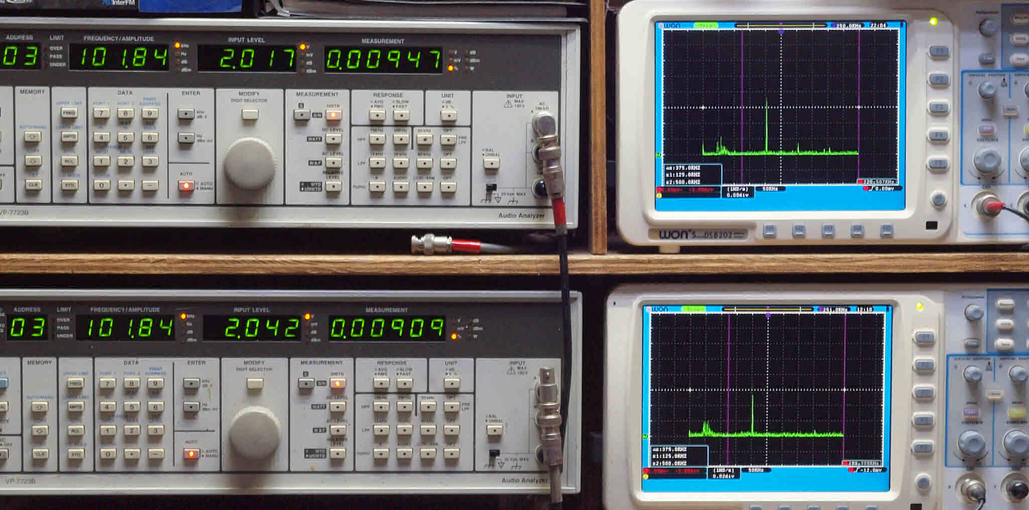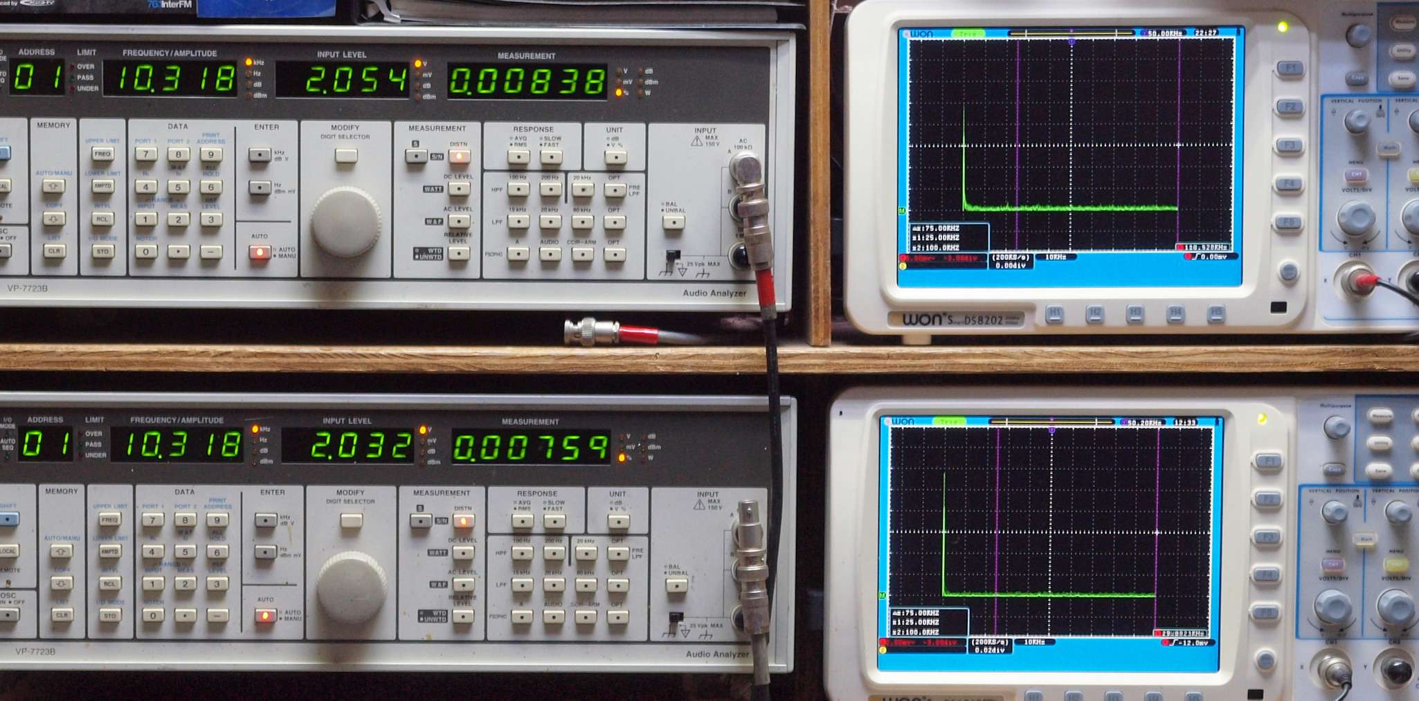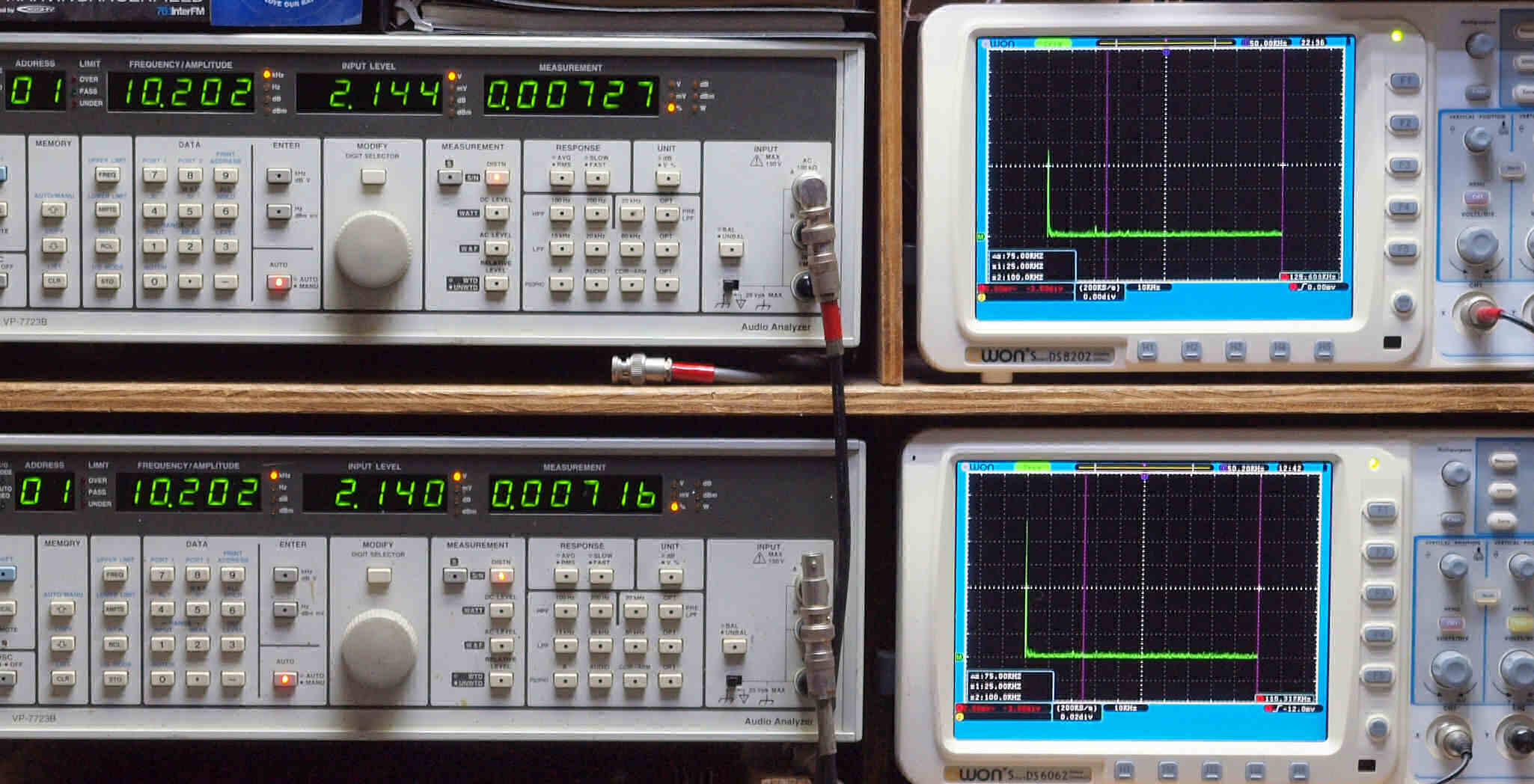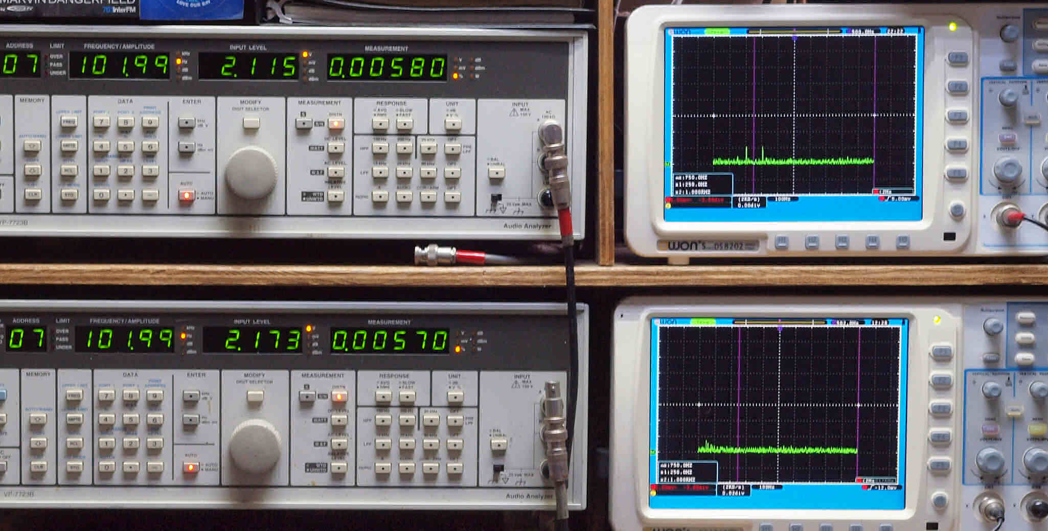 | E. 調整・測定。 画像をクリックすると、大きく(横幅2050ドット)表示されます。 E0. 出力・歪み率測定・調整。AC100V、60HZで測定。 「見方」。 上段中 右側SP出力を「Audio Analyzer Panasonic VP−7723B」により測定。 表示LED、 左端=メモリーNo、 中左=周波数測定、 中右=出力電圧測定、 右端=歪み率測定。 上段右端 VP−7723Bの基本波除去出力を「owon SDS8202(200MHZ)」で「FFT分析」表示。 下段中 左側SP出力を「Audio Analyzer Panasonic VP−7723B」により測定。 表示LED、 左端=メモリーNo、 中左=周波数測定、 中右=出力電圧測定、 右端=歪み率測定。 下段右端 VP−7723Bの基本波除去出力を「owon SDS6062(200MHZ)」で「FFT分析」表示。 下段左端 オーディオ発振器 VP−7201A より50Hz〜100kHzの信号を出し(歪み率=約0.003%)、ATT+分配器を通し、AMPに入力。 よって、ダイアル設定出力レベルより低くなります。測定機器の仕様や整備の様子はこちら、「VP−7723B」「VP−7201A」。 FFT画面の見方はこちら。 左下は定周波数・定電圧交流電源CVFT1-200H. 4台目 |