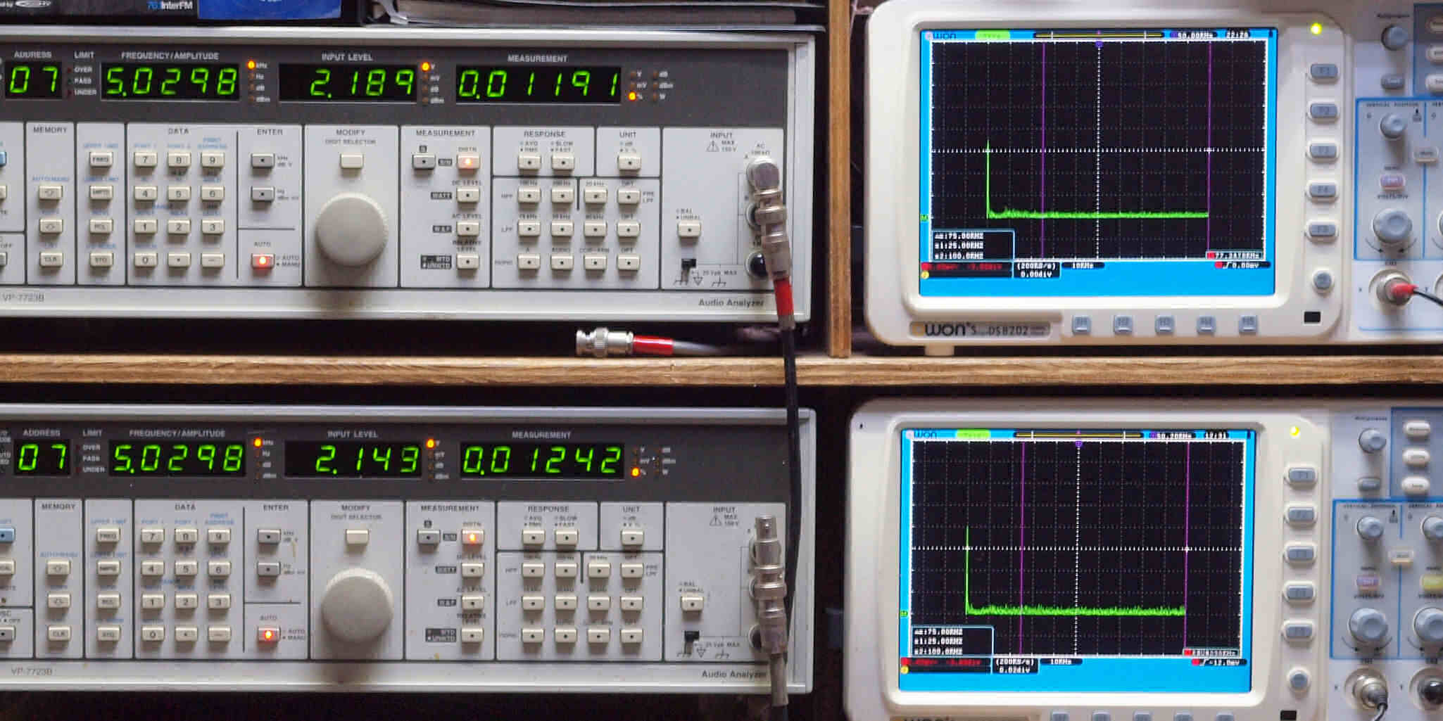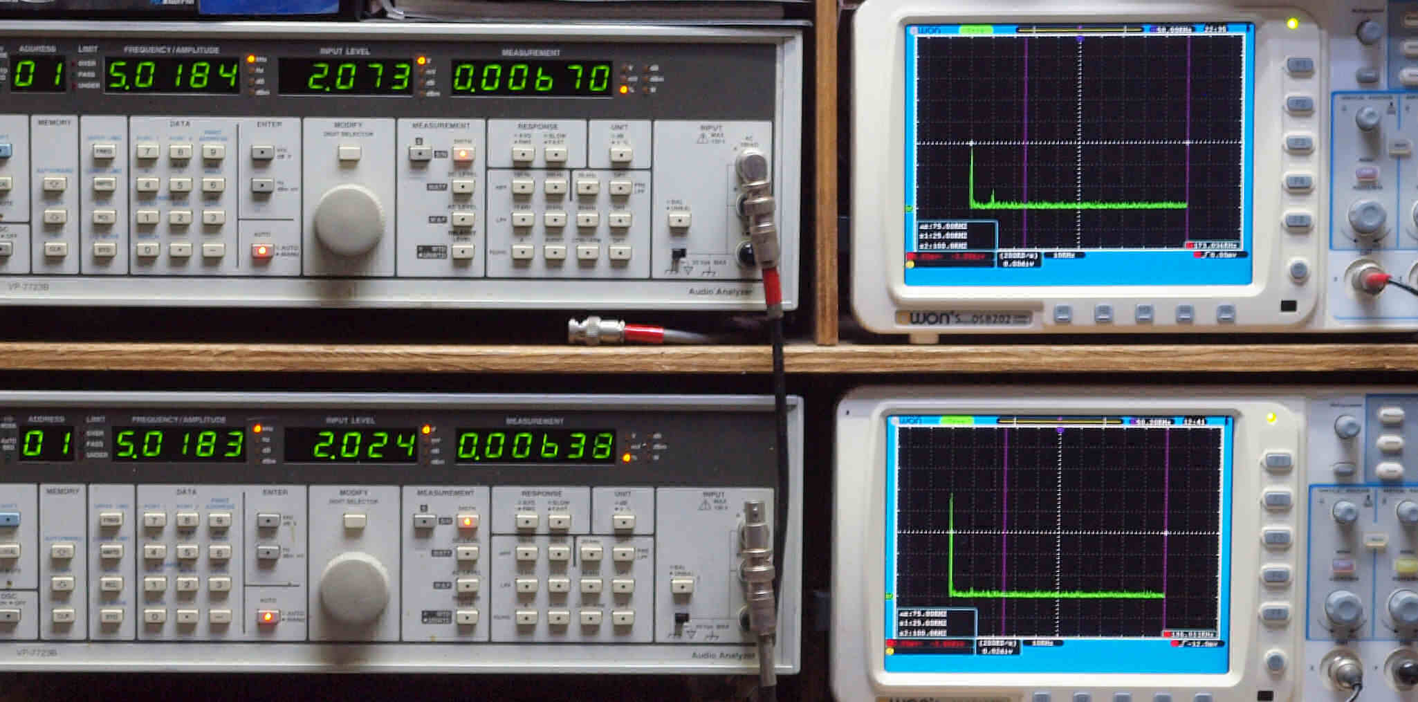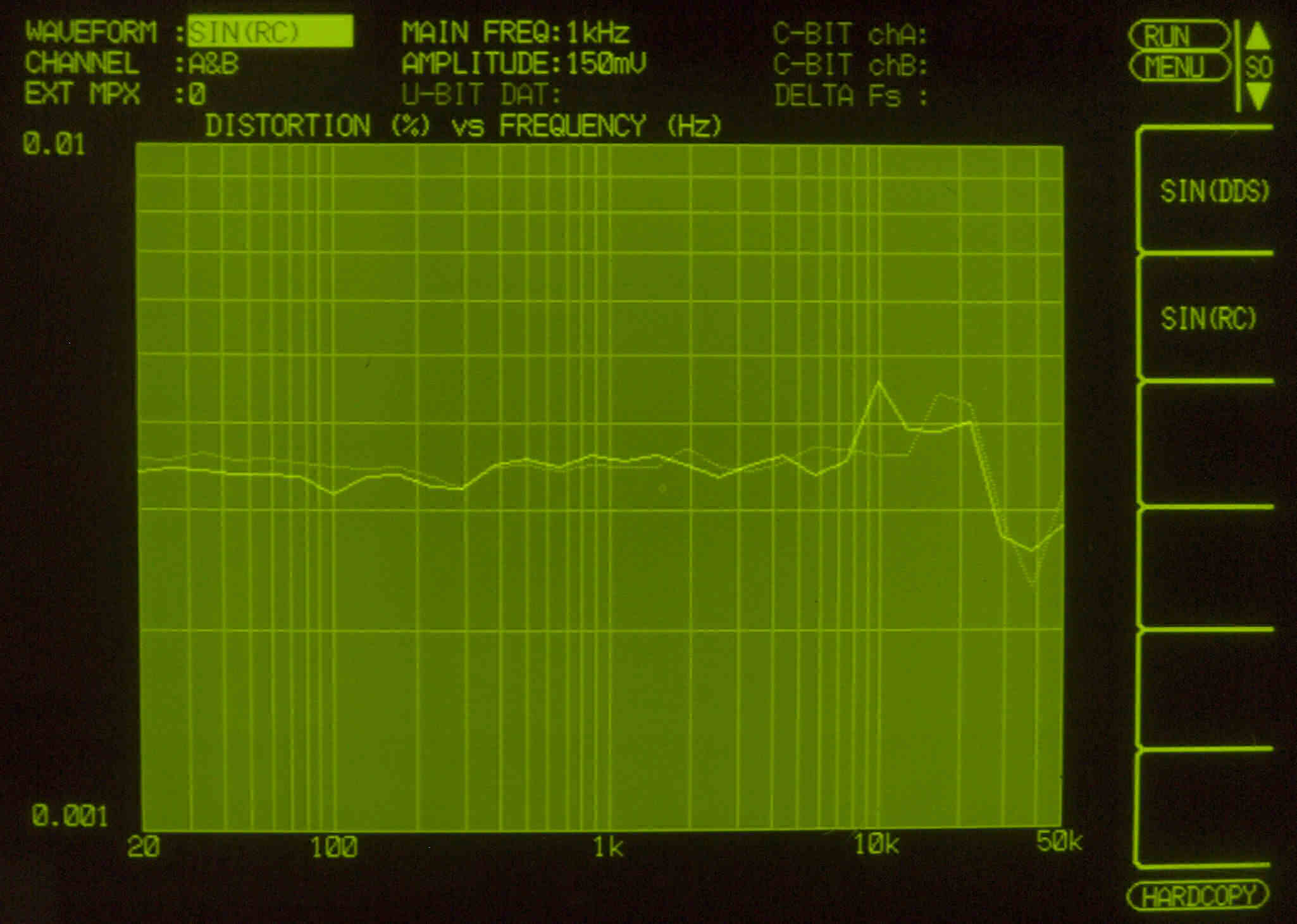 | E25. MM、5kHz入力=R側出力電圧2V、 0.01191%歪み。 L側出力電圧2V、 0.01242%歪み。 「FFT分析」のオシロのカーソル周波数、左=25kHz、右=100kHz。 |