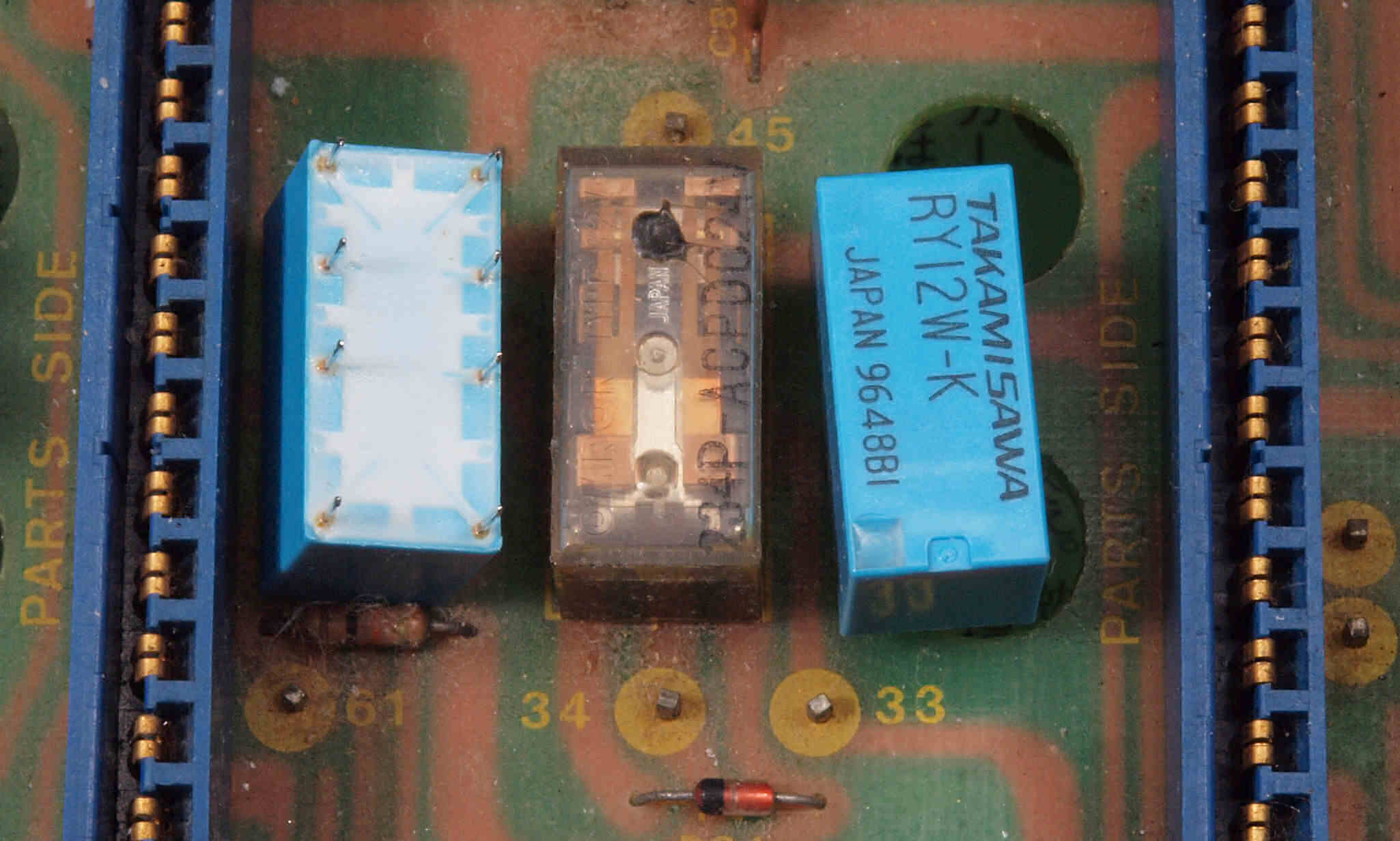 | A61. 点検中 制御リレー比較。 中=付いている開放型、 左右=交換する密閉型(窒素ガス封入)。 | ||||||||||||||||||||||||||||||||||||||||||||||