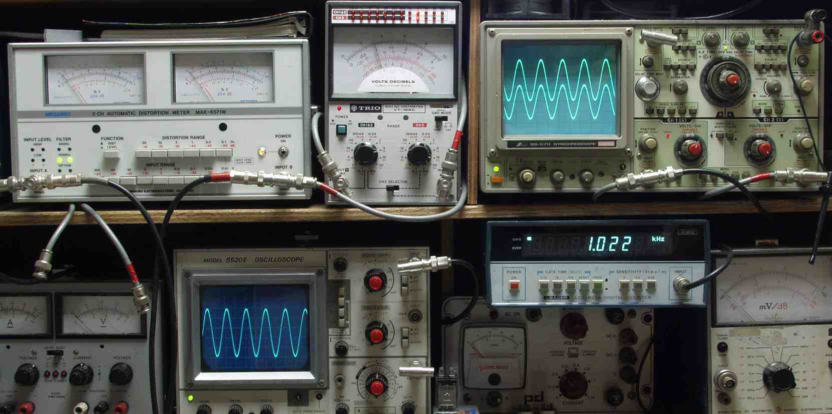 | E. 調整・測定 E1. 出力・歪み率測定 <見方> 上左オーディオ発振器より400HZ・1KHZの信号を出す(歪み率=約0.003%) 下中=入力波形(オーディオ発振器のTTLレベル) 下右=周波数計 上左=SP出力の歪み率測定 左メータ=L出力、右メータ=R出力 上中=SP出力電圧測定器、赤針=R出力、黒針=L出力 上右=SP出力波形オシロ 上=R出力、下=L出力(出力電圧測定器の出力) |