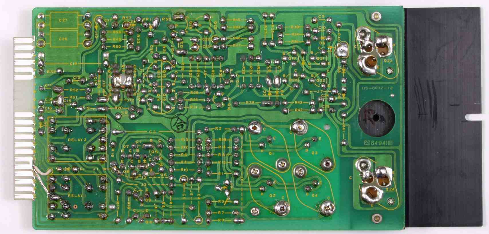 | C3B. 修理後 L側−AMP基板裏 電解コンデンサー4個、半固定VR2個、フイルムコンデンサー2個交換 リレー2個交換 電解コンデンサー2個追加 |