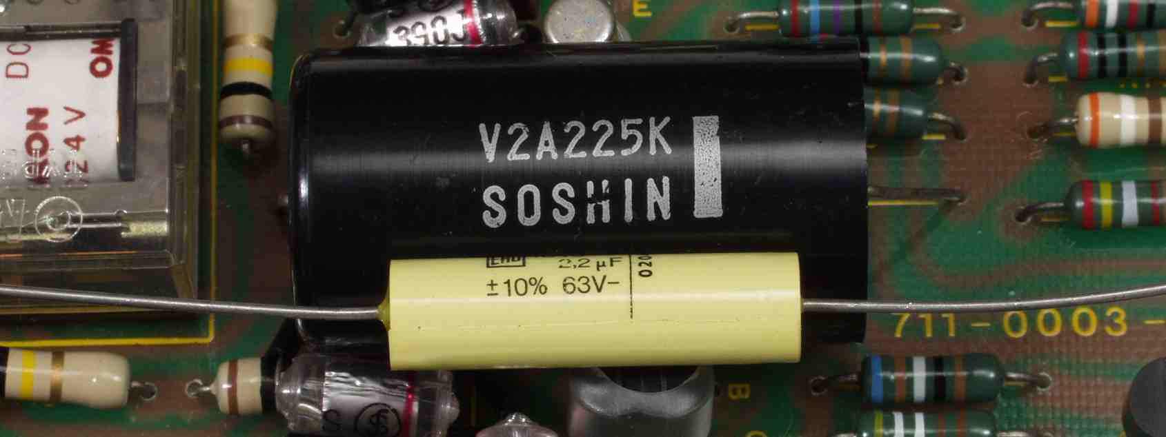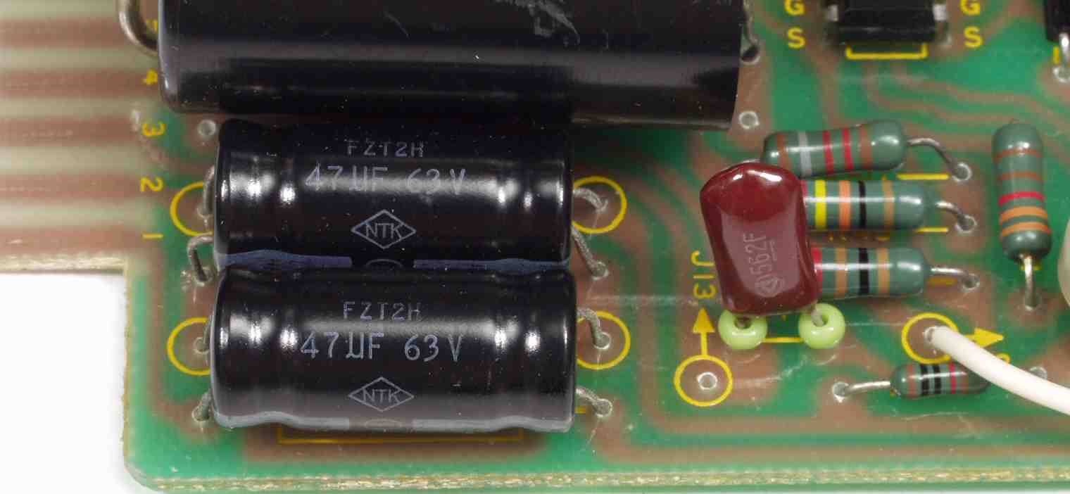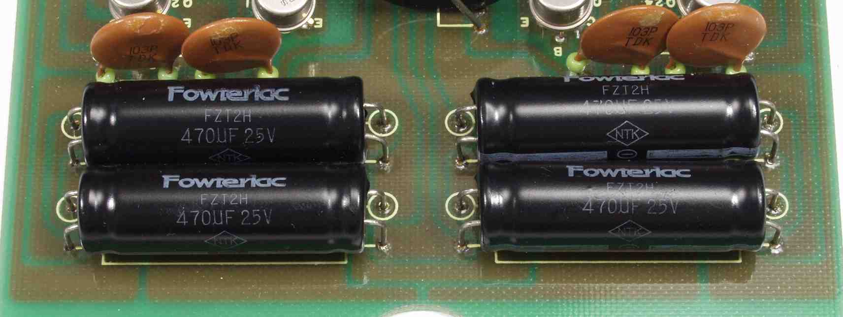 | A9. 点検中 R側・L側−AMP基板のフイルムコンデンサーと現在の同容量フイルムコンデンサー マニアの間では奪い合いの様子ですが、経年変化には勝てない詳しくはこちら |