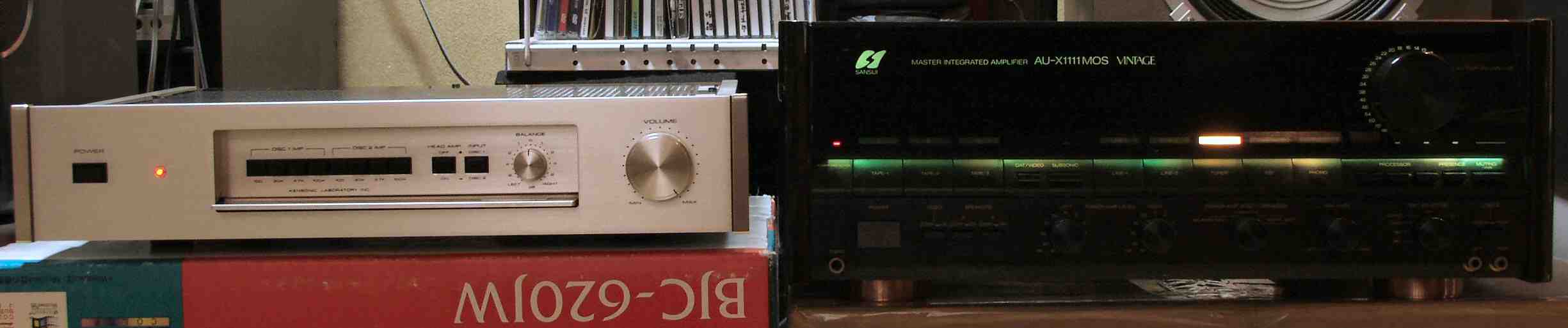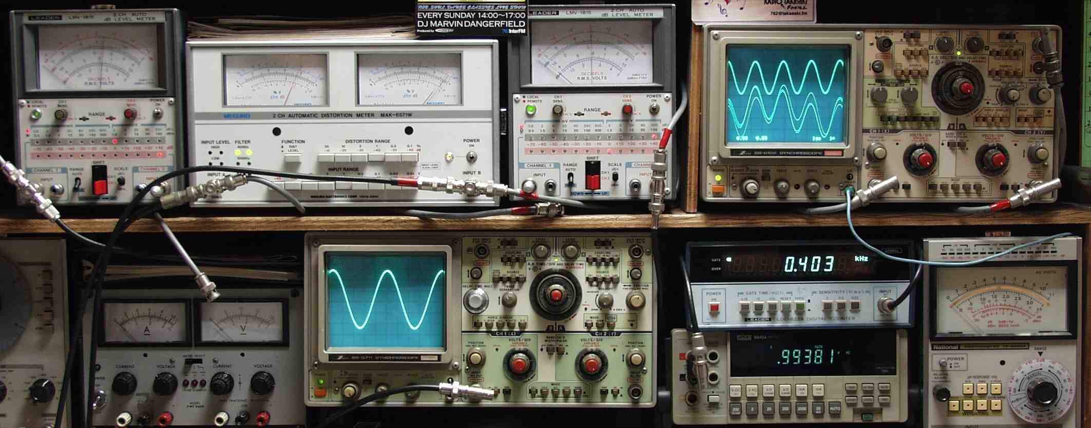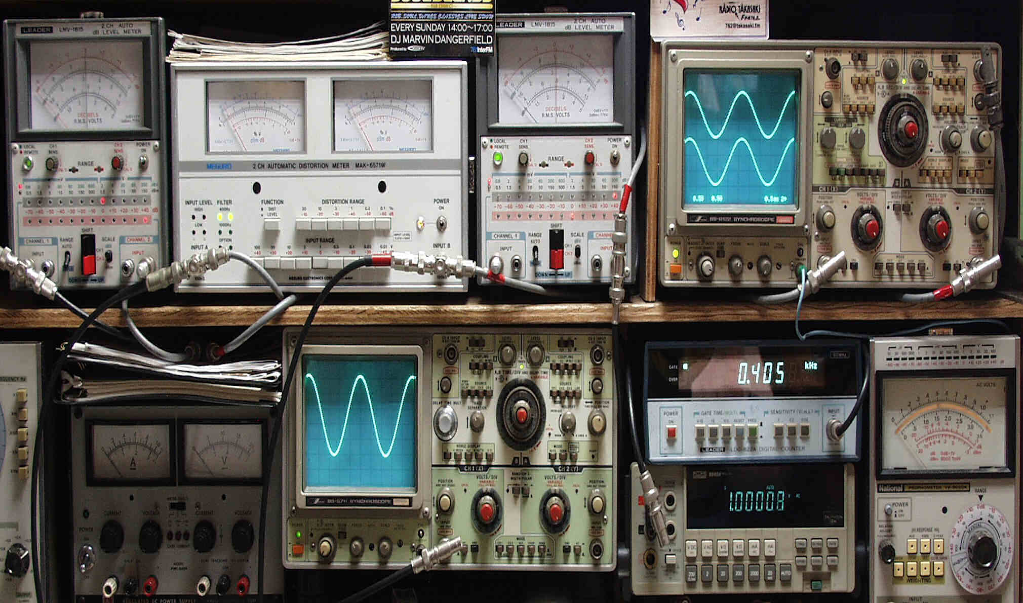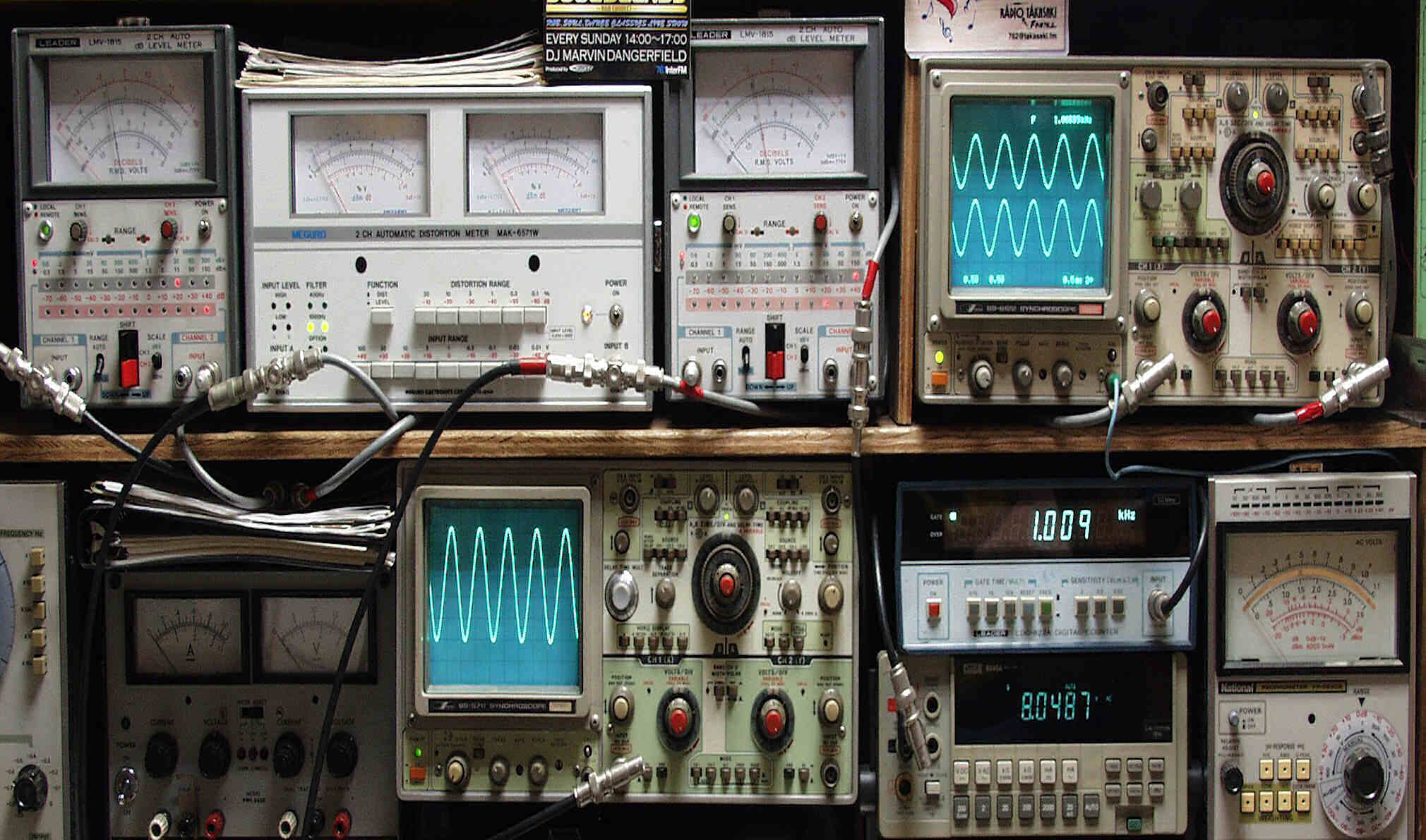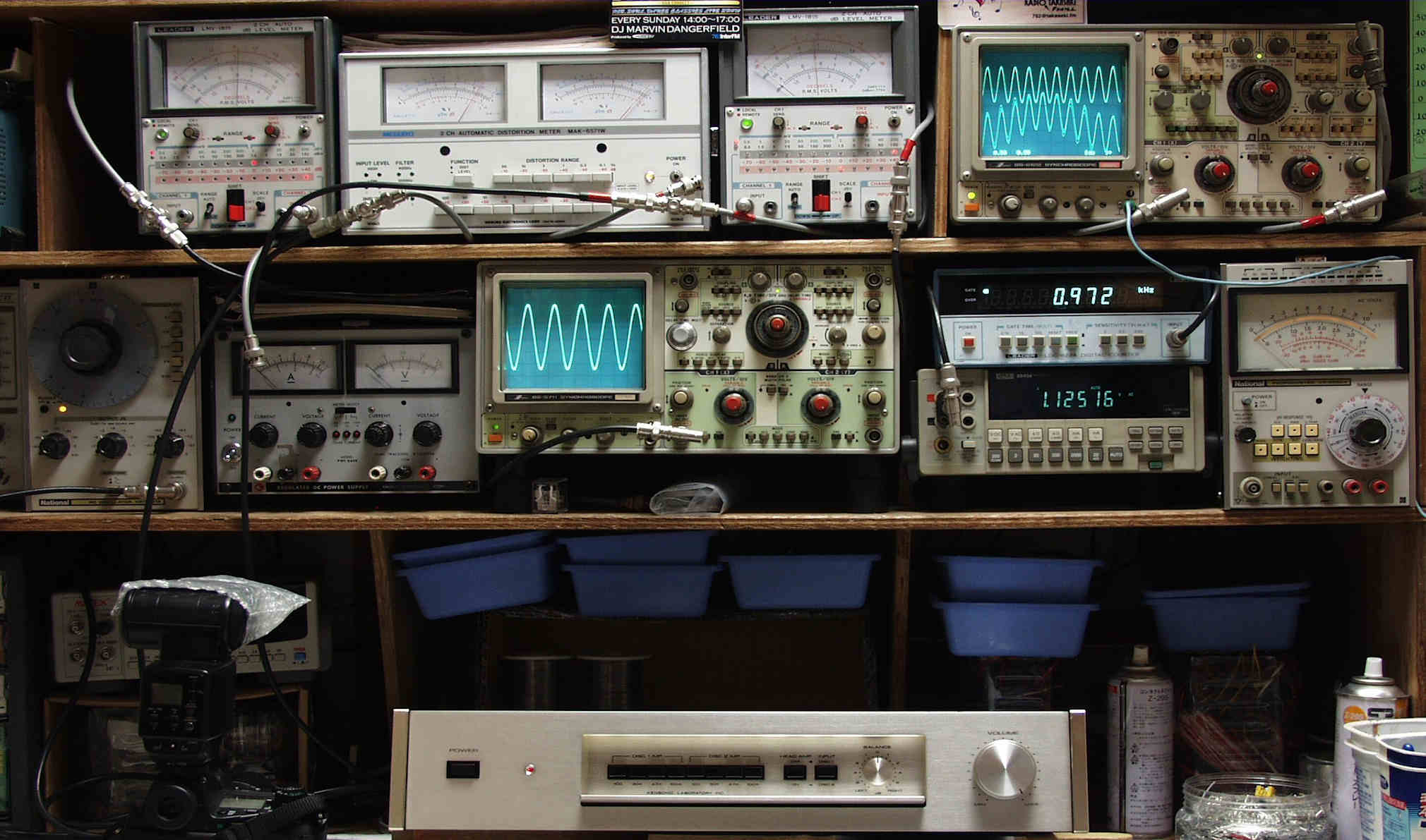 | AA. 修理前・測定 E1. 出力・歪み率測定・調整 <見方> 下段左端 オーデオ発振器より400HZ・1KHZの信号を出し(歪み率=約0.003%)これをAMPに入力し、出力を測定 下段中左 オシロ=入力波形(オーデオ発振器のTTLレベル) 下段中右上=周波数計 上段左端 電圧計=L側出力電圧測定、黒針のみ使用 上段中左 歪み率計=出力の歪み率測定 左メータ=L出力、右メータ=R出力 上段中右 電圧計=R側出力電圧測定、赤針のみ使用 上段右端 オシロ=出力波形 上=R出力、下=L出力(実際にはRL電圧計の出力「Max1V」を観測) 下段中右上 デジタル電圧計=出力電圧測定RLは切り替えて測定 |