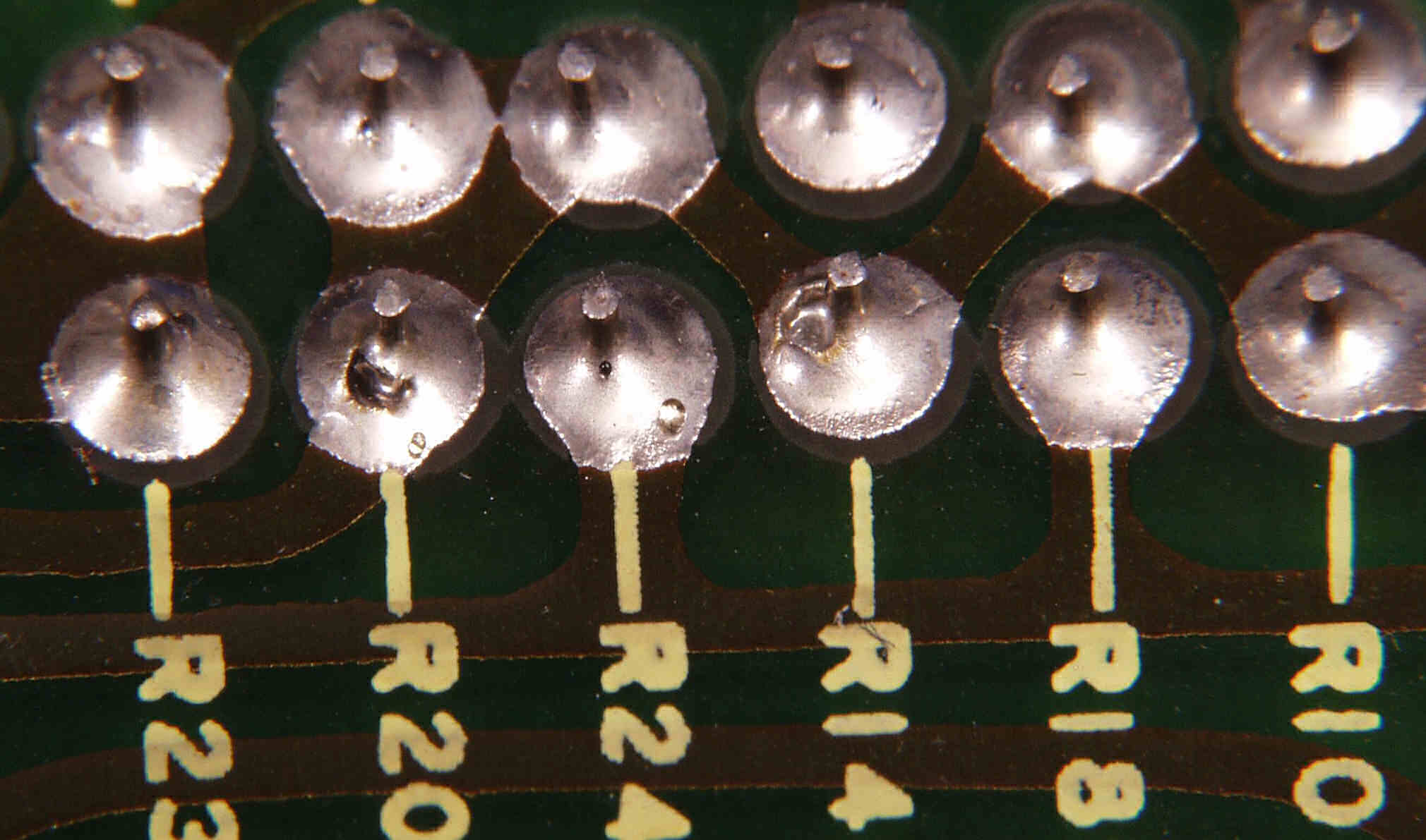 | C6C1. 修理前 電源基板裏 半田どぶ付けの時間が短く、フラックス等の蒸気で半田に穴が空いている | ||||||||||||||||||||||||||||||||||||||