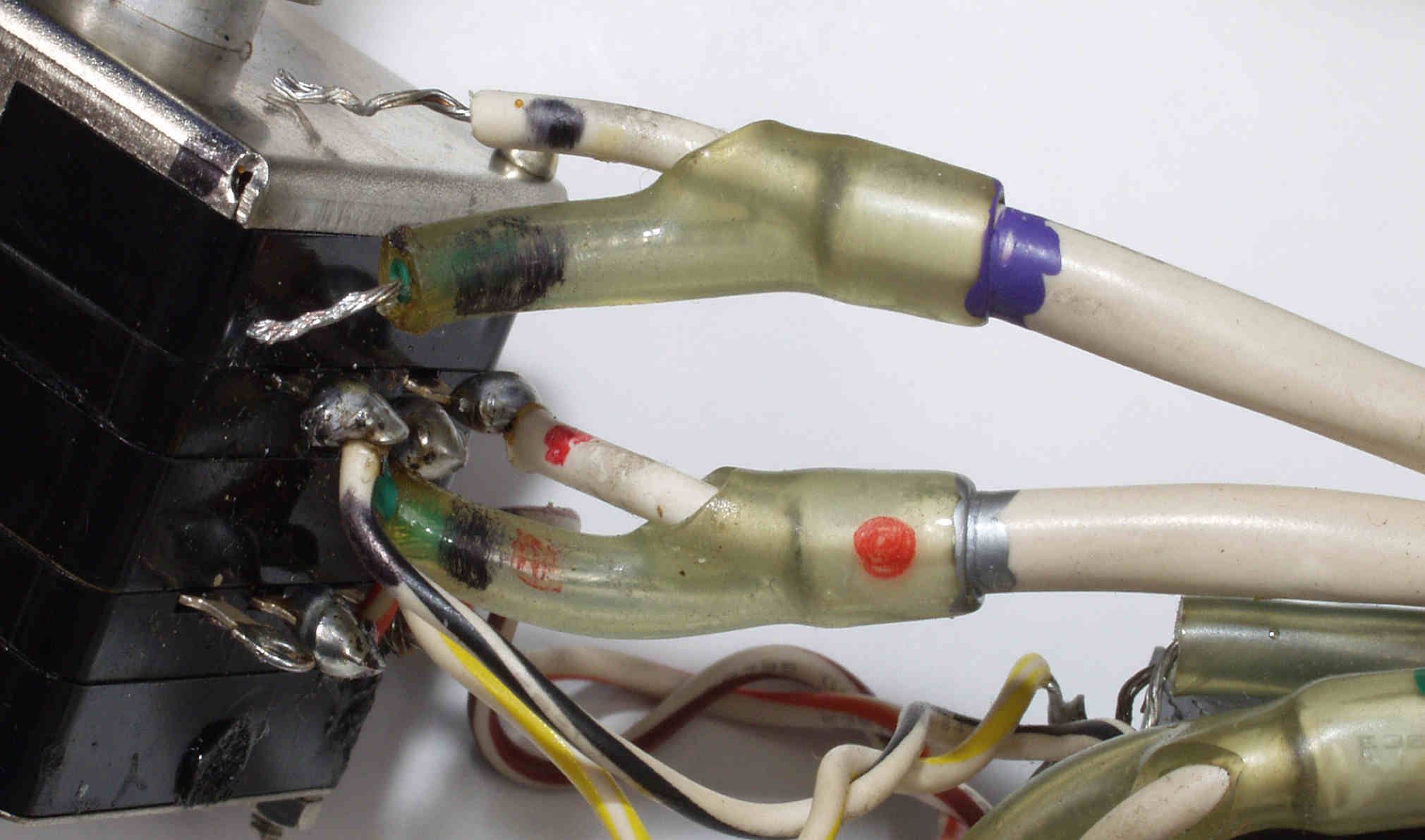 CD2. バランスVRへの配線、単線は熱で被服(透明)が切れるので、耐熱チューブ(緑色)を挿入する。