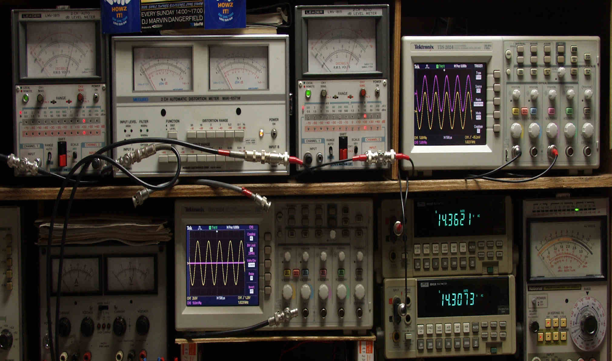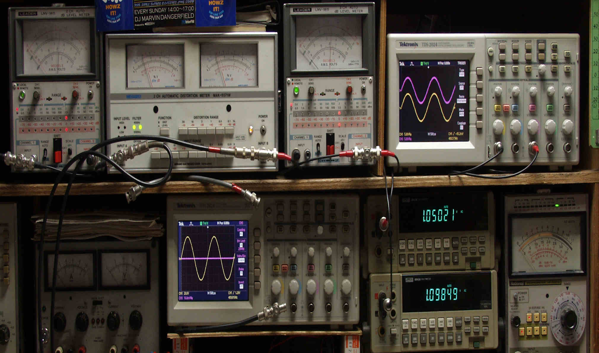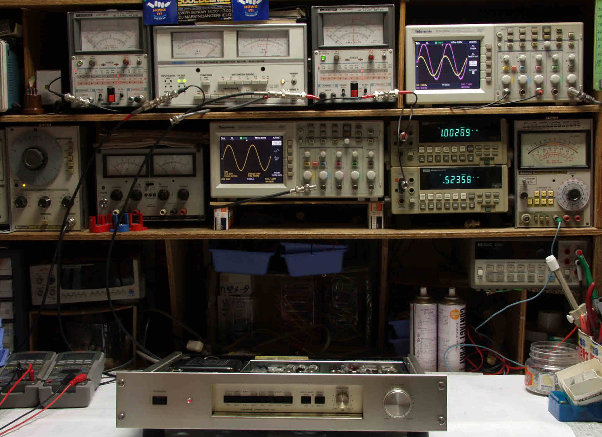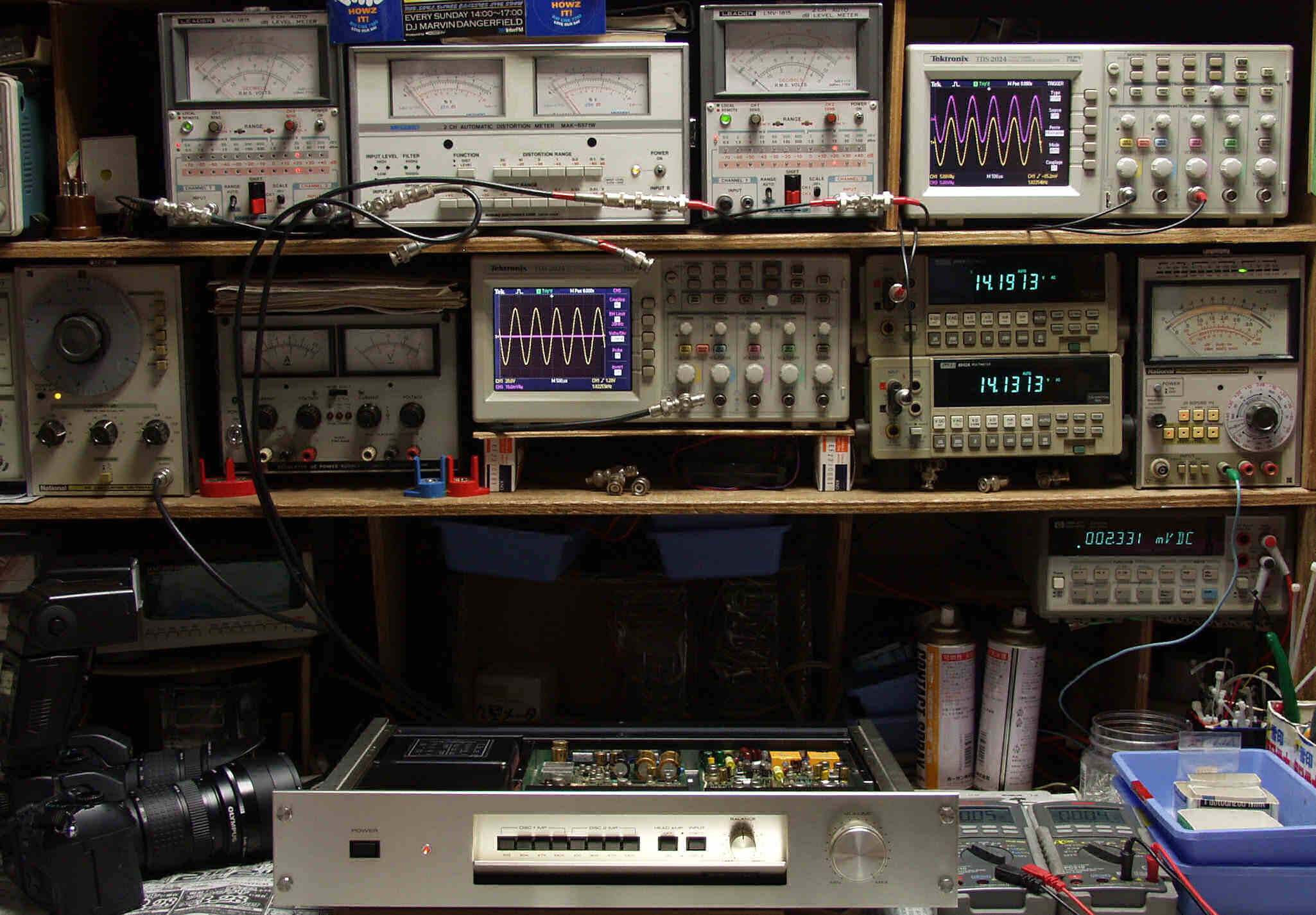 上段中左 歪み率計=出力の歪み率測定。 左メータ=L出力、右メータ=R出力。