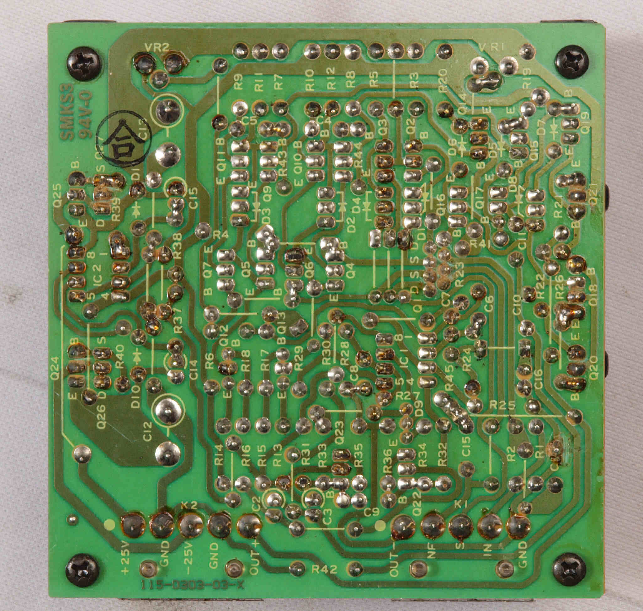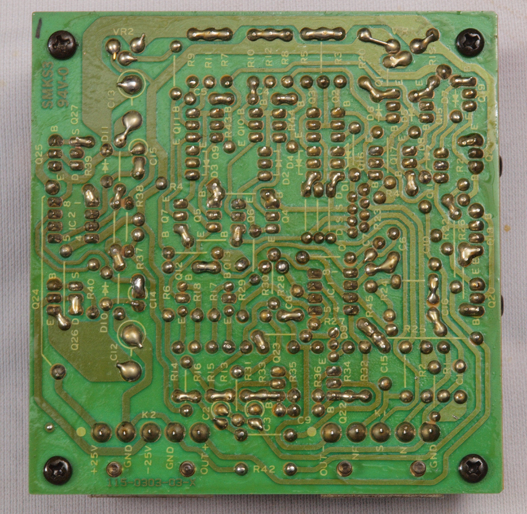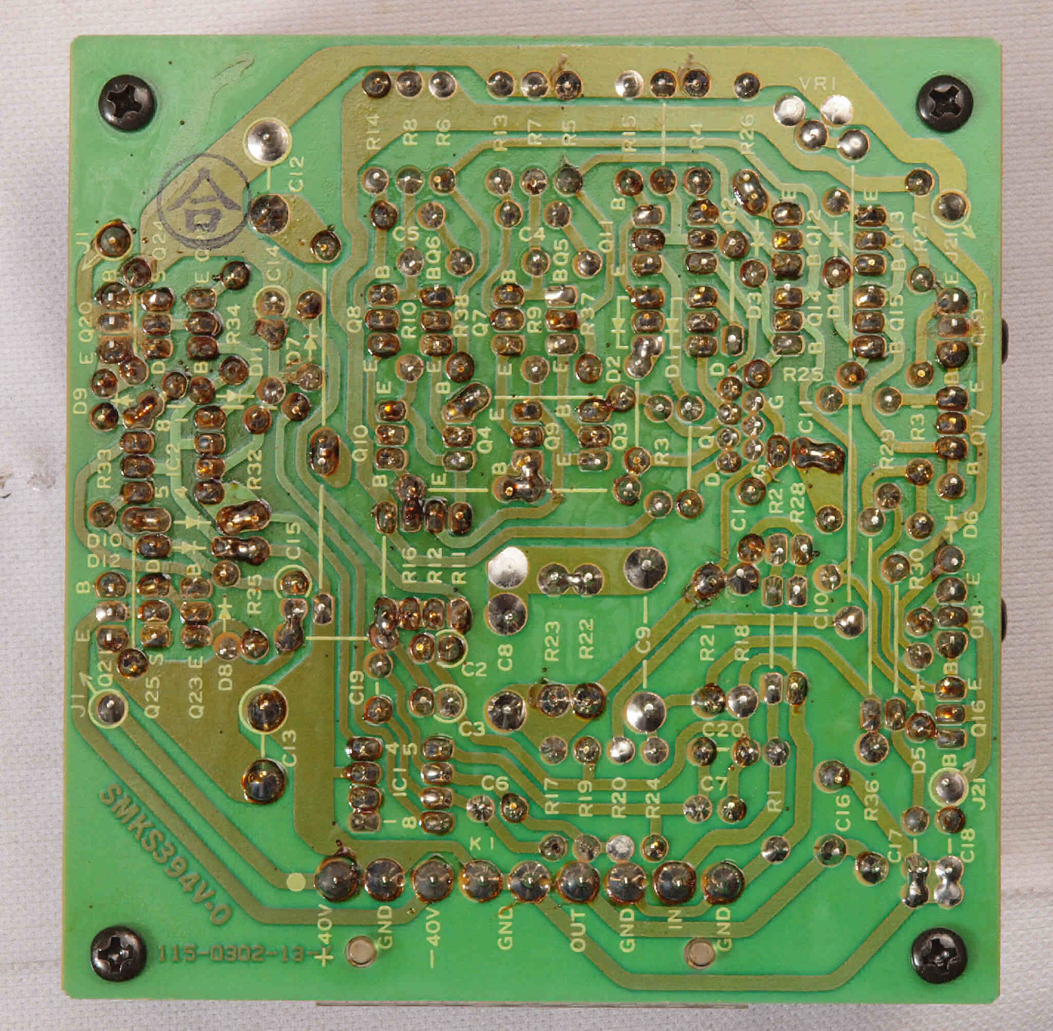 C34. 修理(半田補正)後 R側EQ_AMP基板裏。 半田を全部やり直す。
