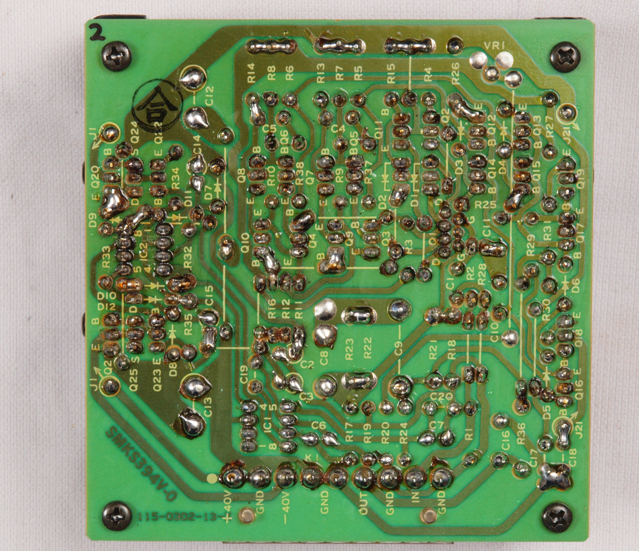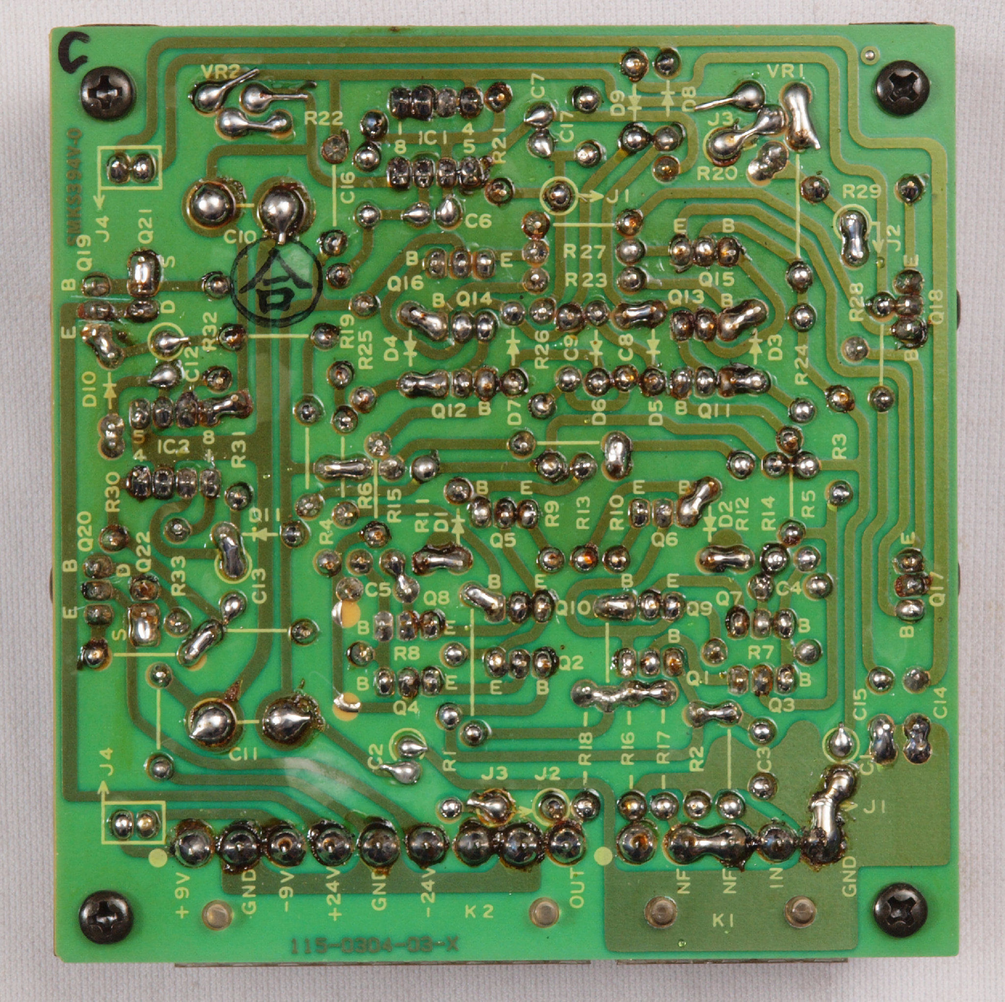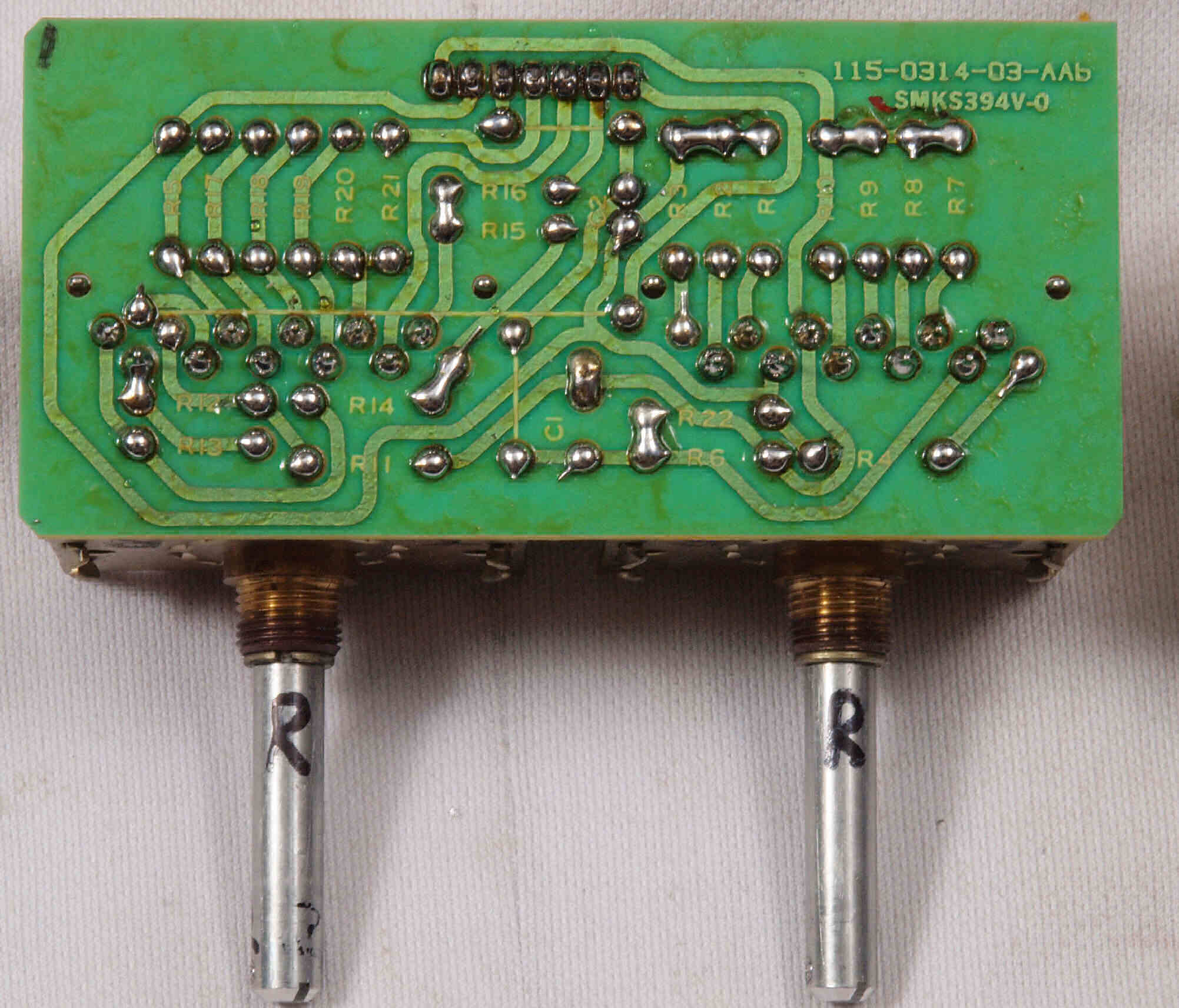 C34. 修理(半田補正)後 R側EQ_AMP基板裏。 半田を全部やり直す。