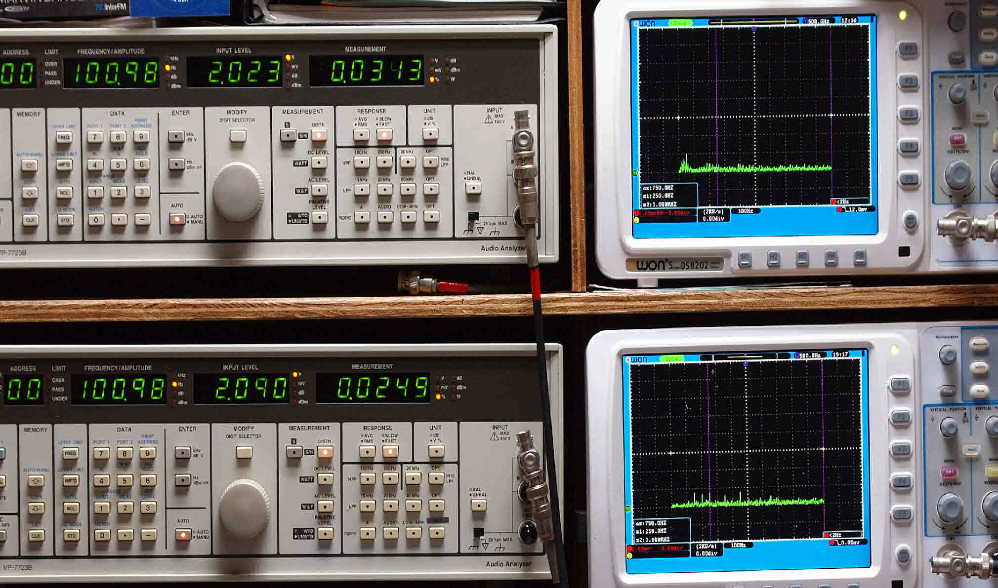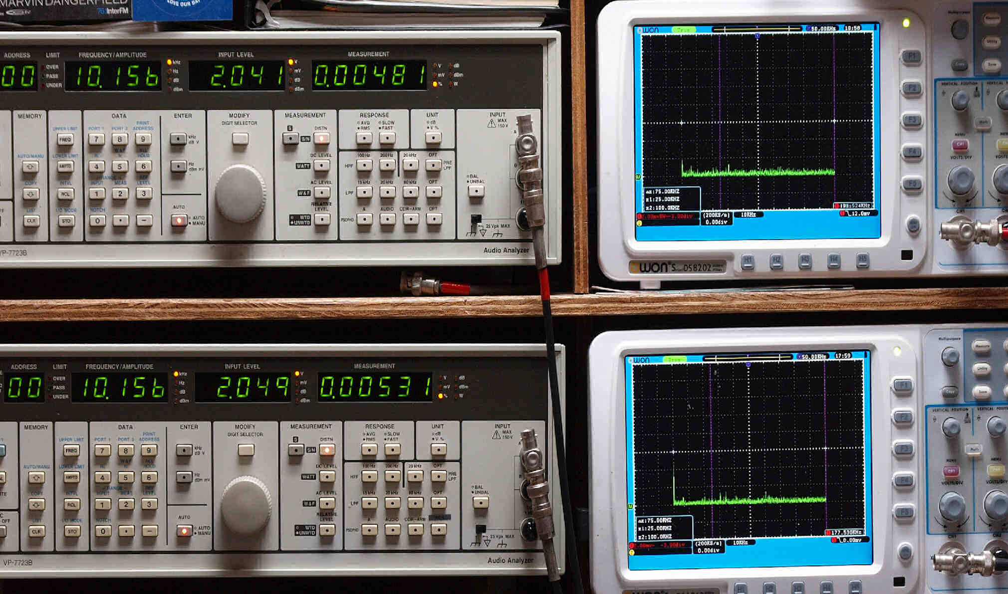 上段右端 VP−7723Bの基本波除去出力を「owon SDS8202(200MHZ)」で「FFT分析」表示。