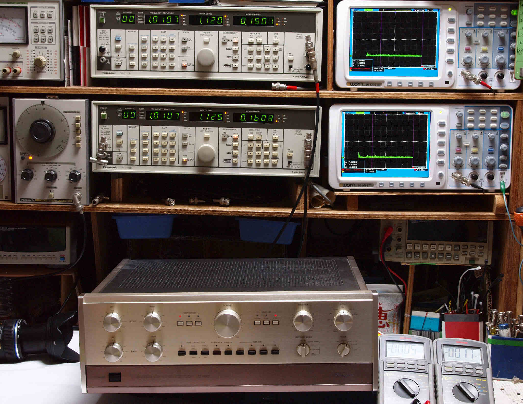 下段左端 オーディオ発振器 VP−7201A より50Hz〜100kHzの信号を出し(歪み率=約0.003%)、ATT+分配器を通し、AMPに入力。