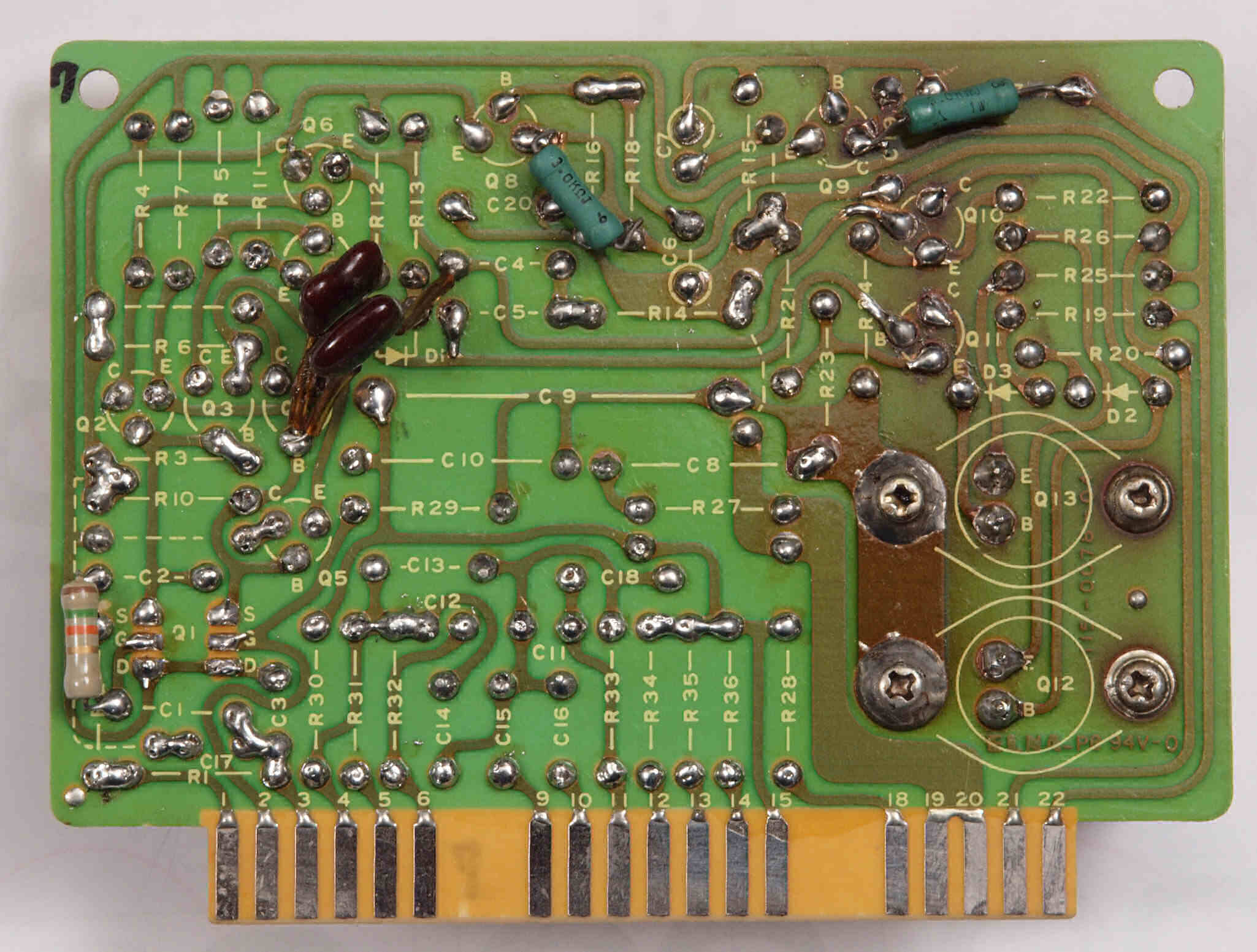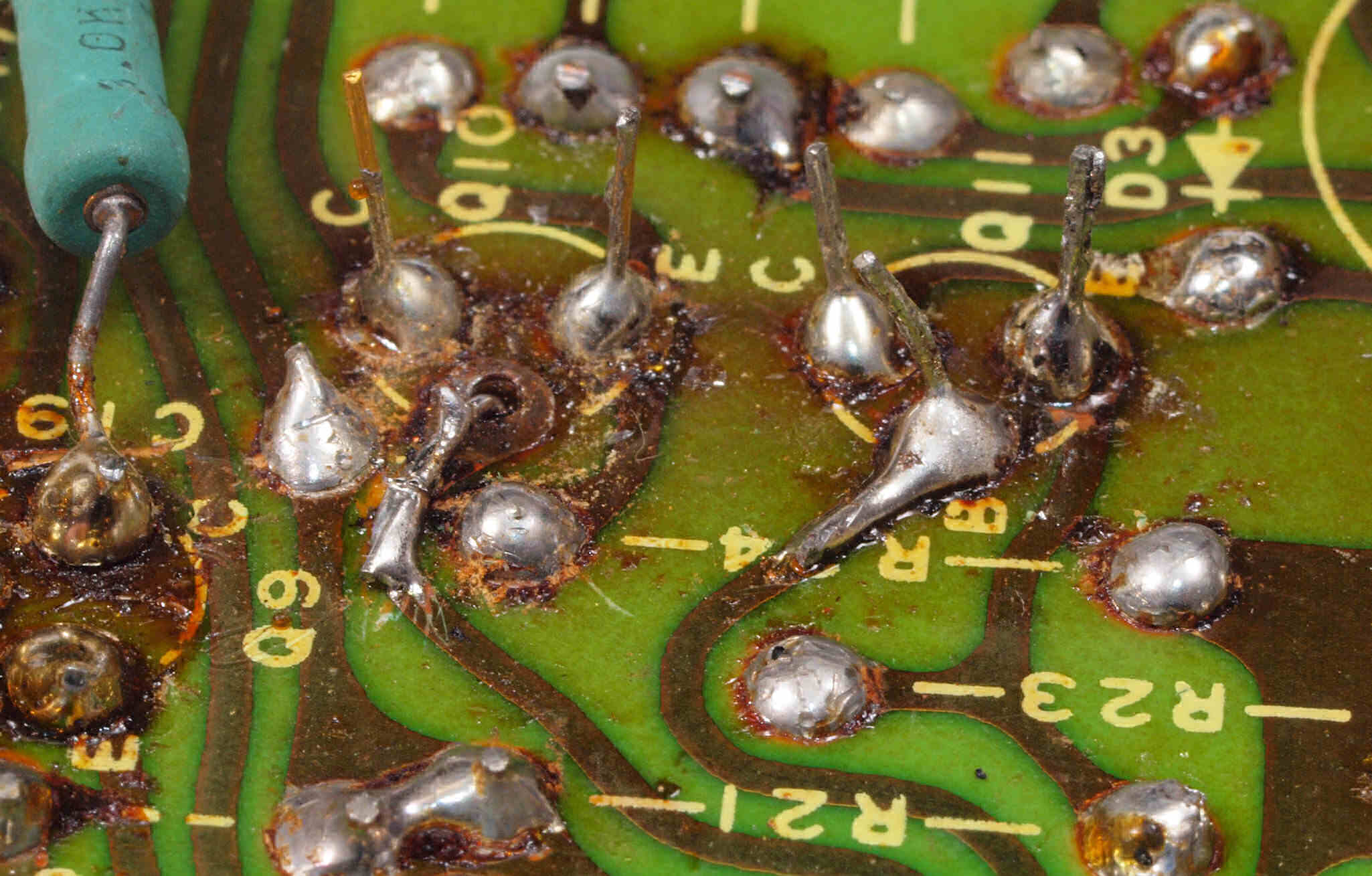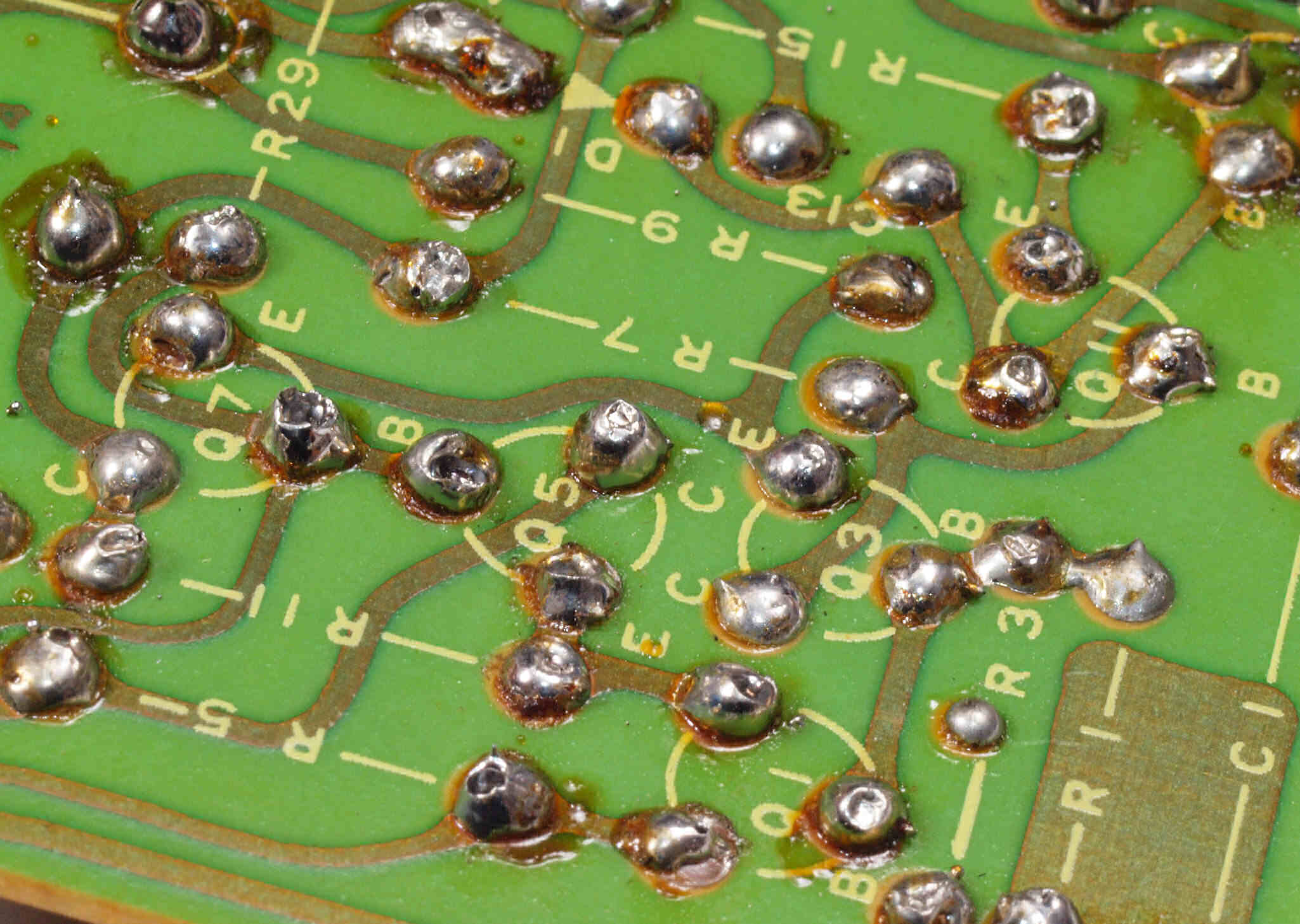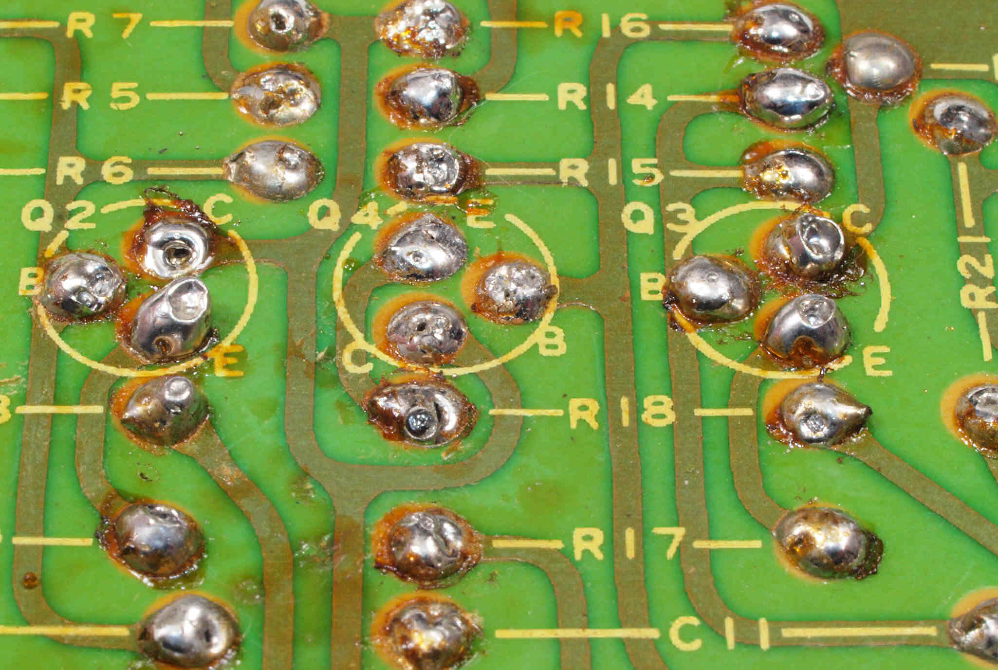 C132. 修理前 R側EQ_AMP基板裏。 交換したTR(トランジスター)の足が切っていない。