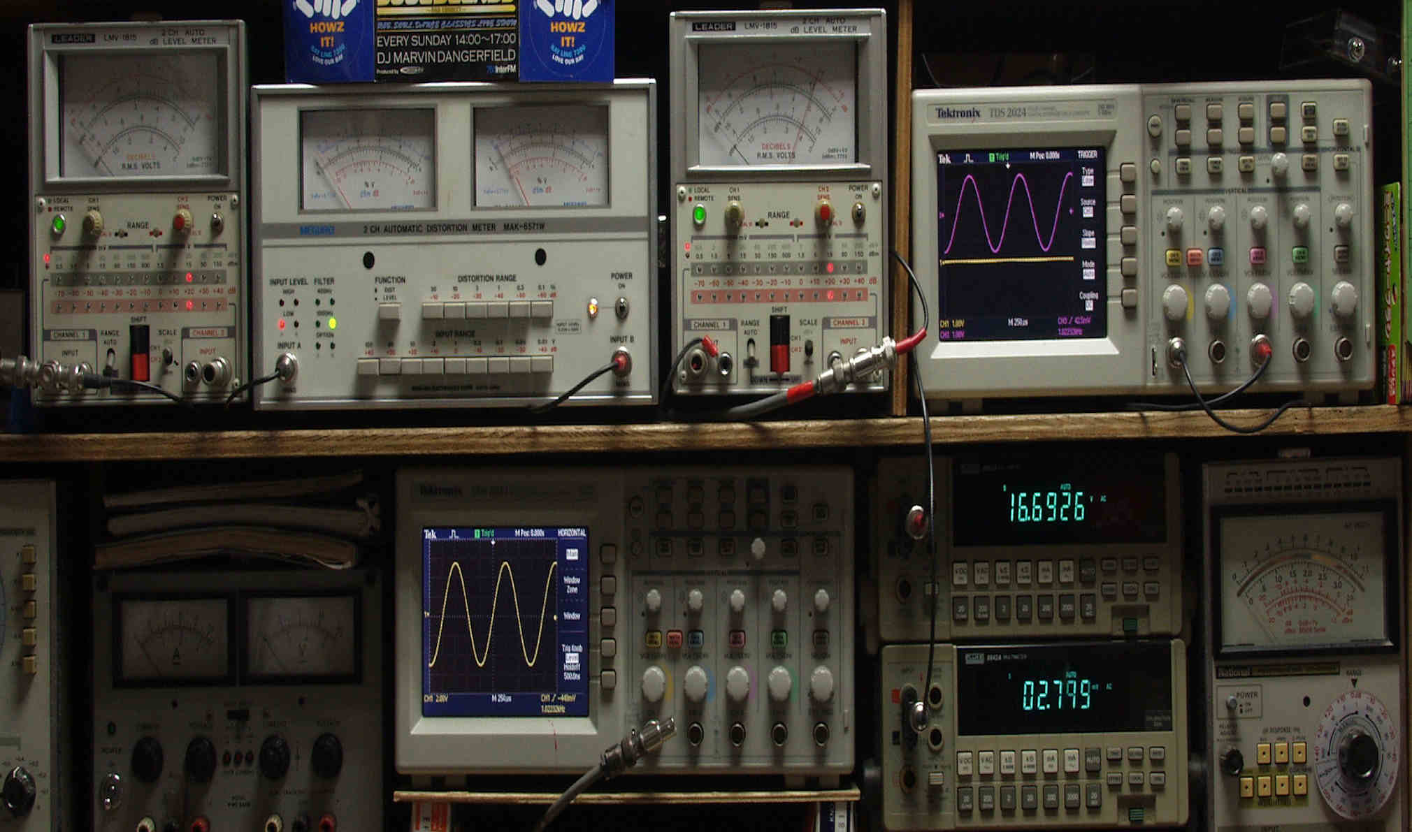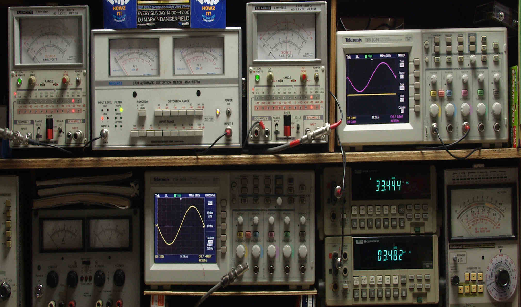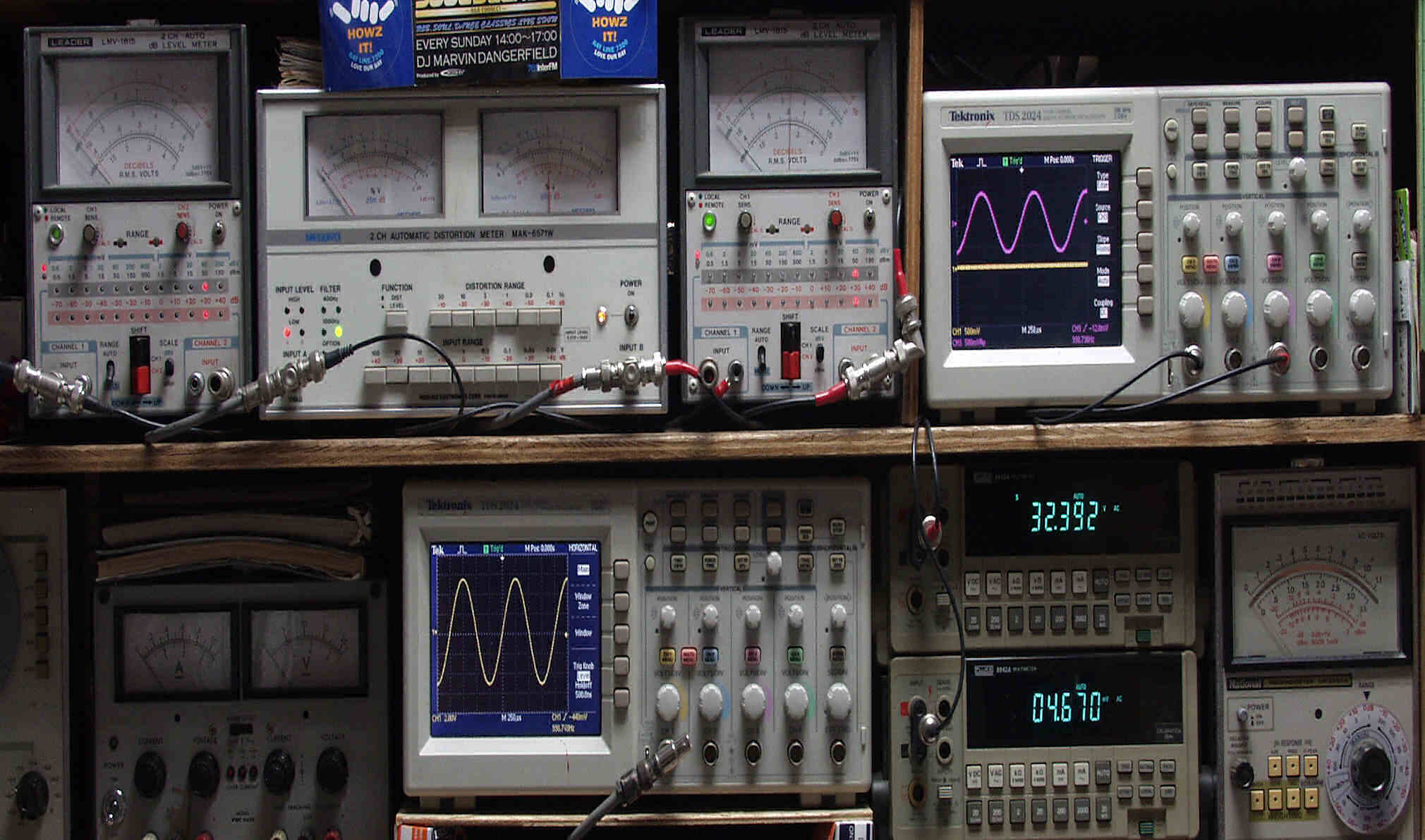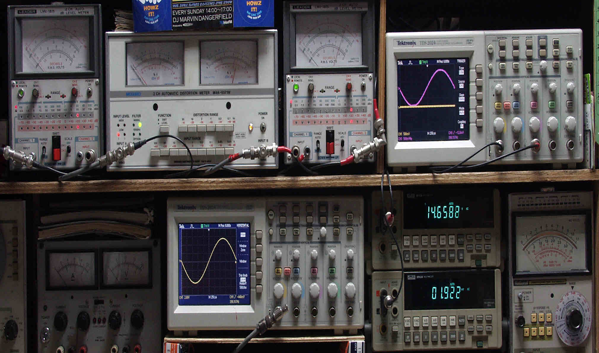 | T. 修理前点検測定 T1. 出力・歪み率測定。 「見方」。 下段左端 オーディオ発振器より400HZ・1KHZの信号を出し(歪み率=約0.003%)これをAMPに入力し、出力を測定。 下段中央 オシロ=入力波形(オーディオ発振器のTTLレベル表示)。 上段左端 交流電圧計=L側出力電圧測定、黒針のみ使用。 上段中左 歪み率計=出力の歪み率測定 左メータ=L出力、右メータ=R出力。 上段中右 交流電圧計=R側出力電圧測定、赤針のみ使用。 上段右端 オシロ=出力波形表示、 赤表示=R出力、黄色表示=L出力。(実際にはRL交流電圧計の出力「Max1V」を観測)。 下段中右上 デジタル電圧計=R出力電圧測定。 下段中右下 デジタル電圧計=L出力電圧測定。 |