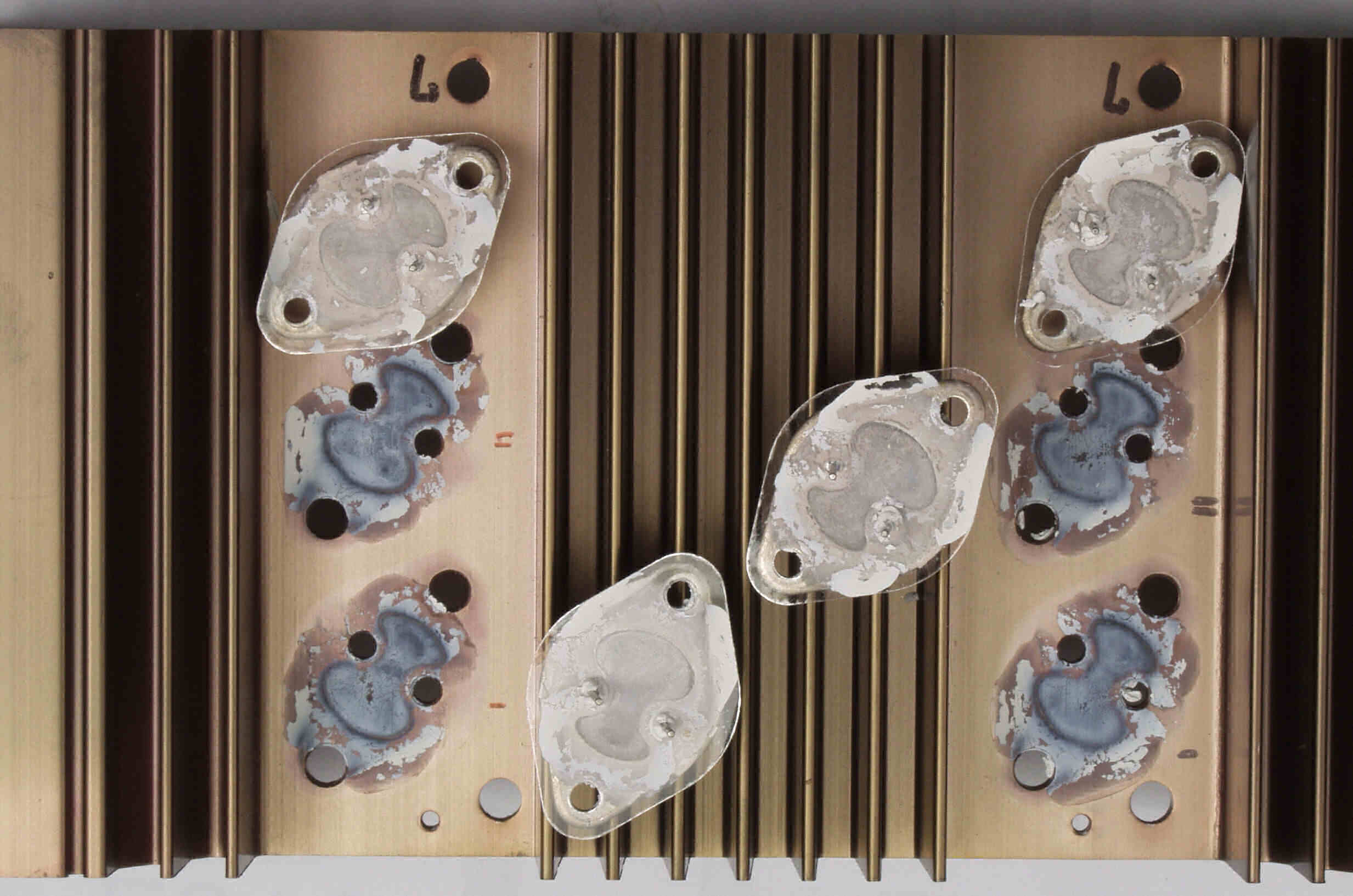 | C312. 修理中 R側終段FET(電解トランジスター)、熱の為、凝固した穂熱シリコン。 | ||||||||||||||||||||||||||