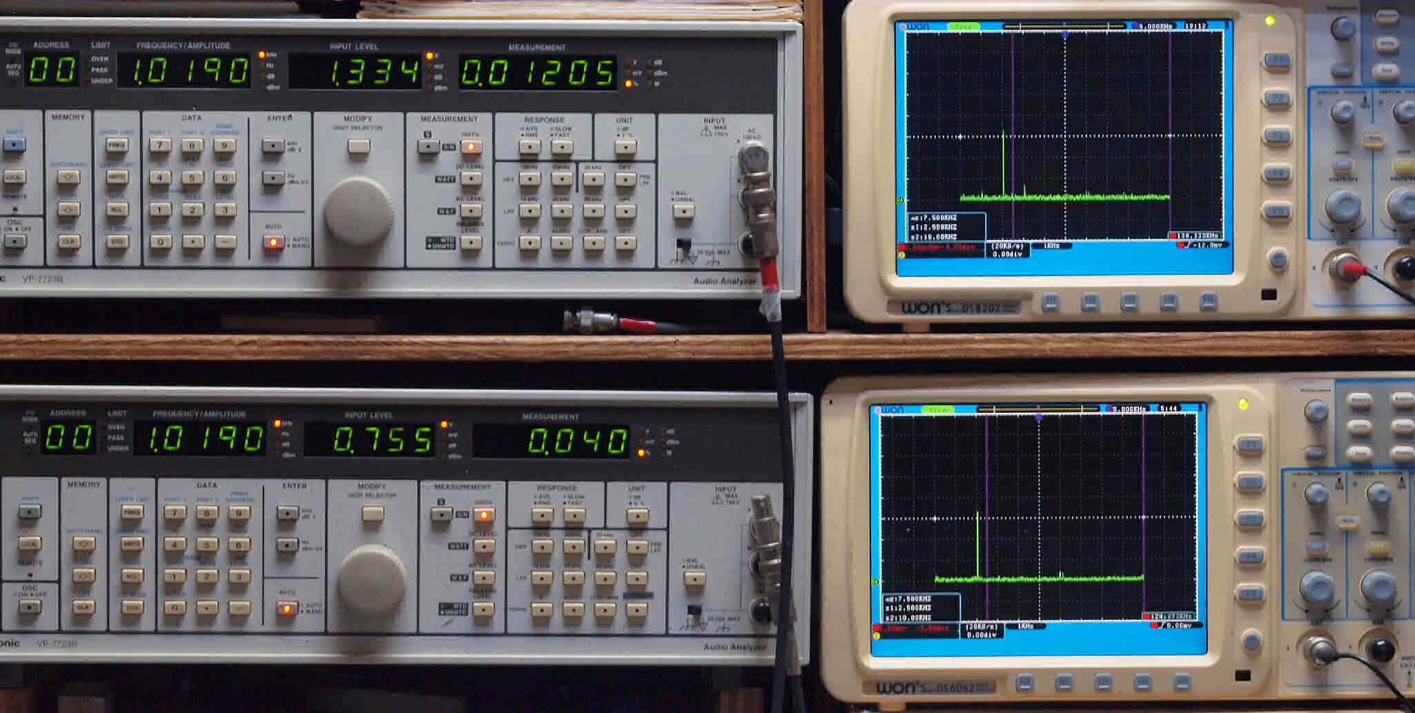 よって、ダイアル設定出力レベルより低くなります。測定機器の仕様や整備の様子はこちら、「VP−7723B」「VP−7201A」。 FFT画面の見方はこちら。
