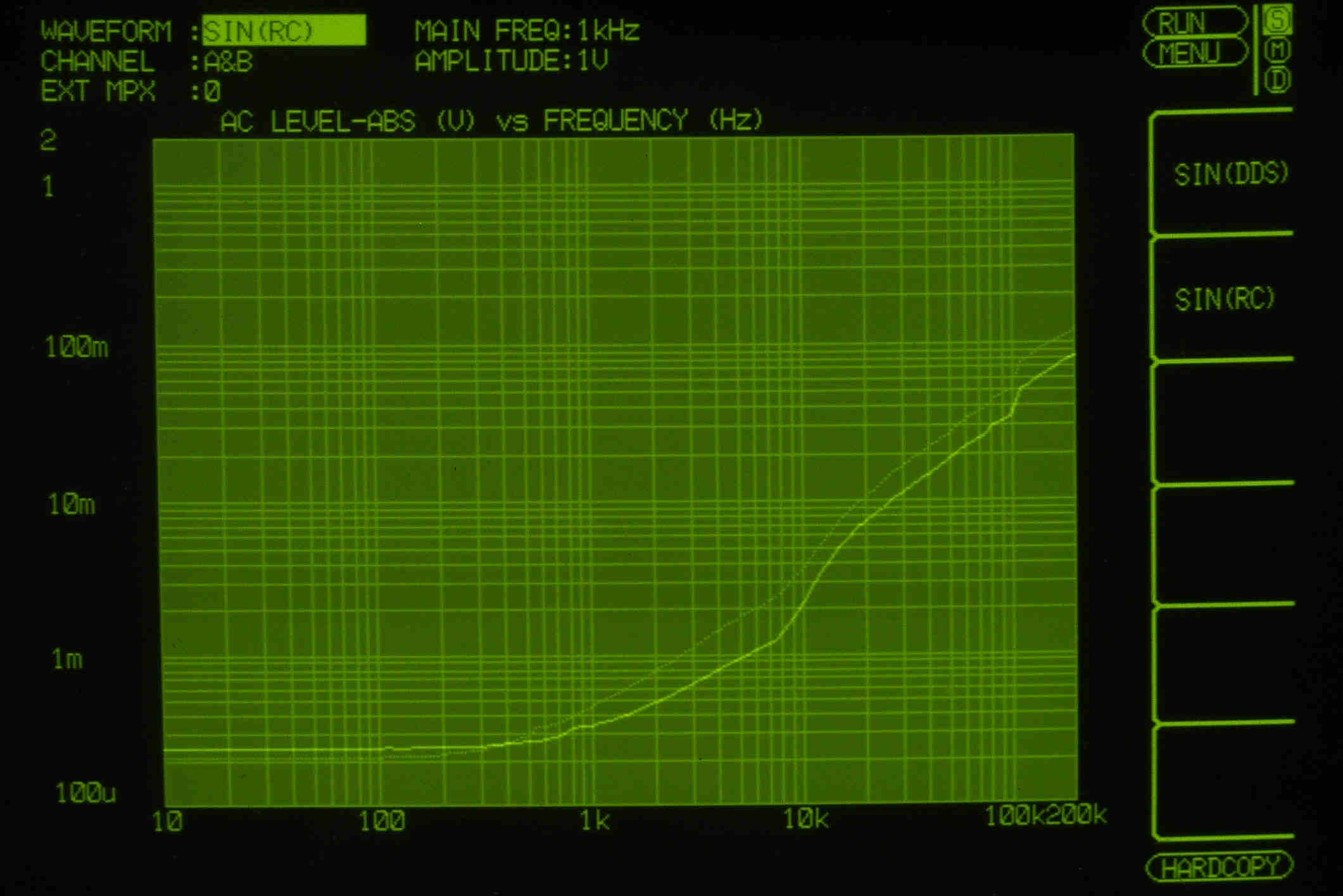 | EE33. 歪み測定チャネ3、入力電圧=1V一定入力、VRはmax、左出力=薄(細い)色 右出力=濃い(太い)色 200HZ以下及び、30KHZ以上は入力レベルが測定以下になる為、表示出来ない。 |