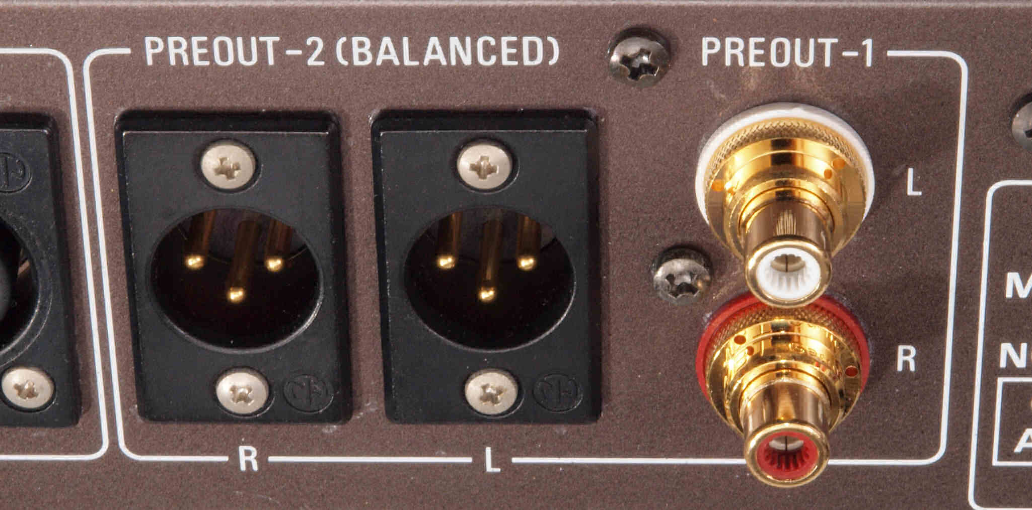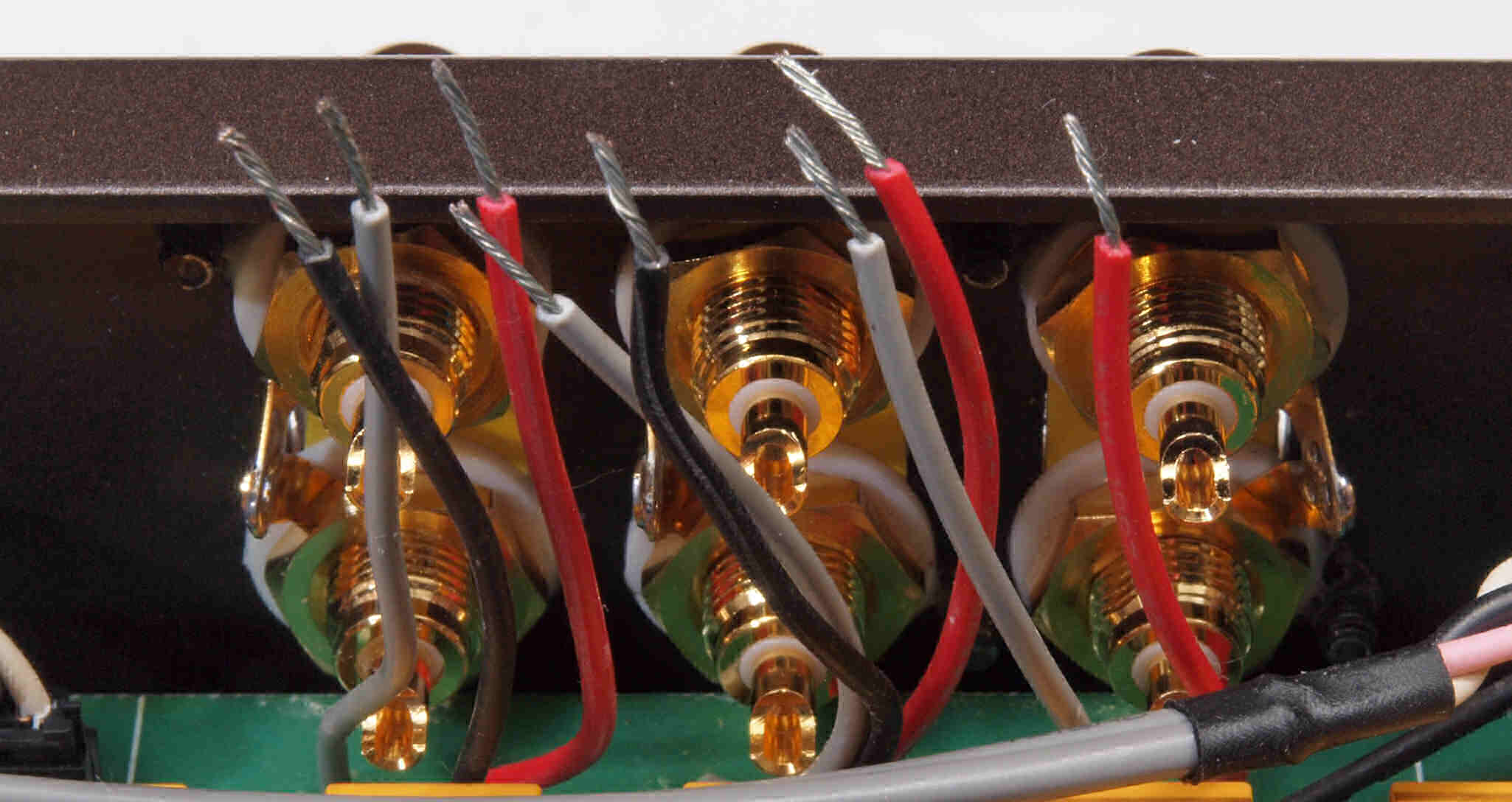 | A61. 点検中 出力RCA端子。 出力キャノンコネクター=NEUTRIC NC3MP-B、 RCA端子WBT−0201使用可能。 |