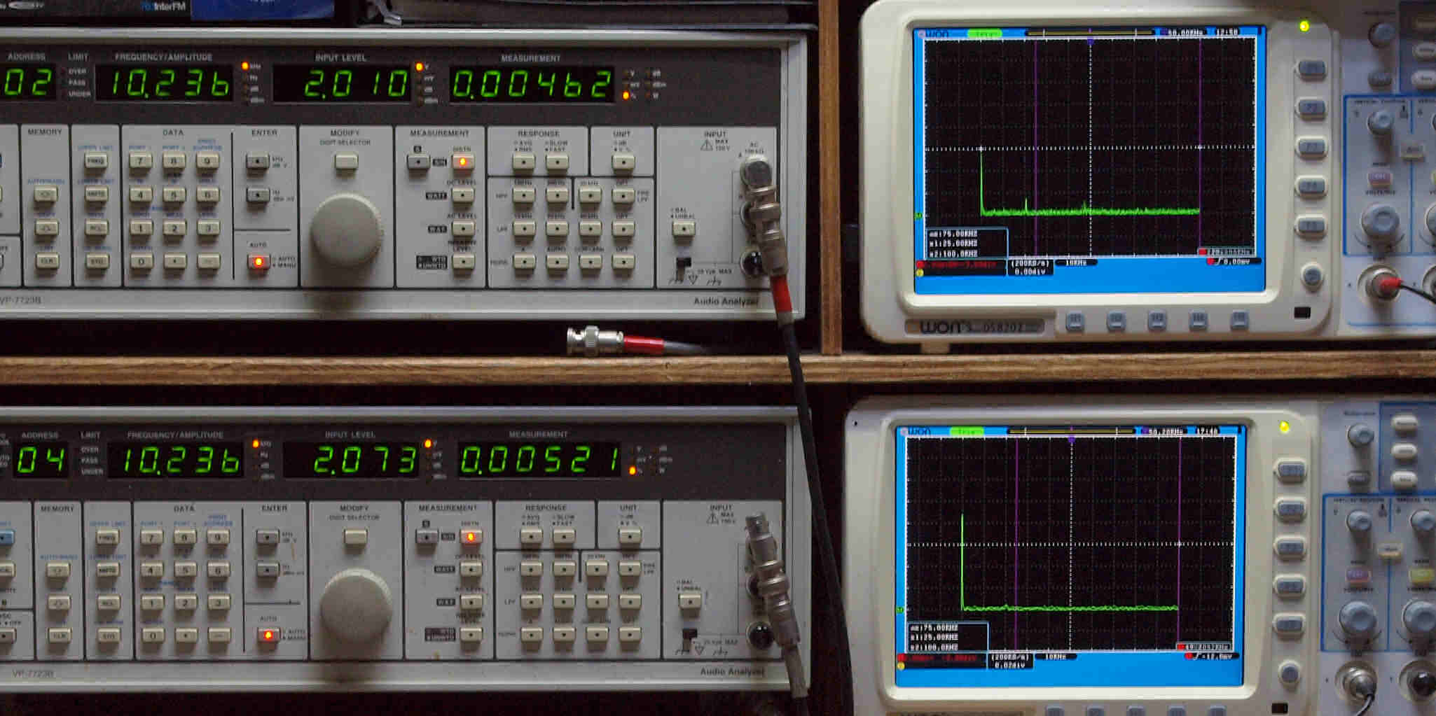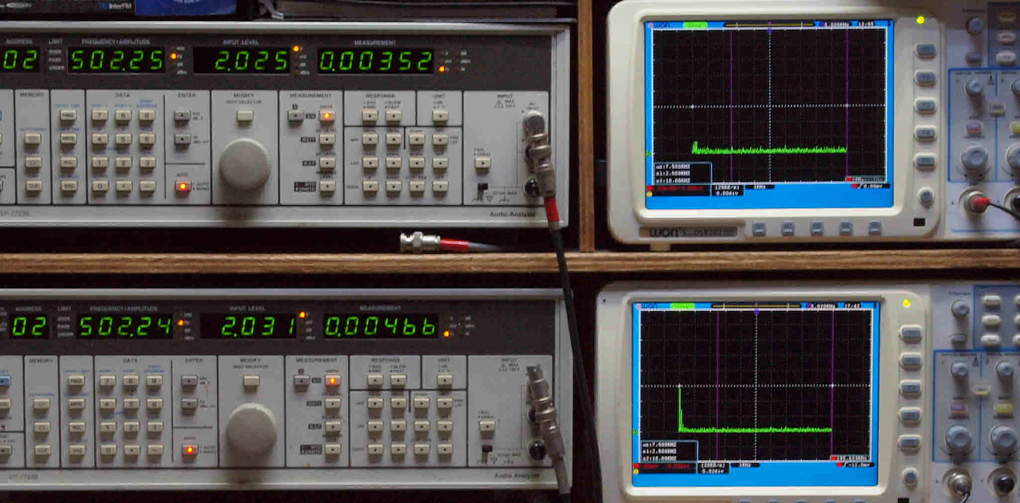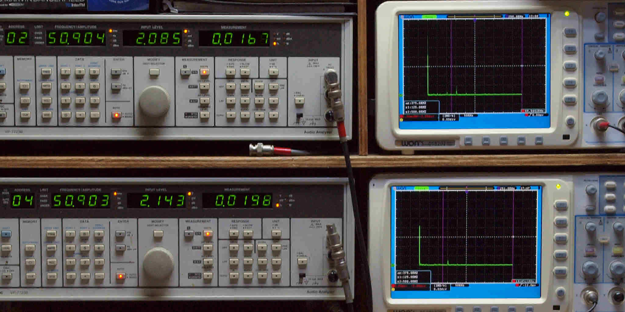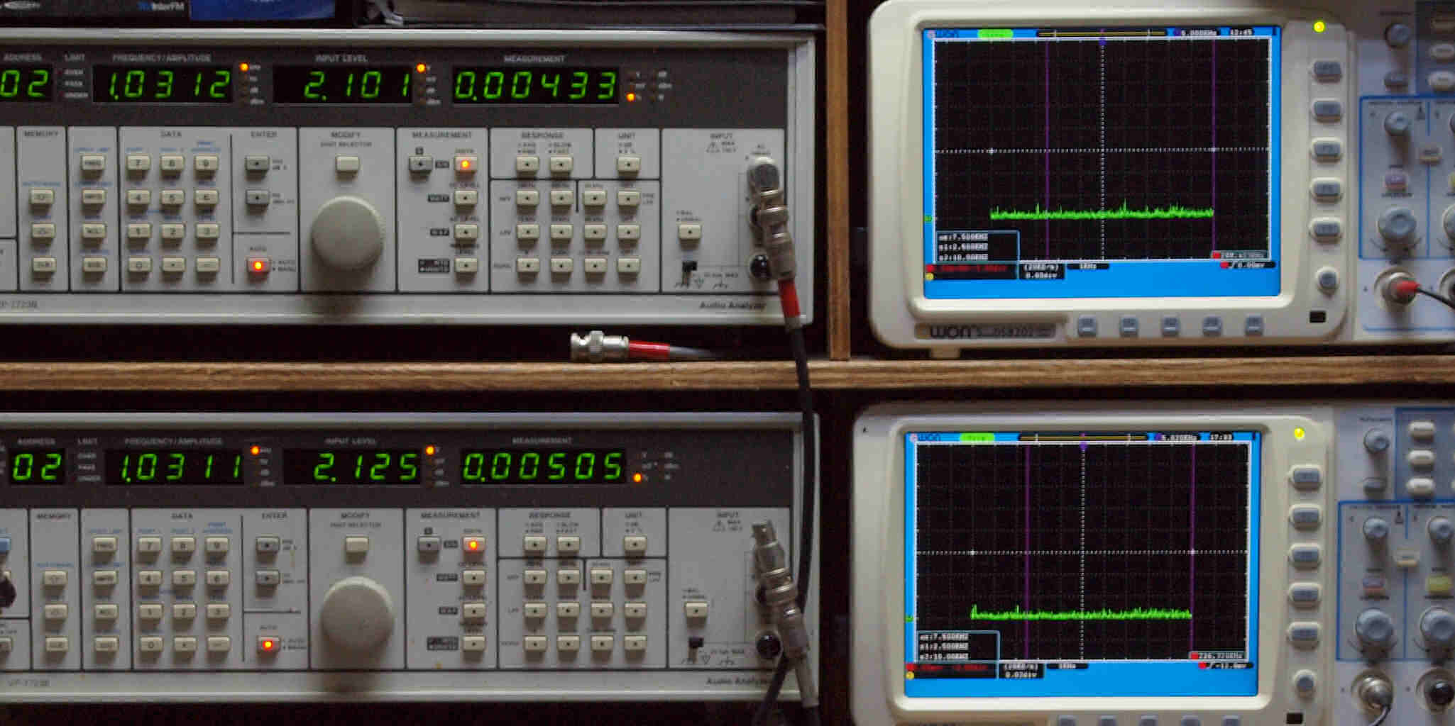 | E. 調整・測定。 画像をクリックすると、大きく(横幅2050ドット)表示されます。 E0. 出力・歪み率測定・調整。 「見方」。 上段中 右側出力を「Audio Analyzer Panasonic VP−7723B」により測定。 表示LED、 左端=メモリーNo、 中左=周波数測定、 中右=出力電圧測定、 右端=歪み率測定。 上段右端 VP−7723Bの基本波除去出力を「owon SDS8202(200MHZ)」で「FFT分析」表示。 下段中 左側出力を「Audio Analyzer Panasonic VP−7723B」により測定。 表示LED、 左端=メモリーNo、 中左=周波数測定、 中右=出力電圧測定、 右端=歪み率測定。 下段右端 VP−7723Bの基本波除去出力を「owon SDS6062(200MHZ)」で「FFT分析」表示。 下段左端 オーディオ発振器 VP−7201A より50Hz〜100kHzの信号を出し(歪み率=約0.003%)、ATT+分配器を通し、AMPに入力。 よって、ダイアル設定出力レベルより低くなります。測定機器の仕様や整備の様子はこちら、「VP−7723B」「VP−7201A」。 FFT画面の見方はこちら。 |
