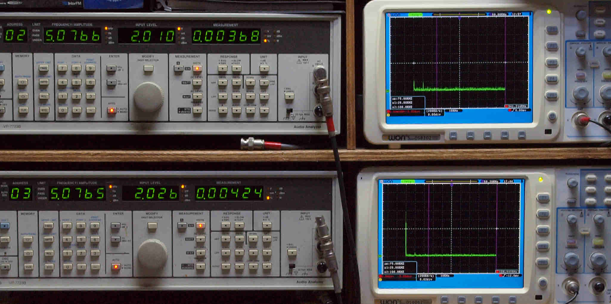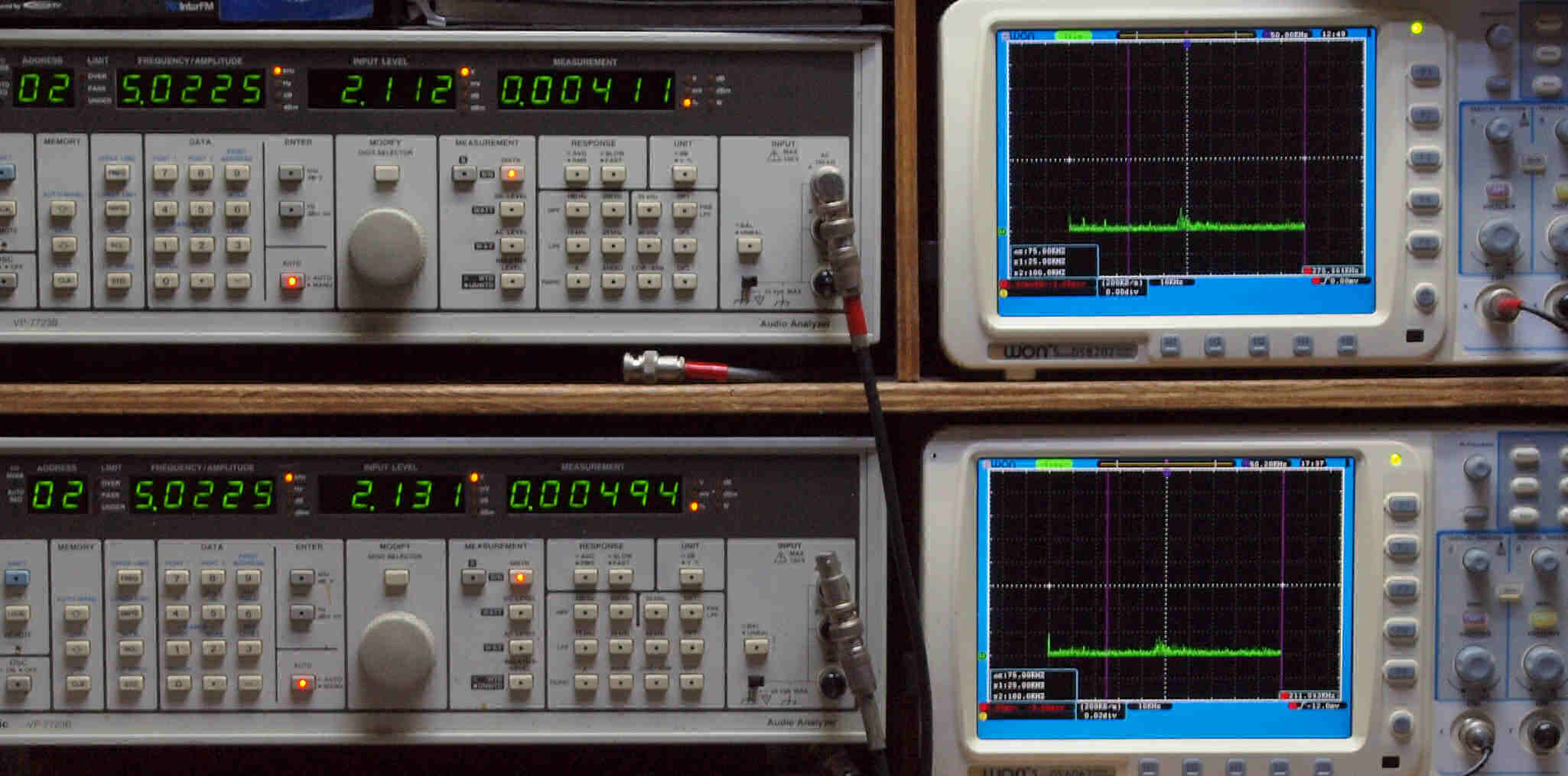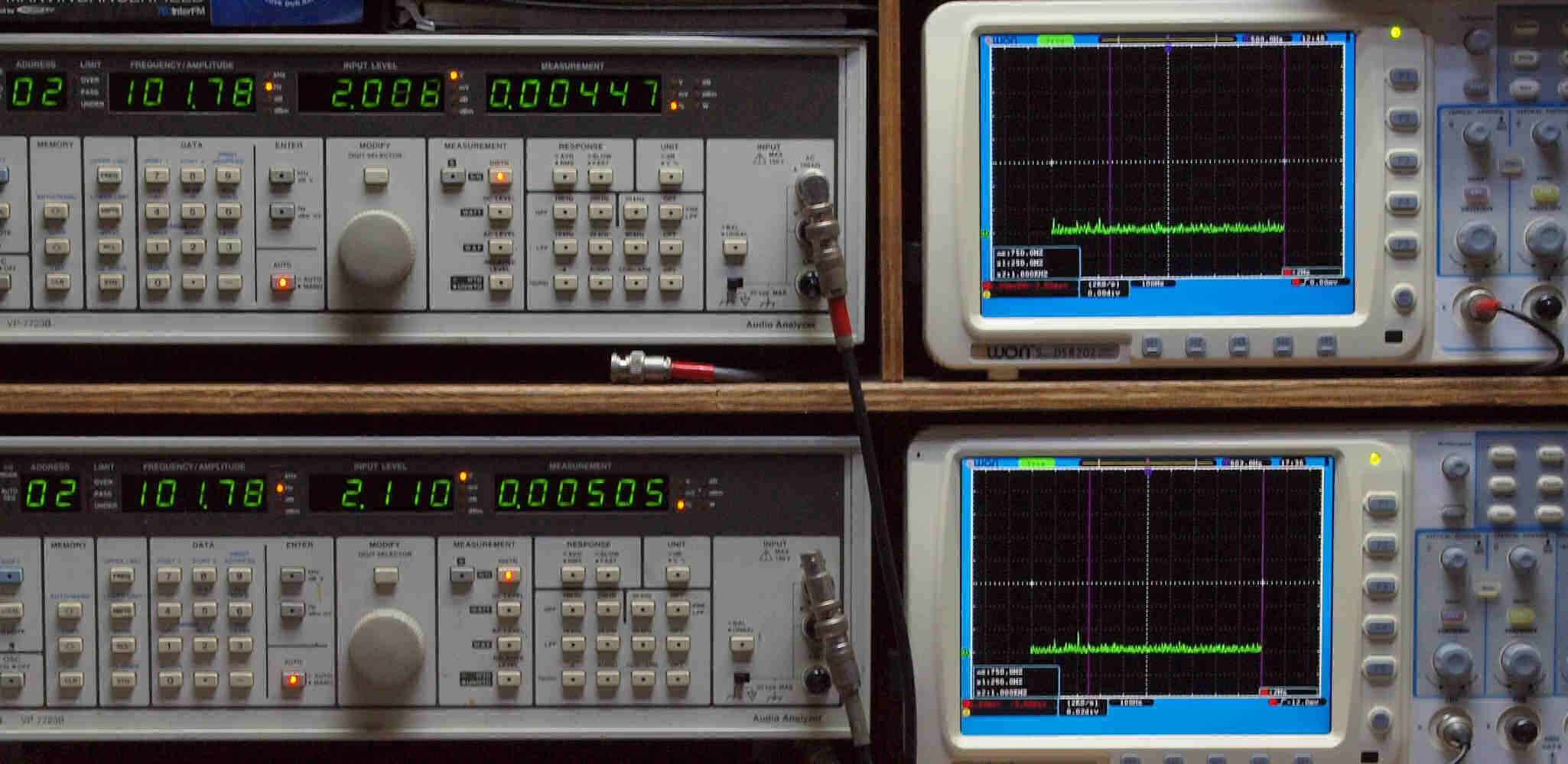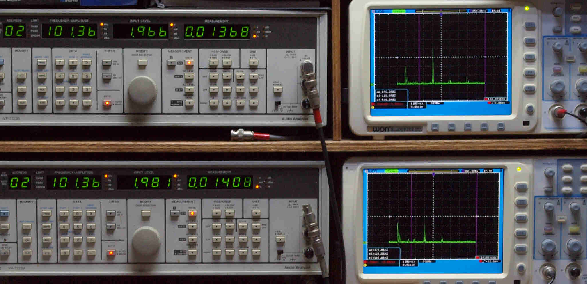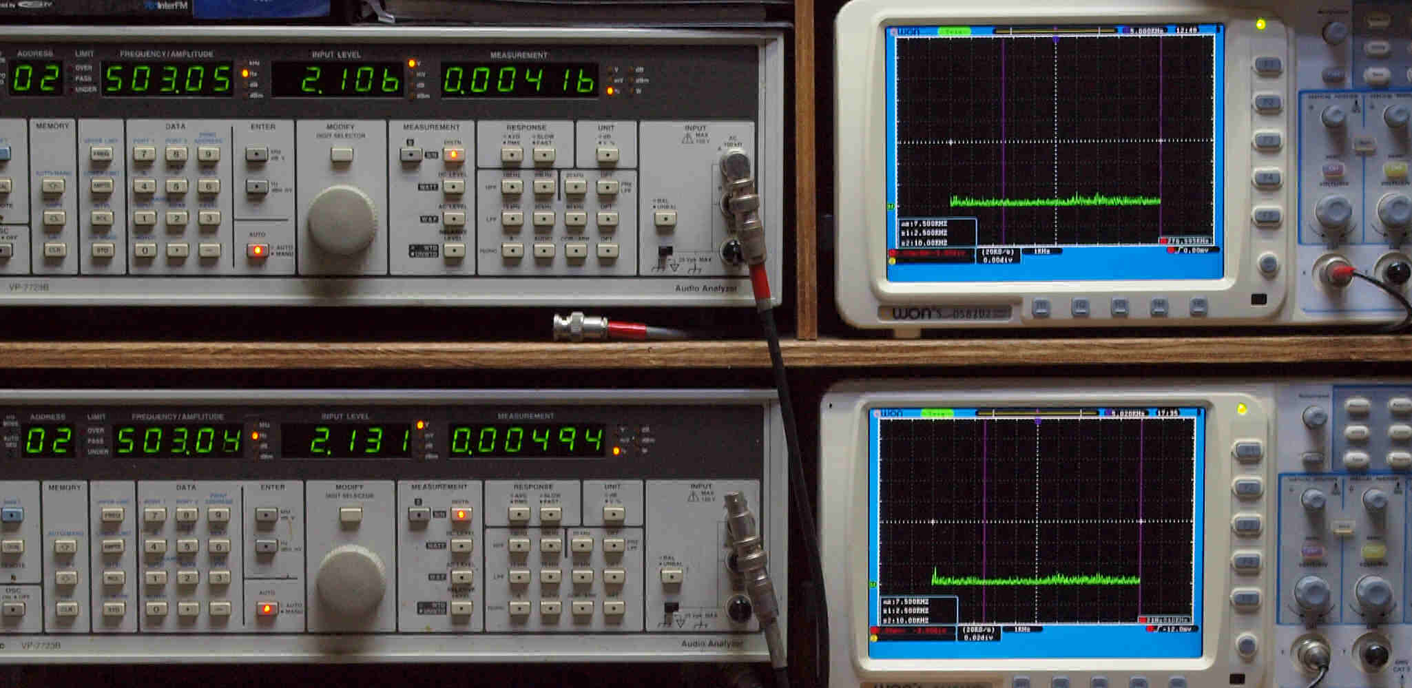 | E. 調整・測定。 画像をクリックすると、大きく(横幅2050ドット)表示されます。 E0. 出力・歪み率測定・調整。 「見方」。 上段中 右側出力を「Audio Analyzer Panasonic VP−7723B」により測定。 表示LED、 左端=メモリーNo、 中左=周波数測定、 中右=出力電圧測定、 右端=歪み率測定。 上段右端 VP−7723Bの基本波除去出力を「owon SDS8202(200MHZ)」で「FFT分析」表示。 下段中 左側出力を「Audio Analyzer Panasonic VP−7723B」により測定。 表示LED、 左端=メモリーNo、 中左=周波数測定、 中右=出力電圧測定、 右端=歪み率測定。 下段右端 VP−7723Bの基本波除去出力を「owon SDS6062(200MHZ)」で「FFT分析」表示。 下段左端 オーディオ発振器 VP−7201A より50Hz〜100kHzの信号を出し(歪み率=約0.003%)、ATT+分配器を通し、AMPに入力。 よって、ダイアル設定出力レベルより低くなります。測定機器の仕様や整備の様子はこちら、「VP−7723B」「VP−7201A」。 FFT画面の見方はこちら。 |