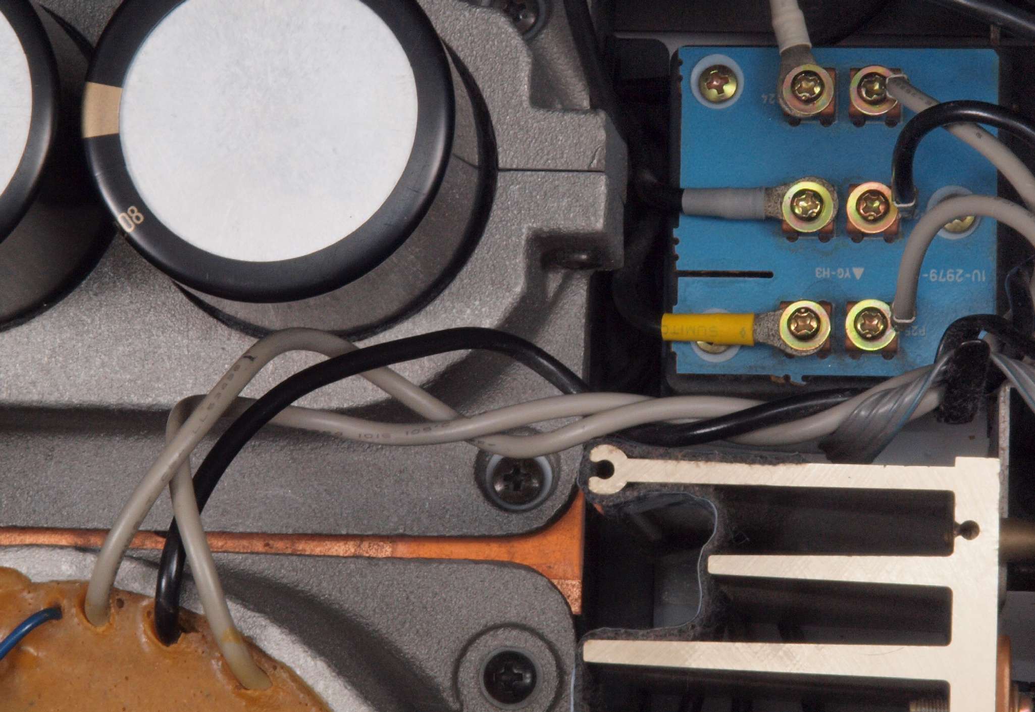 | A52. 点検中 電源ブロック電解コンデンサーの配線。 ラグ端子がステンレスや鉄ビスで止められている。 |