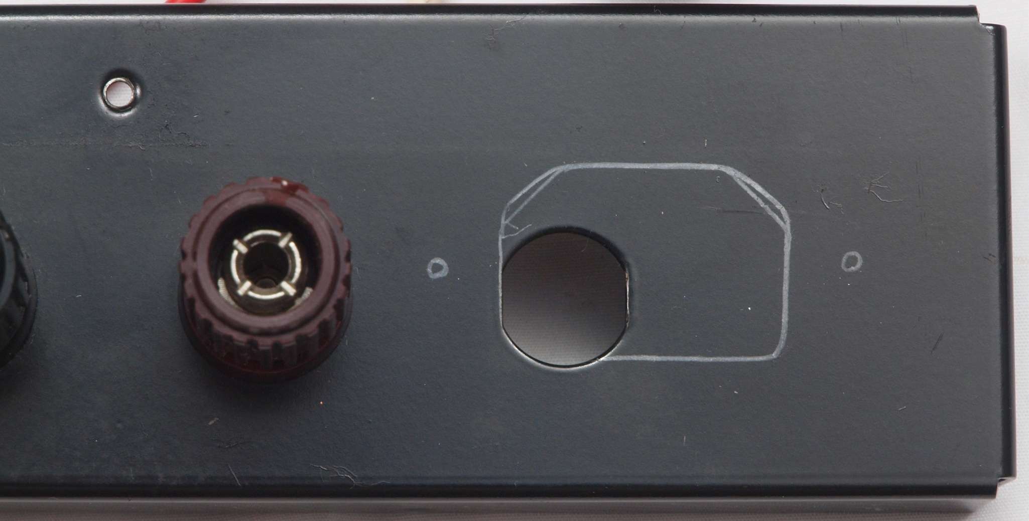CC2. 修理(加工)中 電源ケーブル挿入部、3Pインレット取り付け穴を開ける、ハンドツールなので時間がかかる。