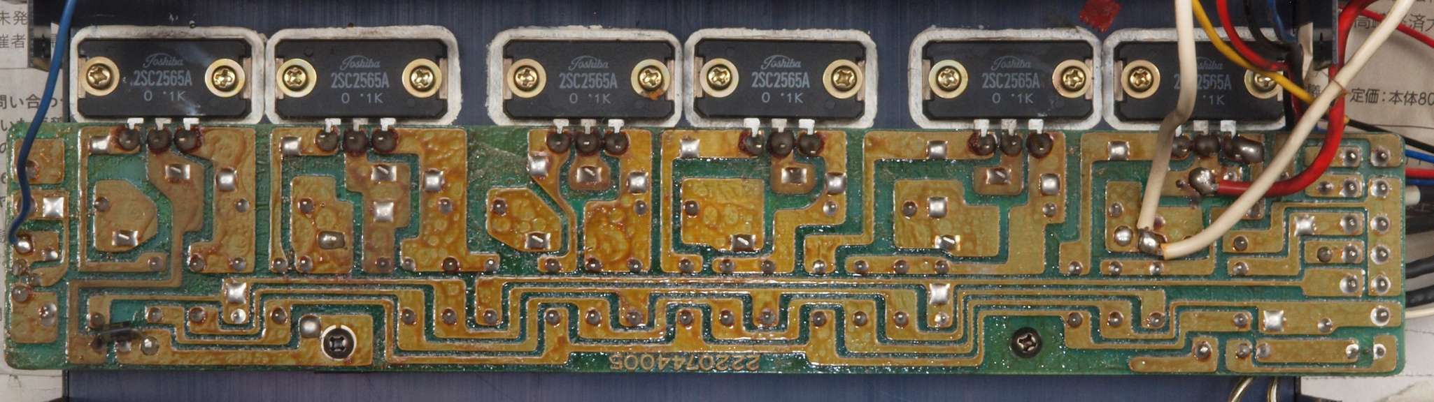 C1G. 修理中 +−側終段AMP基板。 ジャンパー線、電解コンデンサーの足が腐食している。