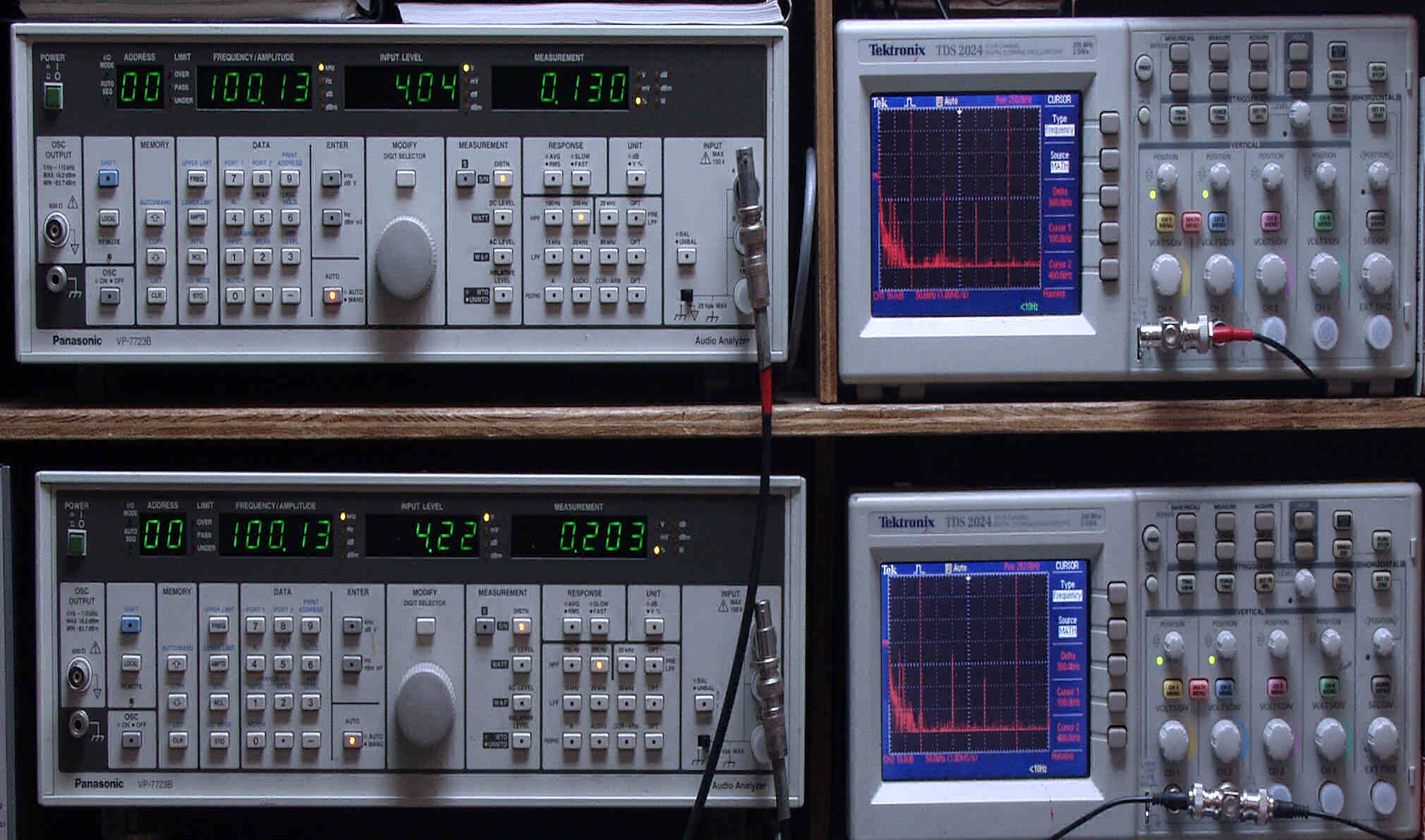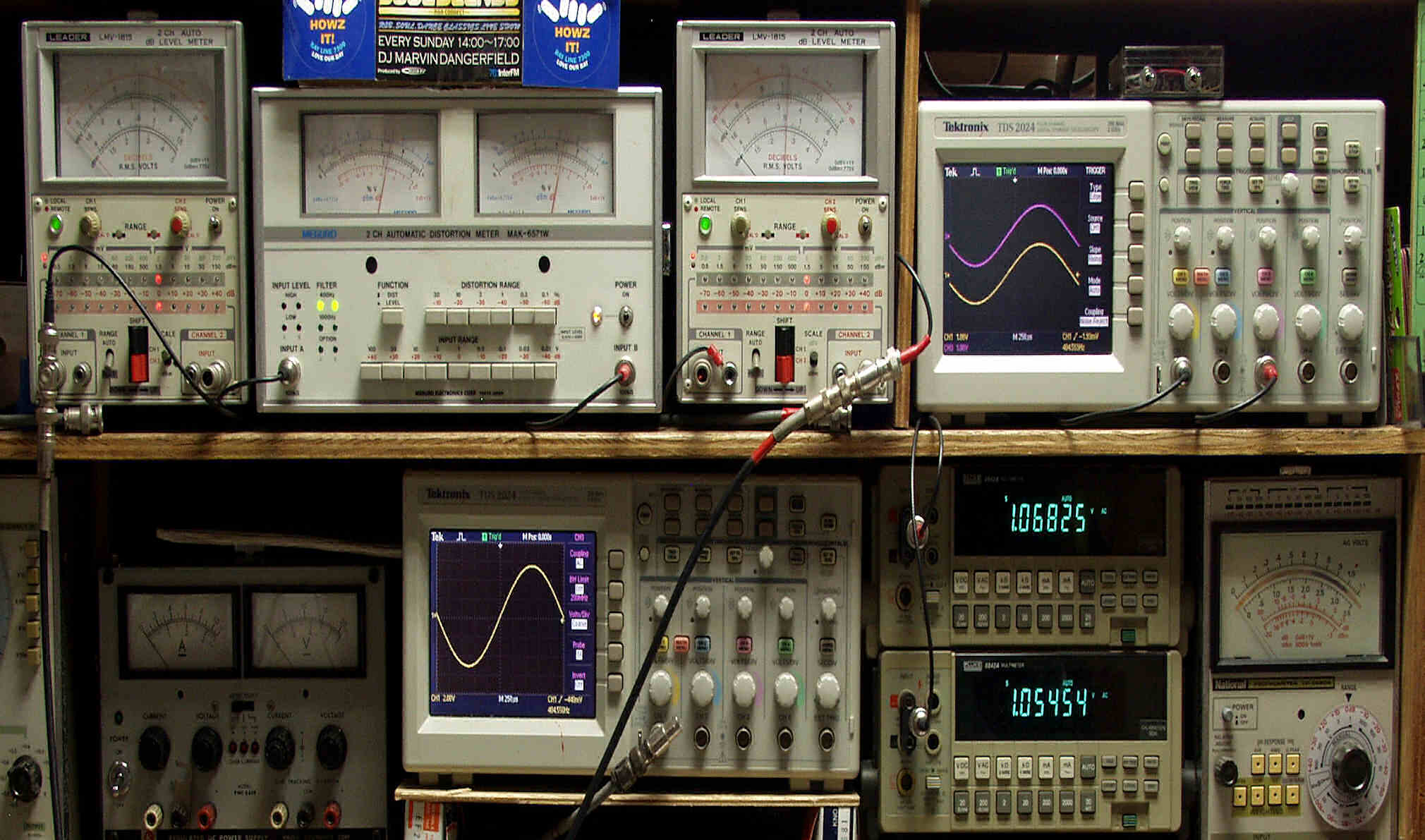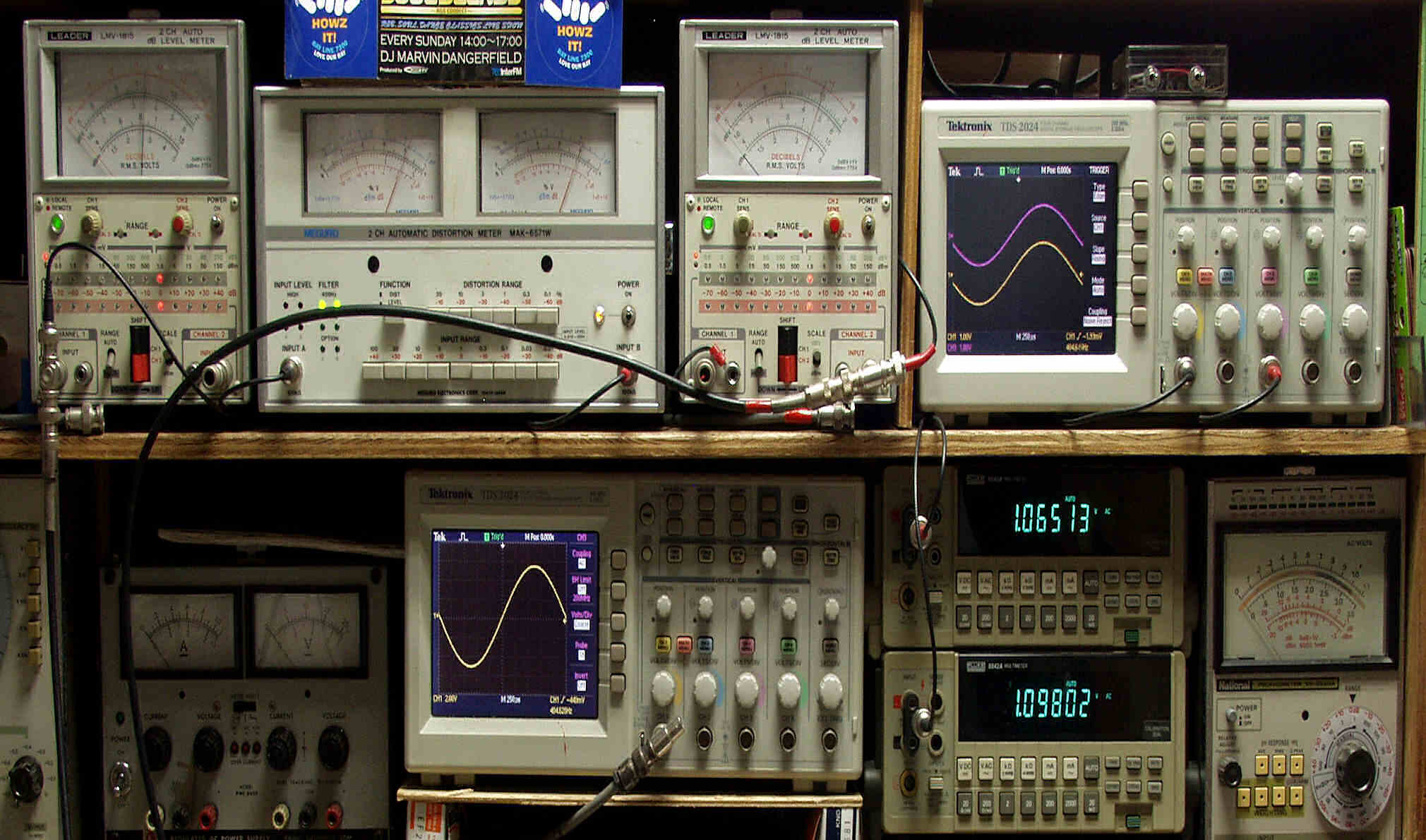上段中左 歪み率計=出力の歪み率測定。 左メータ=L出力、右メータ=R出力。
