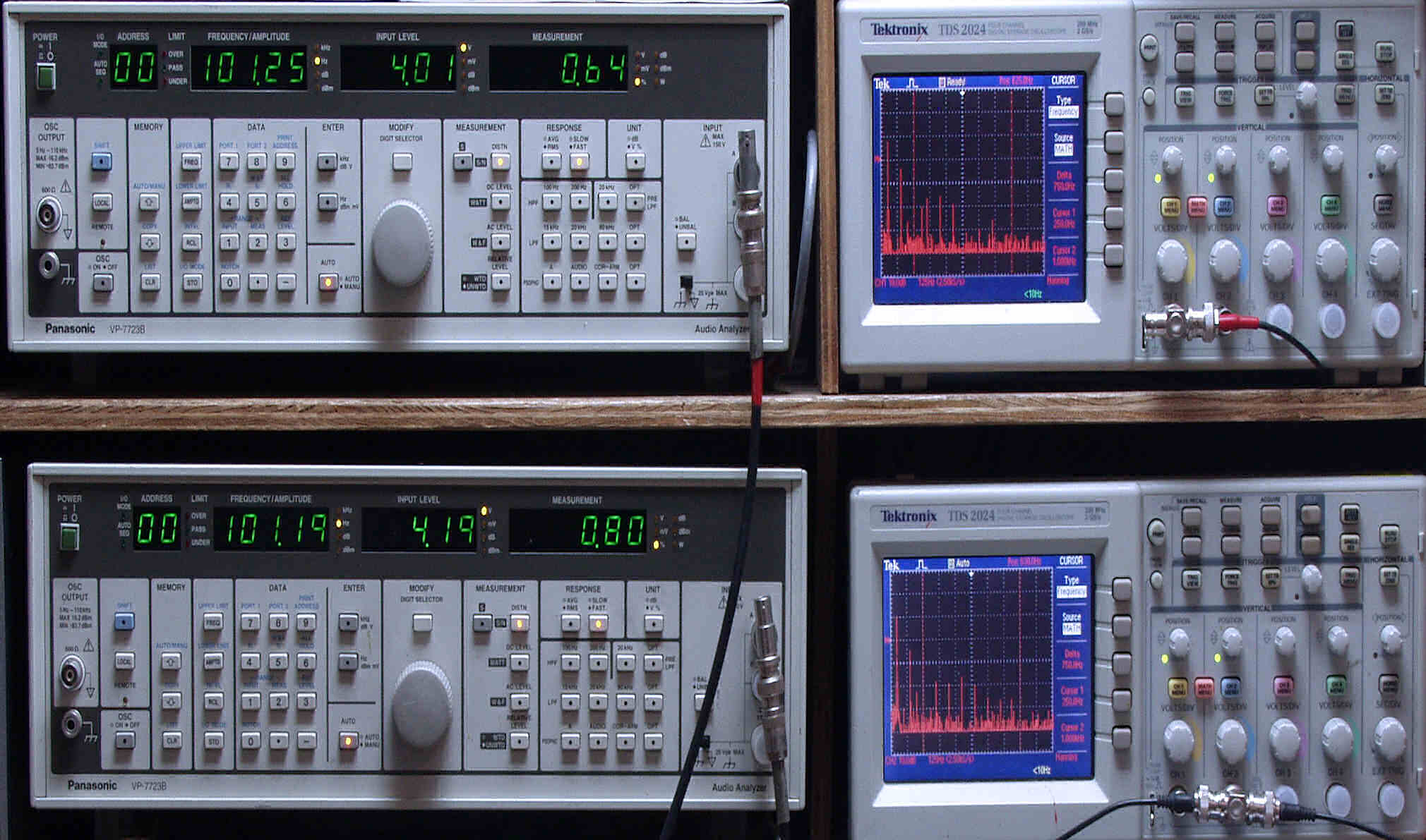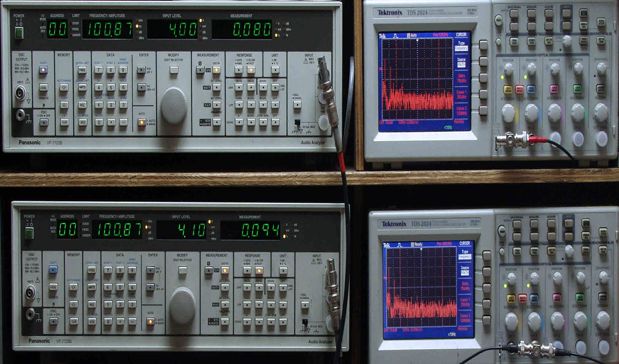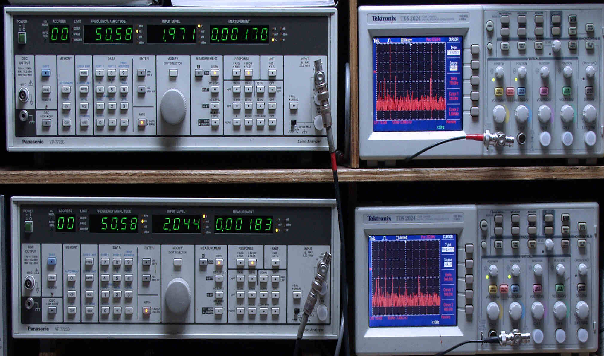 上段中左 歪み率計=出力の歪み率測定。 左メータ=L出力、右メータ=R出力。