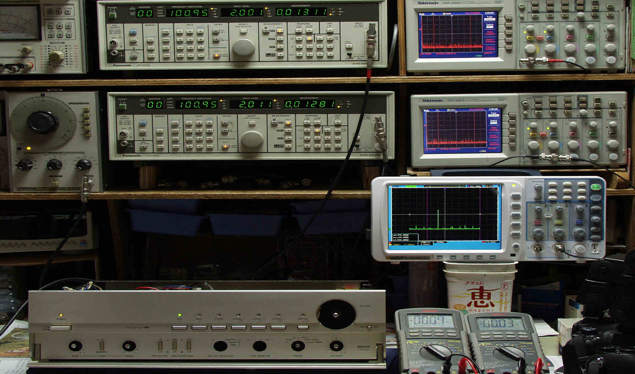 下段中右上 デジタル電圧計=R出力電圧測定。 下段中右下 デジタル電圧計=L出力電圧測定。