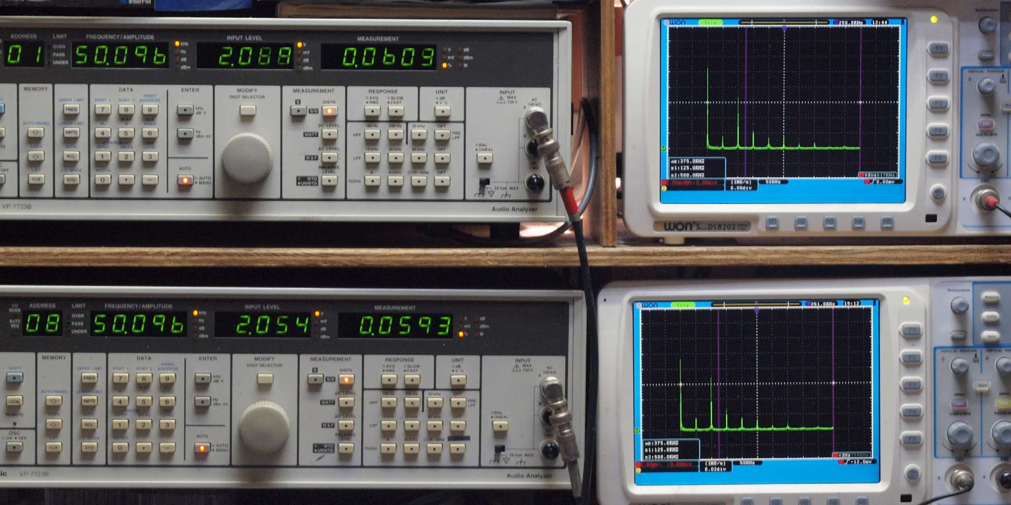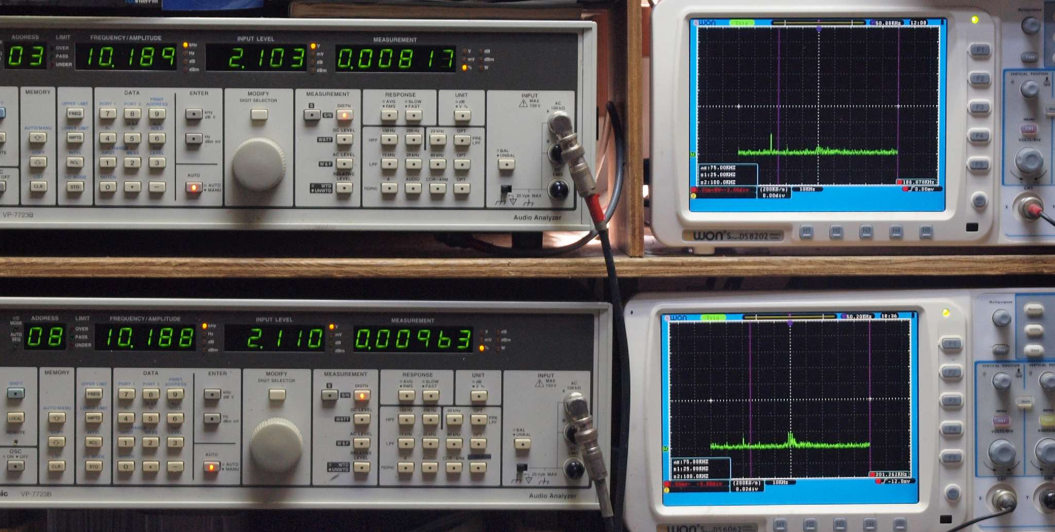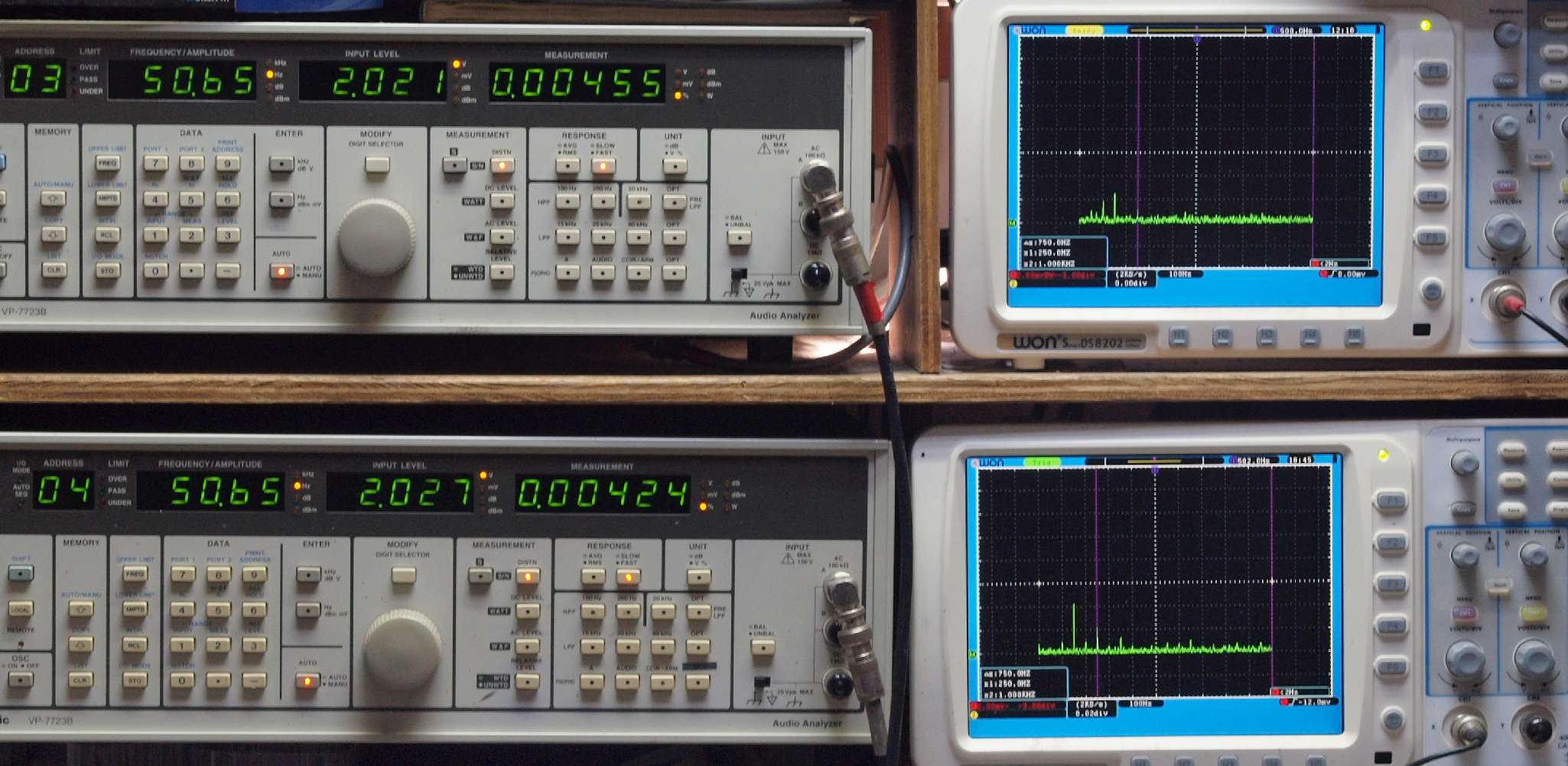 | E. 調整・測定。 画像をクリックすると、大きく(横幅2050ドット)表示されます。 E0. 出力・歪み率測定・調整。 「見方」。 上段中 右側SP出力を「Audio Analyzer Panasonic VP−7723B」により測定。 表示LED、 左端=メモリーNo、 中左=周波数測定、 中右=出力電圧測定、 右端=歪み率測定。 上段右端 VP−7723Bの基本波除去出力を「owon SDS8202(200MHZ)」で「FFT分析」表示。 下段中 左側SP出力を「Audio Analyzer Panasonic VP−7723B」により測定。 表示LED、 左端=メモリーNo、 中左=周波数測定、 中右=出力電圧測定、 右端=歪み率測定。 下段右端 VP−7723Bの基本波除去出力を「owon SDS6062(200MHZ)」で「FFT分析」表示。 下段左端 オーディオ発振器 VP−7201A より50Hz〜100kHzの信号を出し(歪み率=約0.003%)、ATT+分配器を通し、AMPに入力。 よって、ダイアル設定出力レベルより低くなります。測定機器の仕様や整備の様子はこちら、「VP−7723B」「VP−7201A」。 FFT画面の見方はこちら。 |