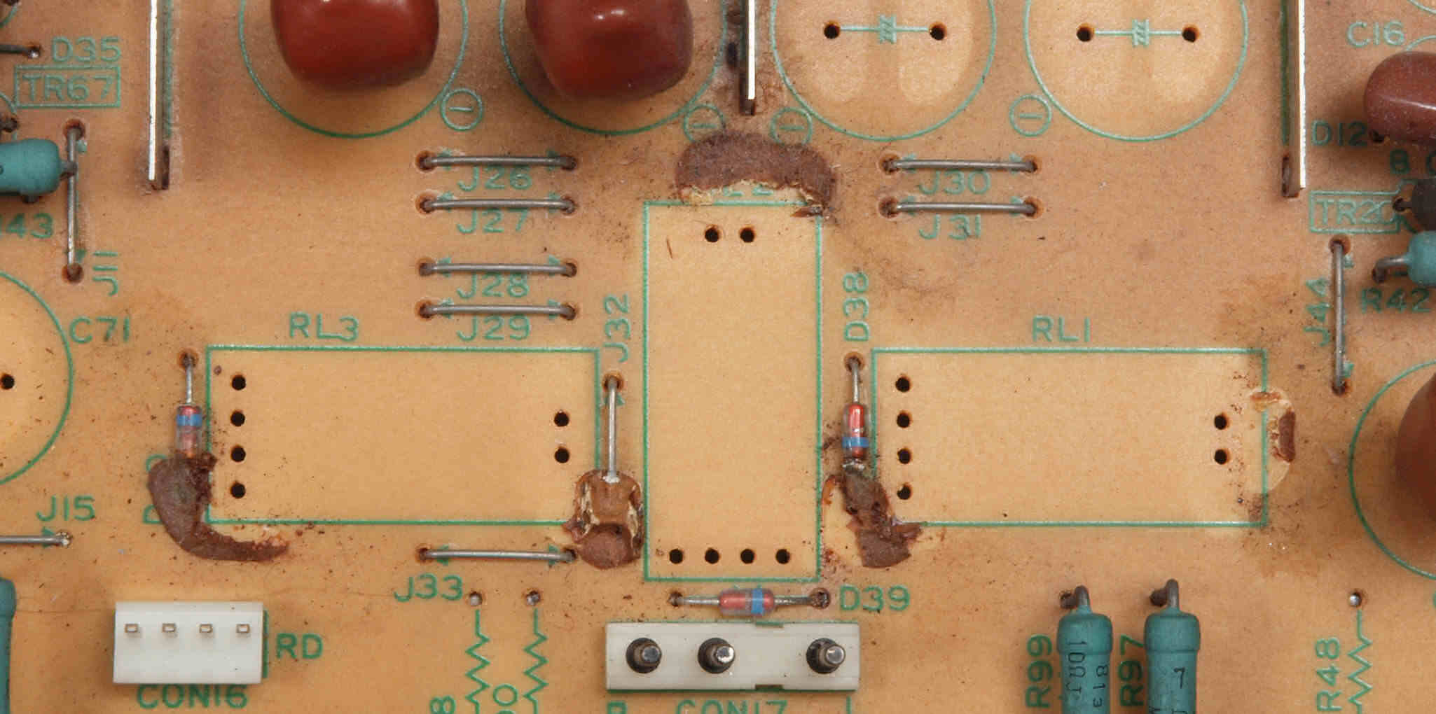 | C213. 修理中 EQ−AMP。 トルエン溶媒の接着剤。錫メッキジャンパー線が腐食している。 | ||||||||||||||||||||||||||||||||||||||||||||||||||||||||