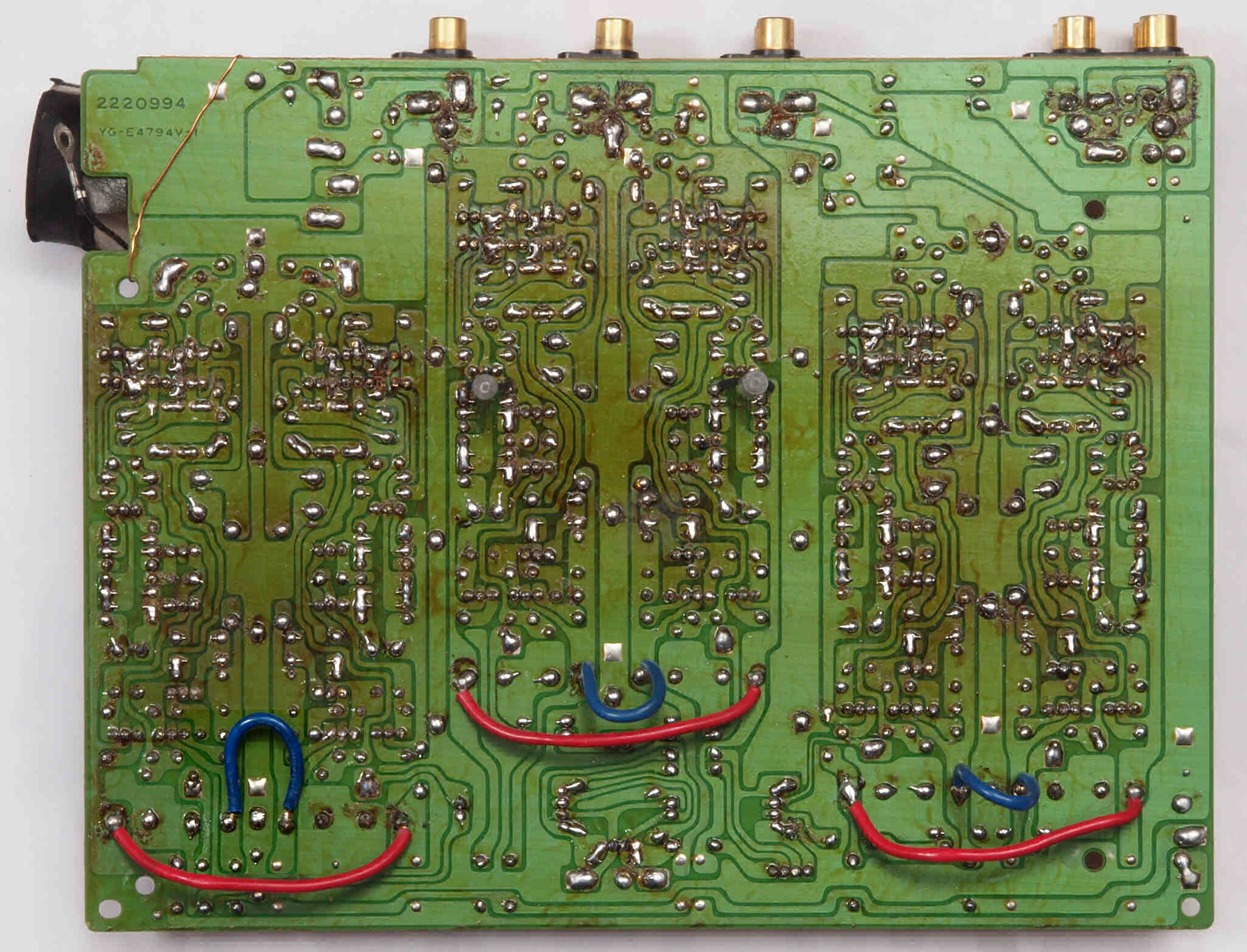 | C112. 修理中 EQ−HEAD-AMP基板。 トルエン溶媒の接着剤。錫メッキジャンパー線とダイオード2本が腐食している。 | ||||||||||||||||||||||||||||||||||||||||||||||||||||||||
