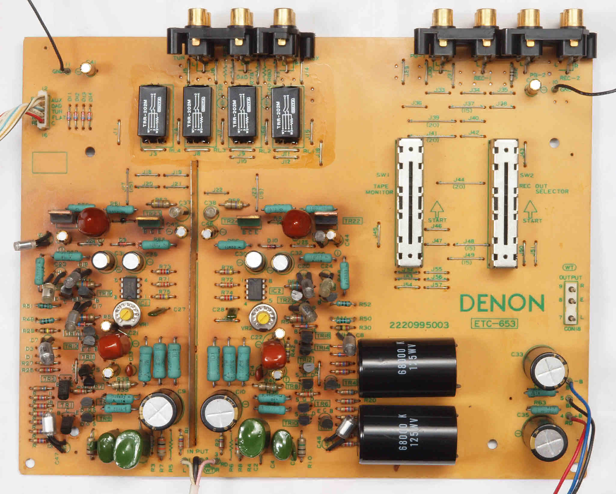 | C11. 修理前 EQ−HEAD-AMP基板。 左=MM、中=MC、右=トランス使用MC。 上右端がMC−トランス。 | ||||||||||||||||||||||||||||||||||||||||||||||||||||||||