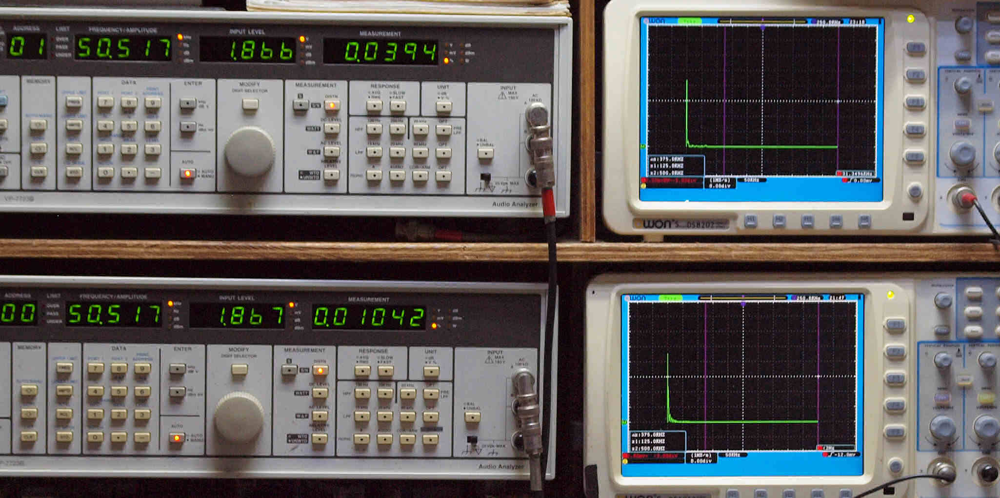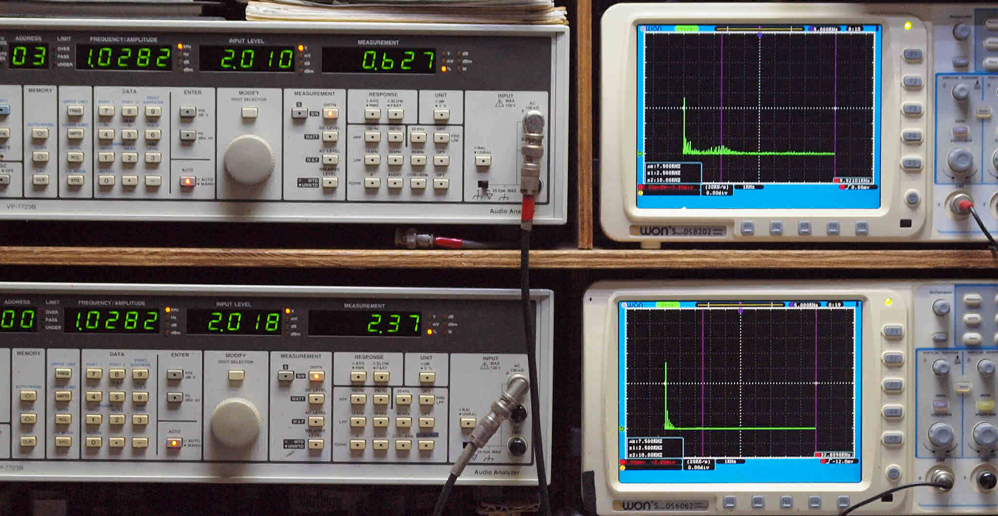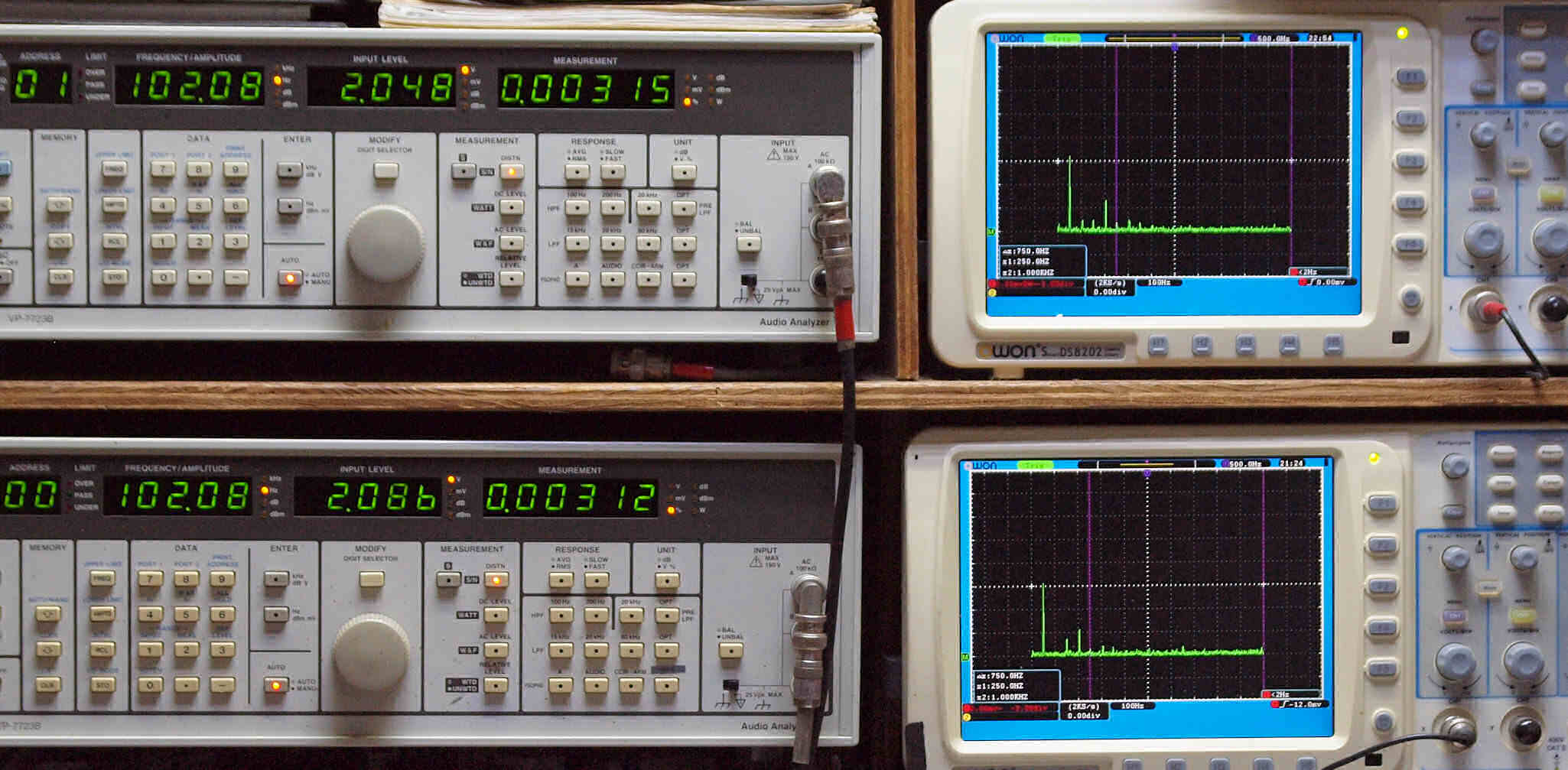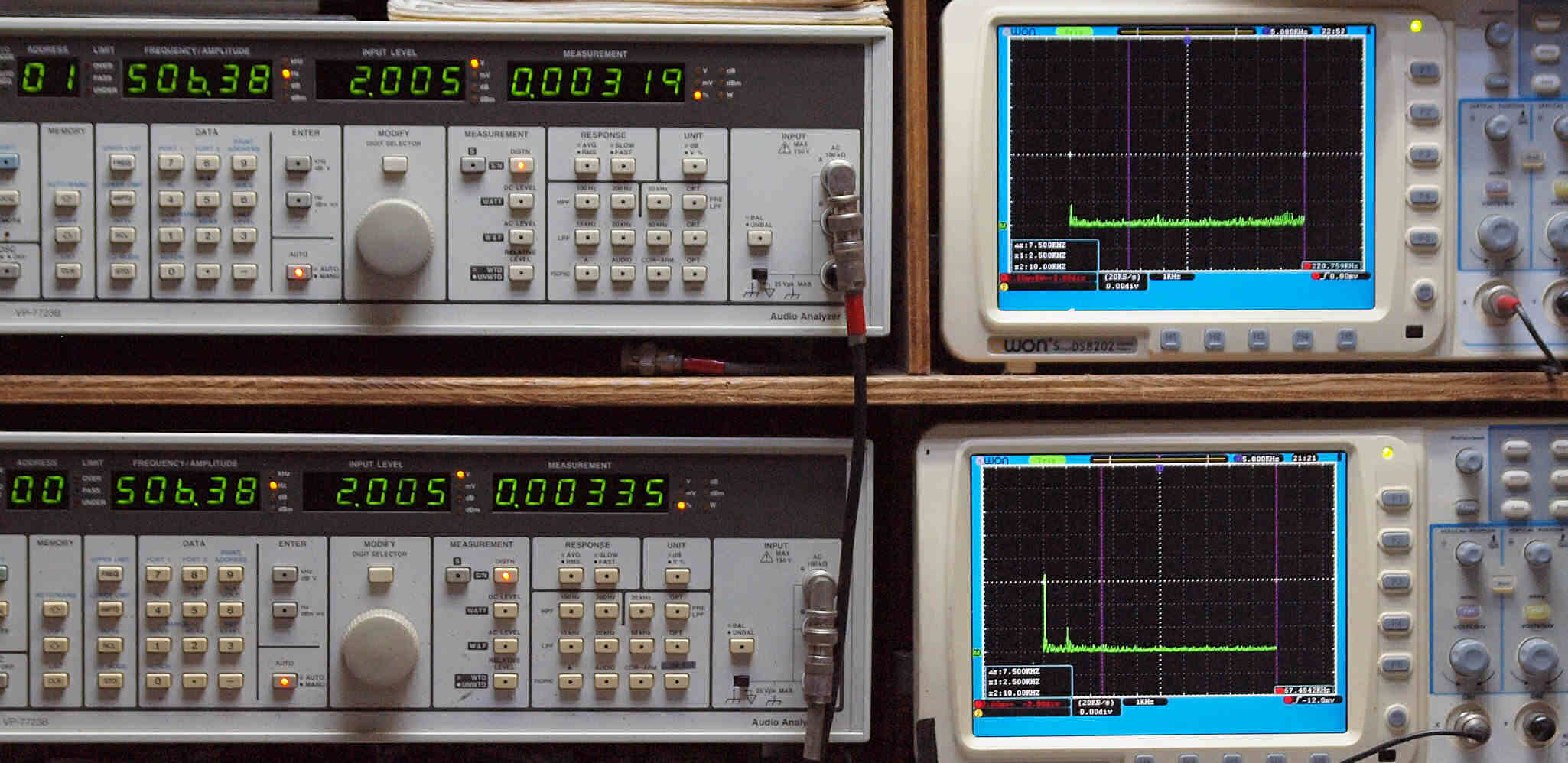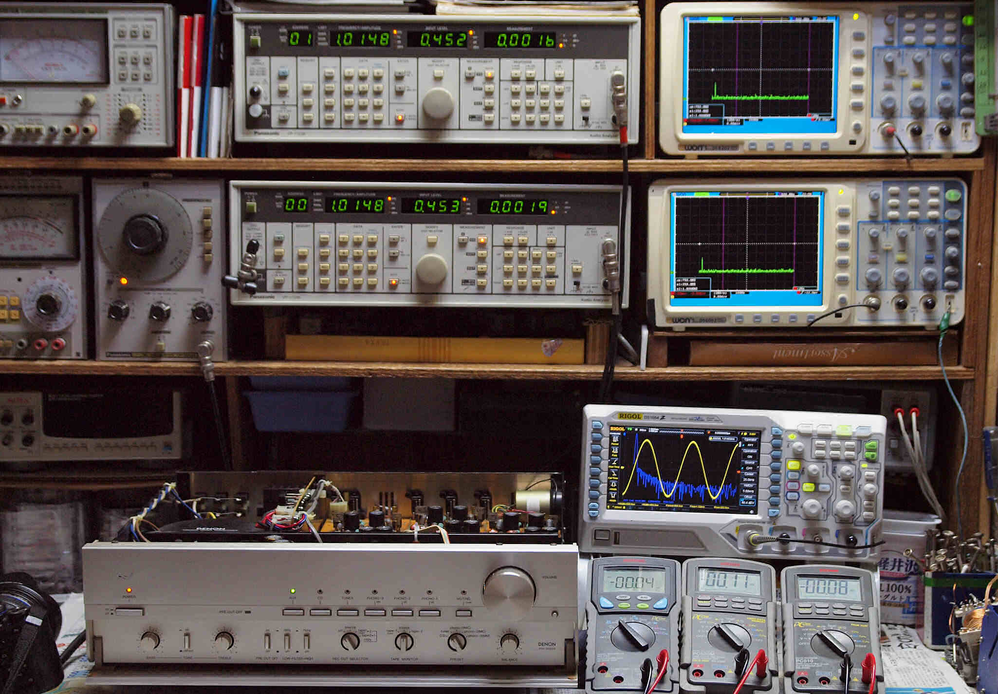| E. 調整・測定。 画像をクリックすると、大きく(横幅2050ドット)表示されます。 E0. 出力・歪み率測定・調整。 「見方」。 上段中 右側SP出力を「Audio Analyzer Panasonic VP−7723B」により測定。 表示LED、 左端=メモリーNo、 中左=周波数測定、 中右=出力電圧測定、 右端=歪み率測定。 上段右端 VP−7723Bの基本波除去出力を「owon SDS8202(200MHZ)」で「FFT分析」表示。 下段中 左側SP出力を「Audio Analyzer Panasonic VP−7723B」により測定。 表示LED、 左端=メモリーNo、 中左=周波数測定、 中右=出力電圧測定、 右端=歪み率測定。 下段右端 VP−7723Bの基本波除去出力を「owon SDS6062(200MHZ)」で「FFT分析」表示。 下段左端 オーディオ発振器 VP−7201A より50Hz〜100kHzの信号を出し(歪み率=約0.003%)、ATT+分配器を通し、AMPに入力。 よって、ダイアル設定出力レベルより低くなります。測定機器の仕様や整備の様子はこちら、「VP−7723B」「VP−7201A」。 FFT画面の見方はこちら。 |