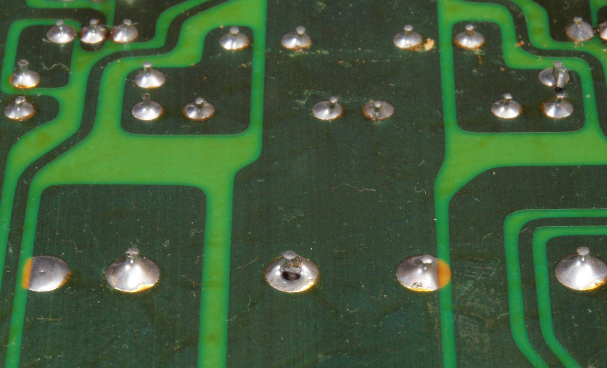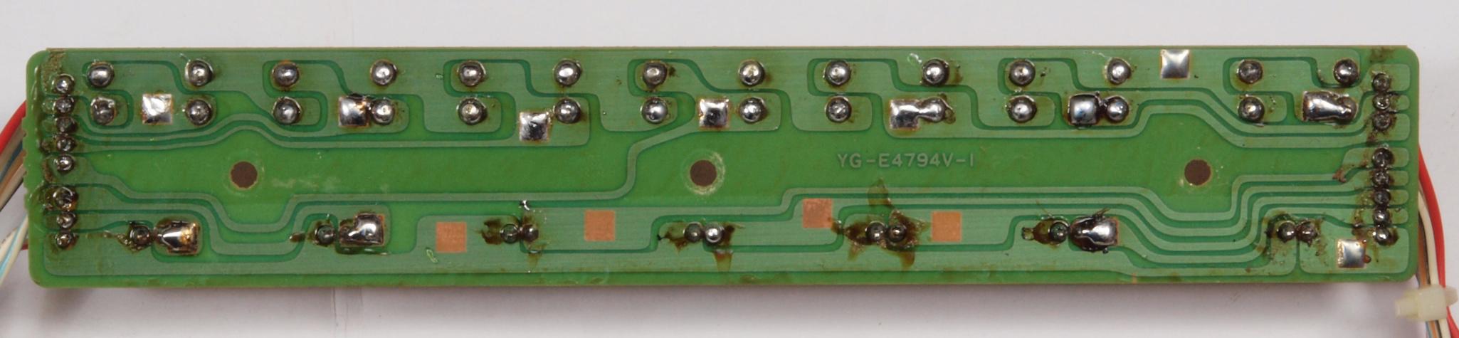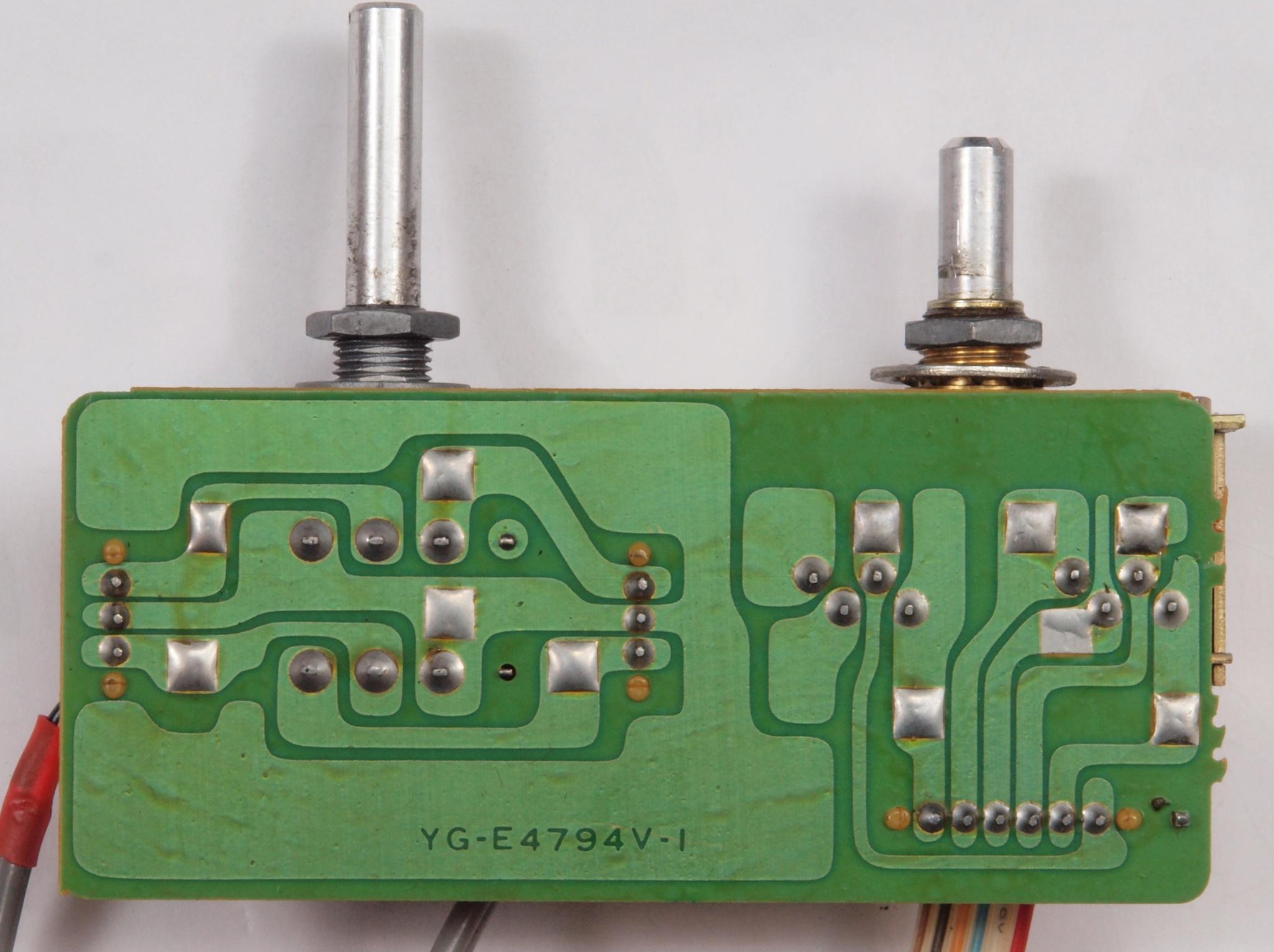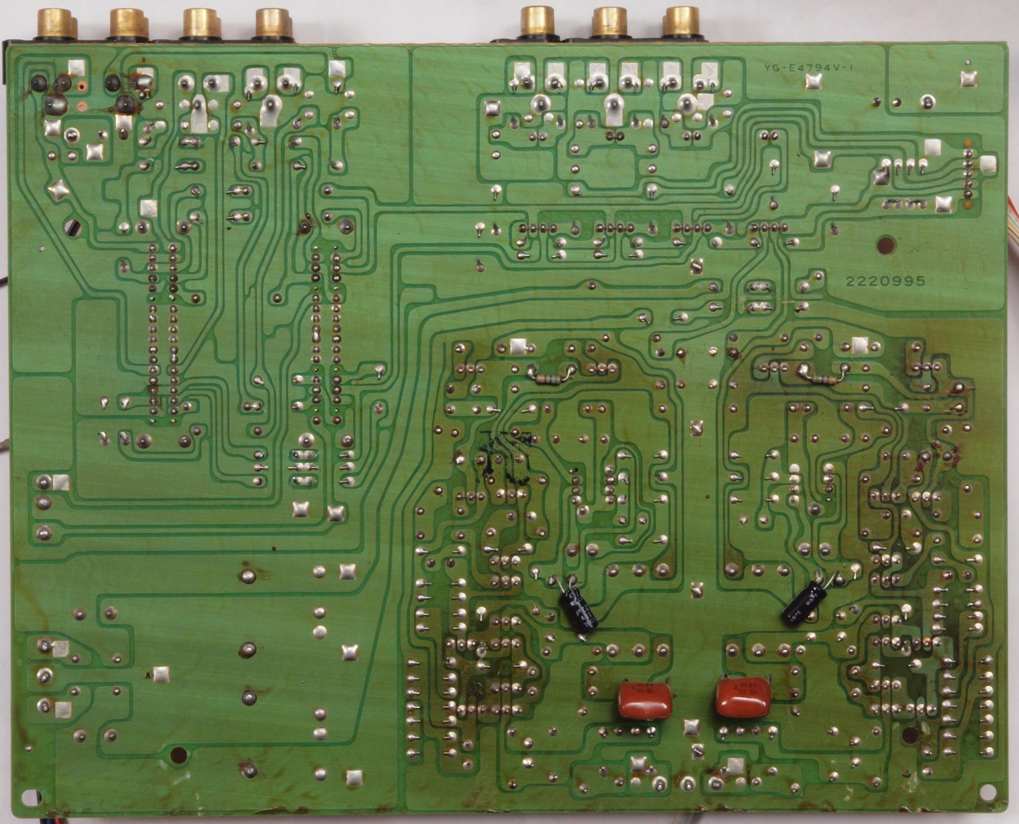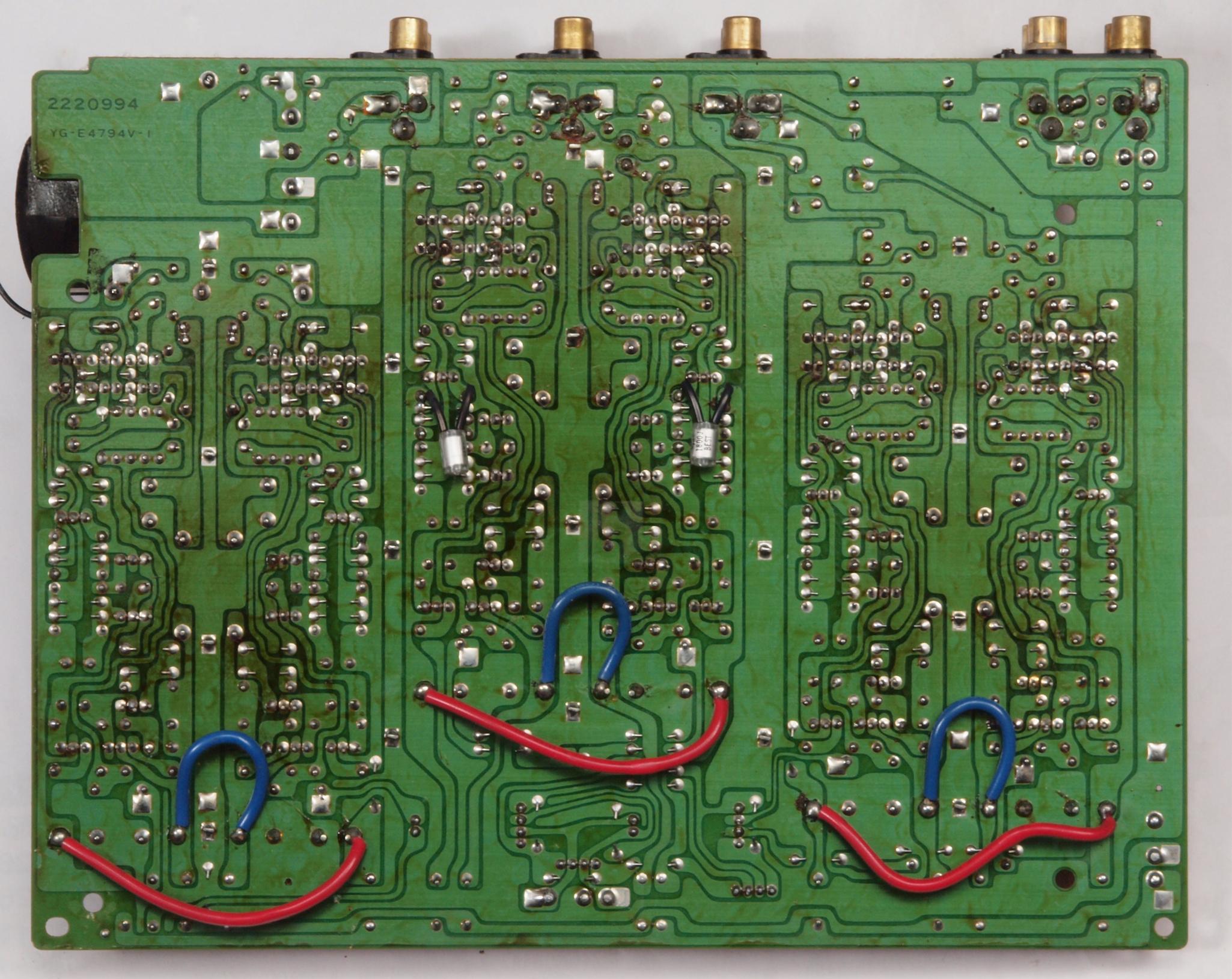 C212. 修理中 EQ−AMP基板。 トルエン溶媒の接着剤。錫メッキジャンパー線が腐食している。