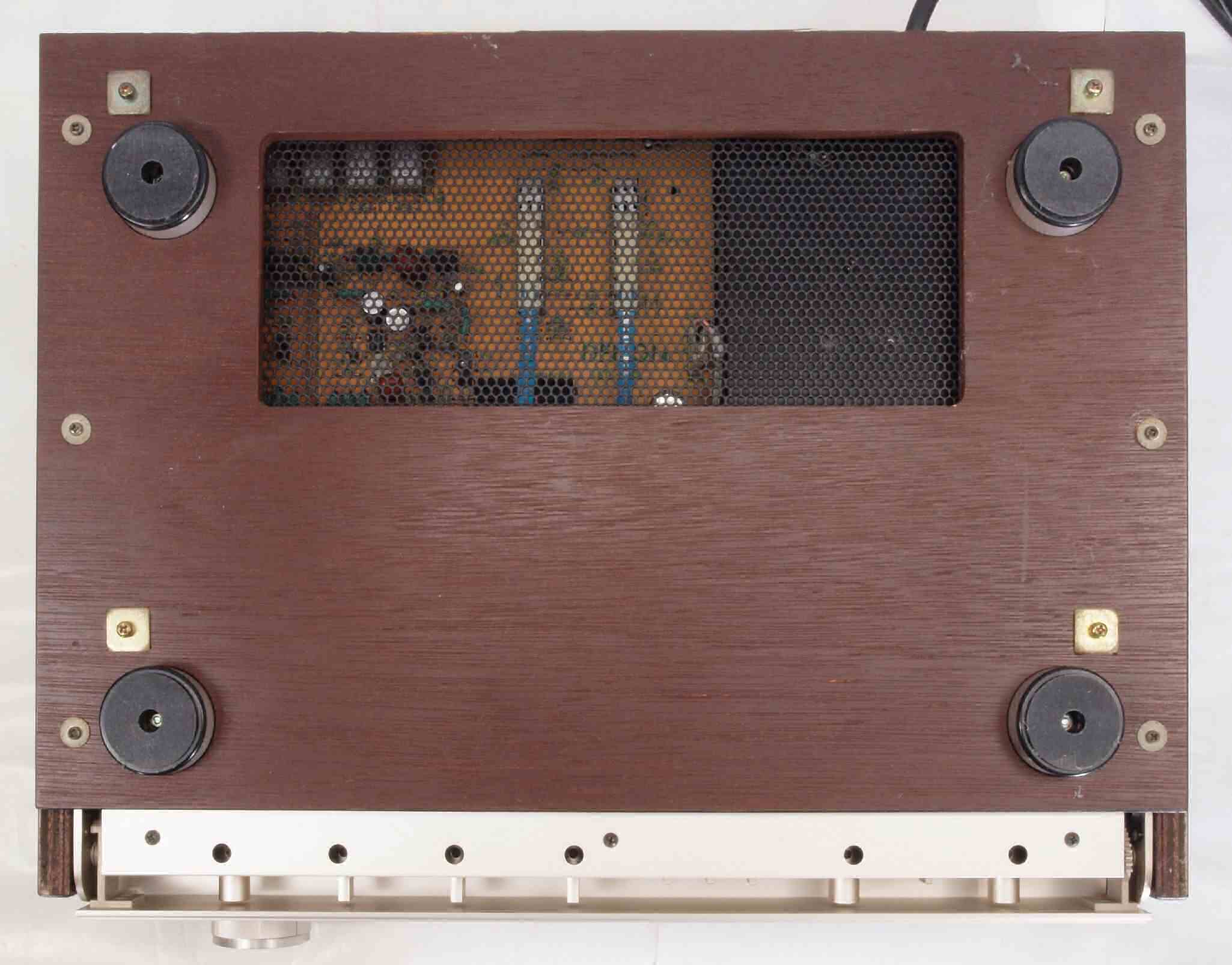 A43. 木ケースを取り、下から見る。 EQアンプの電解コンデンサー頭のビニールが剥けている。