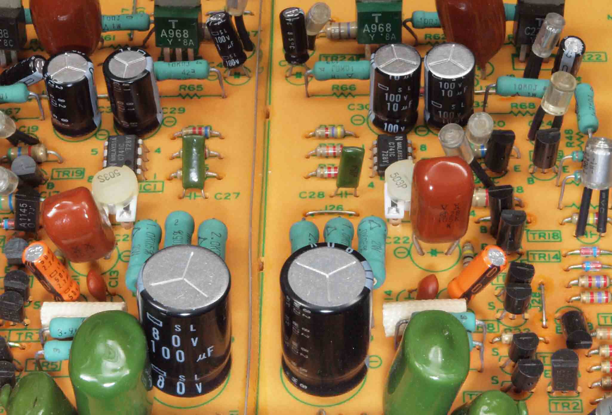 A24. 点検中 木ケースを取り、上から見る。ヘッドAMPのの電解コンデンサー頭のビニールが剥けている。
