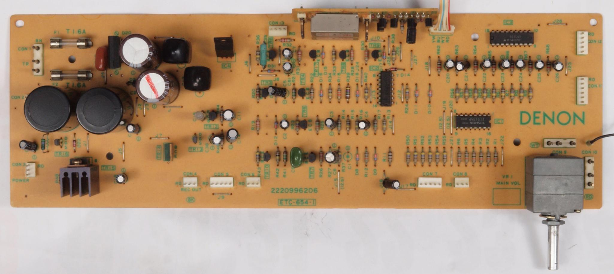 C213. 修理中 EQ−AMP基板。  トルエン溶媒の接着剤を取り去り、ジャンパー線を交換後、コート液を塗布後。