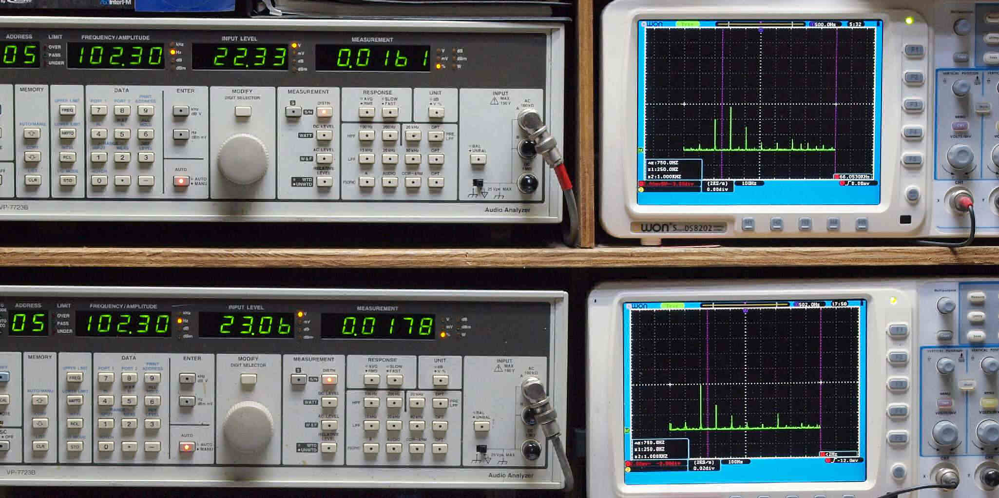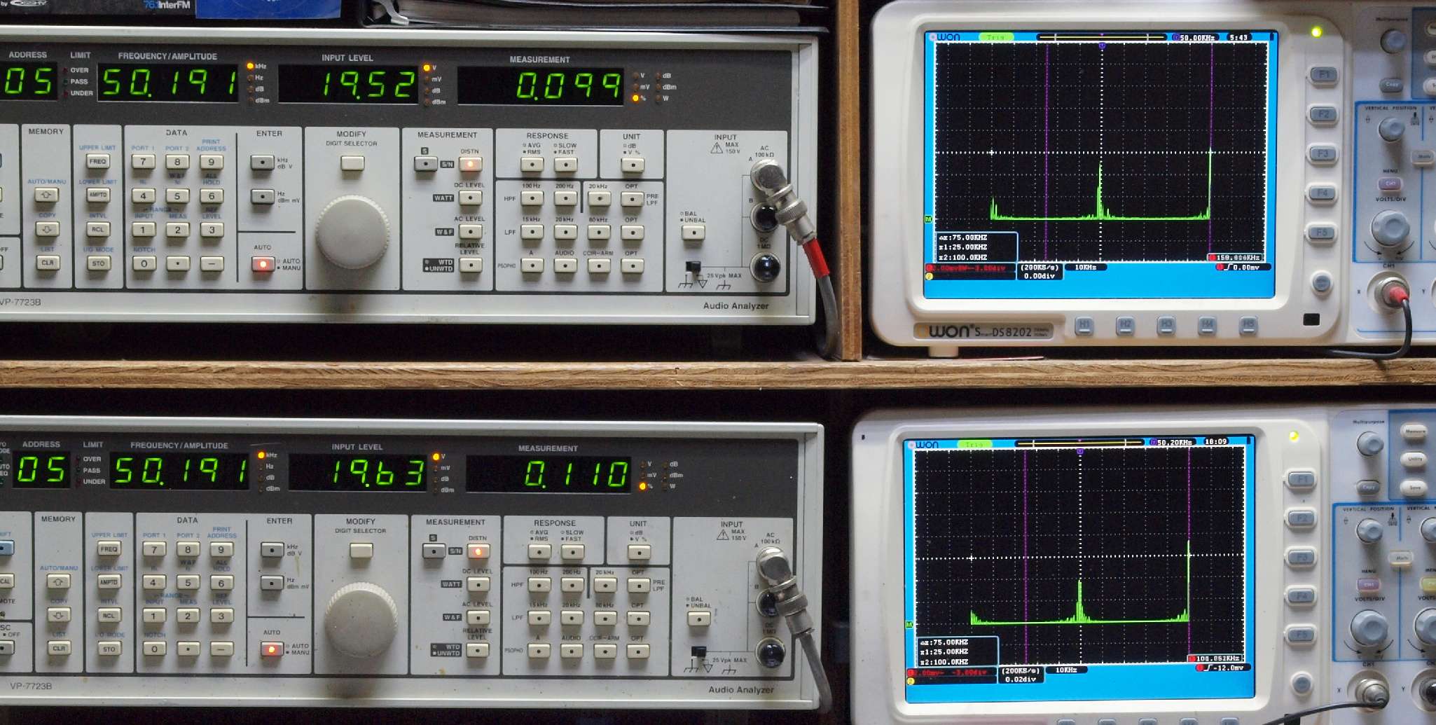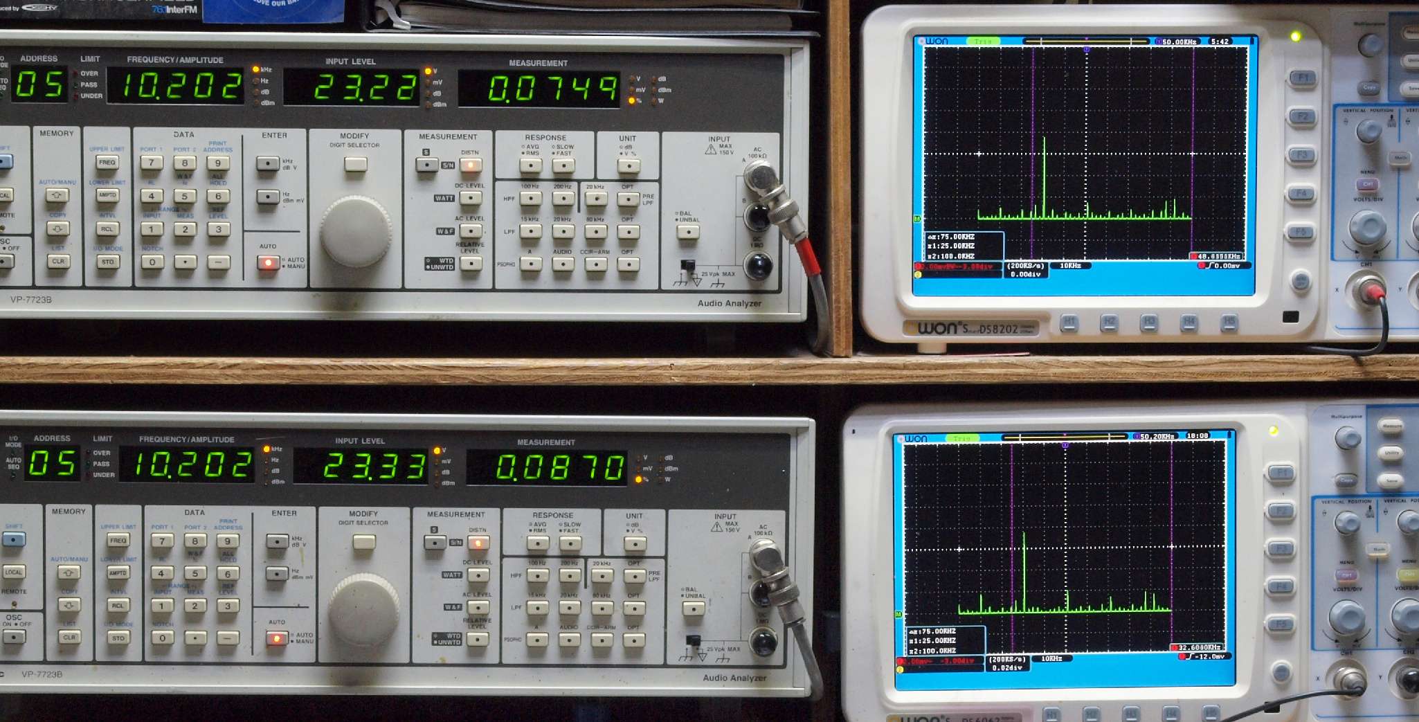 | E. 測定・調整。 画像をクリックすると、大きく(横幅2050ドット)表示されます。 E0. 出力・歪み率測定・調整。 電源はAC100Vで測定。 「見方」。 上段中 右側SP出力を「Audio Analyzer Panasonic VP−7723B」により測定。 表示LED、 左端=メモリーNo、 中左=周波数測定、 中右=出力電圧測定、 右端=歪み率測定。 上段右端 VP−7723Bの基本波除去出力を「owon SDS8202(200MHZ)」で「FFT分析」表示。 下段中 左側SP出力を「Audio Analyzer Panasonic VP−7723B」により測定。 表示LED、 左端=メモリーNo、 中左=周波数測定、 中右=出力電圧測定、 右端=歪み率測定。 下段右端 VP−7723Bの基本波除去出力を「owon SDS6062(200MHZ)」で「FFT分析」表示。 下段左端 オーディオ発振器 VP−7201A より50Hz〜100kHzの信号を出し(歪み率=約0.003%)、ATT+分配器を通し、AMPに入力。 よって、ダイアル設定出力レベルより低くなります。測定機器の仕様や整備の様子はこちら、「VP−7723B」「VP−7201A」。 FFT画面の見方はこちら。 |