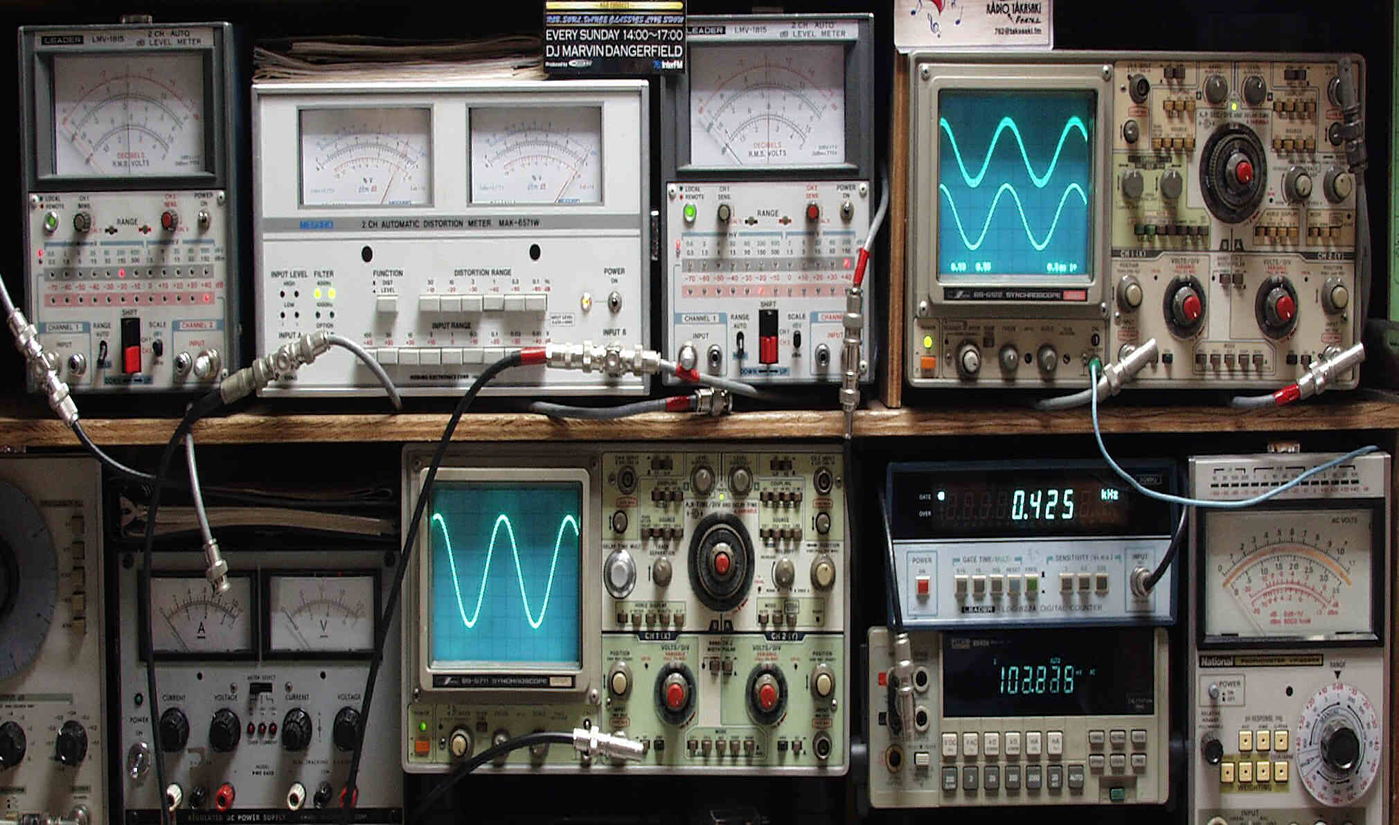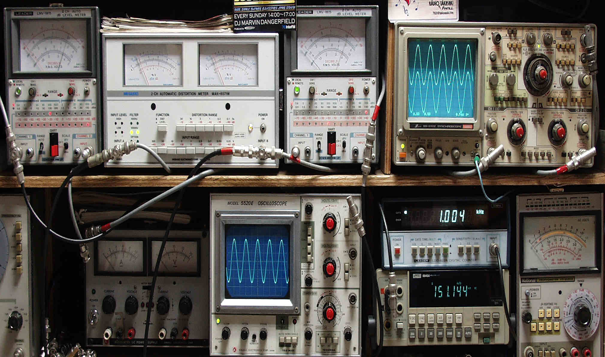 上段中左 歪み率計=出力の歪み率測定 左メータ=L出力、右メータ=R出力