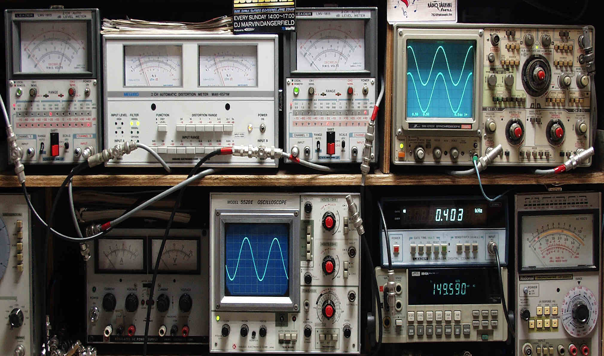 下段左端 オーディオ発振器より400HZ・1KHZの信号を出し(歪み率=約0.003%)これをAMPに入力し、出力を測定