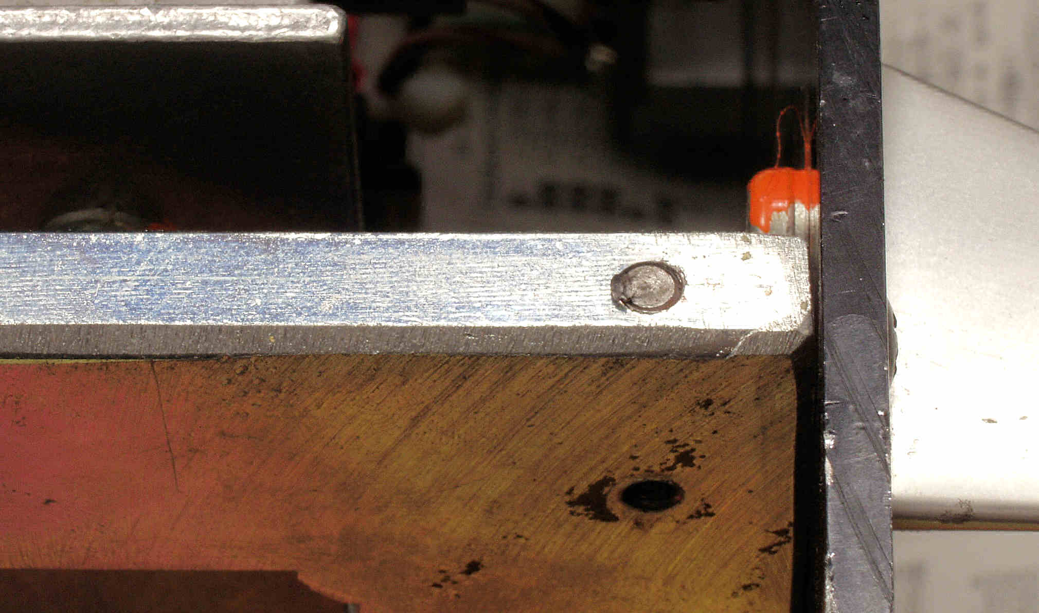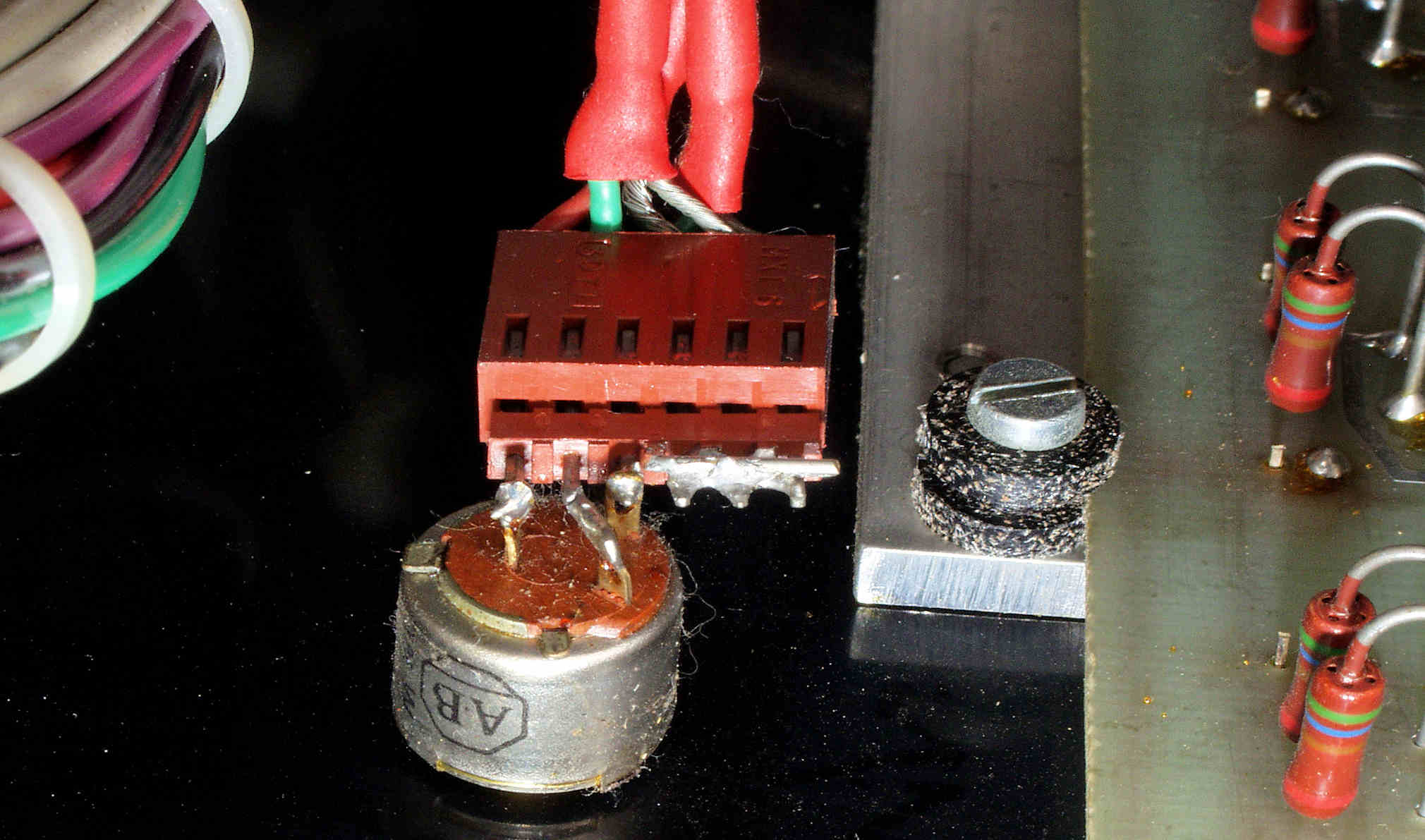 | C153. 修理中 終段+中段TR(トランジスター)基板1裏、 SPへの出力配線がナットの間でショウト寸前、拡大。 | ||||||||||