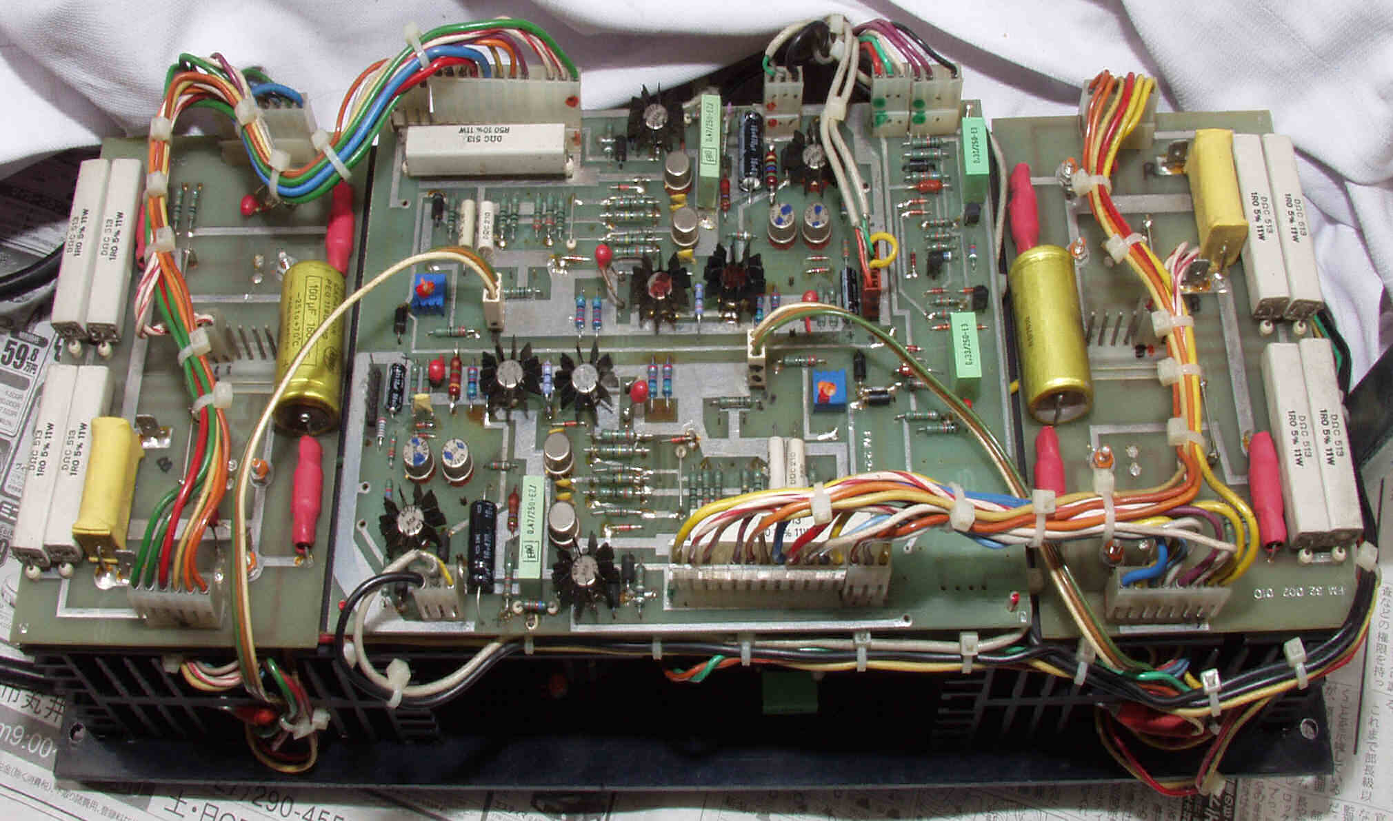 | C2. 修理中 左右終段、真ん中に、SP接続リレー基板。 | ||||||||||